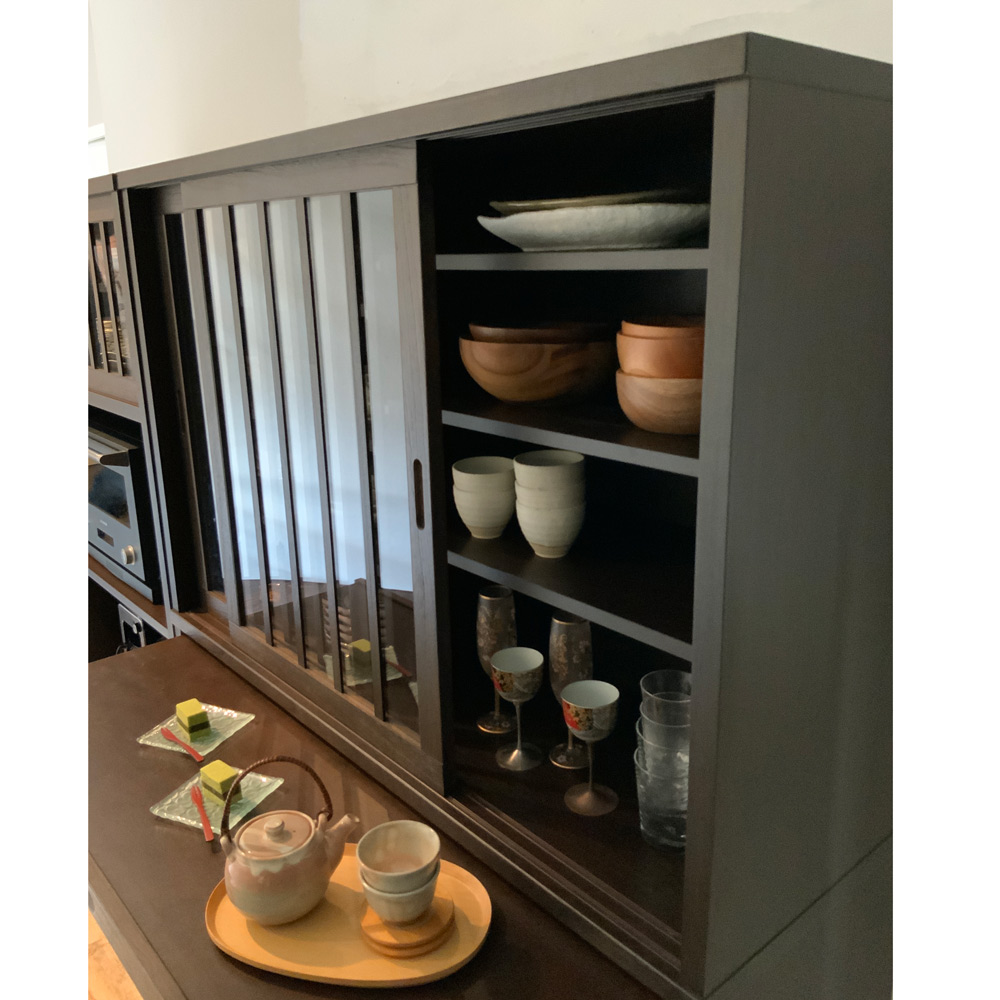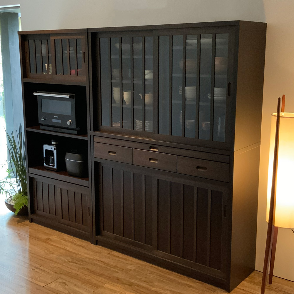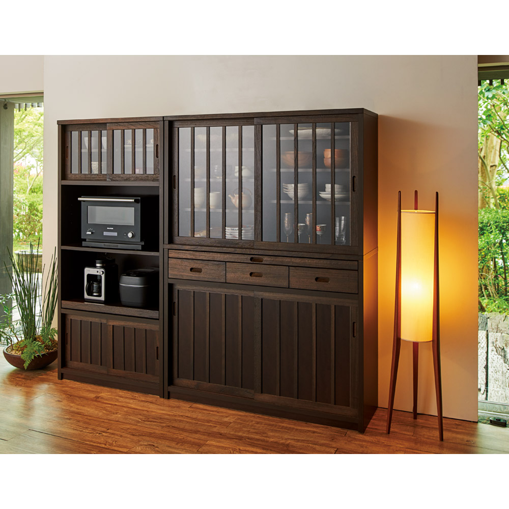 コーディネート例 (ア)ダークブラウン 美しい木目が際立つデザインとワイドな収納力で、憧れの古民家風インテリアが完成します。 ※お届けは写真右のダイニングボード・幅120cmタイプです。