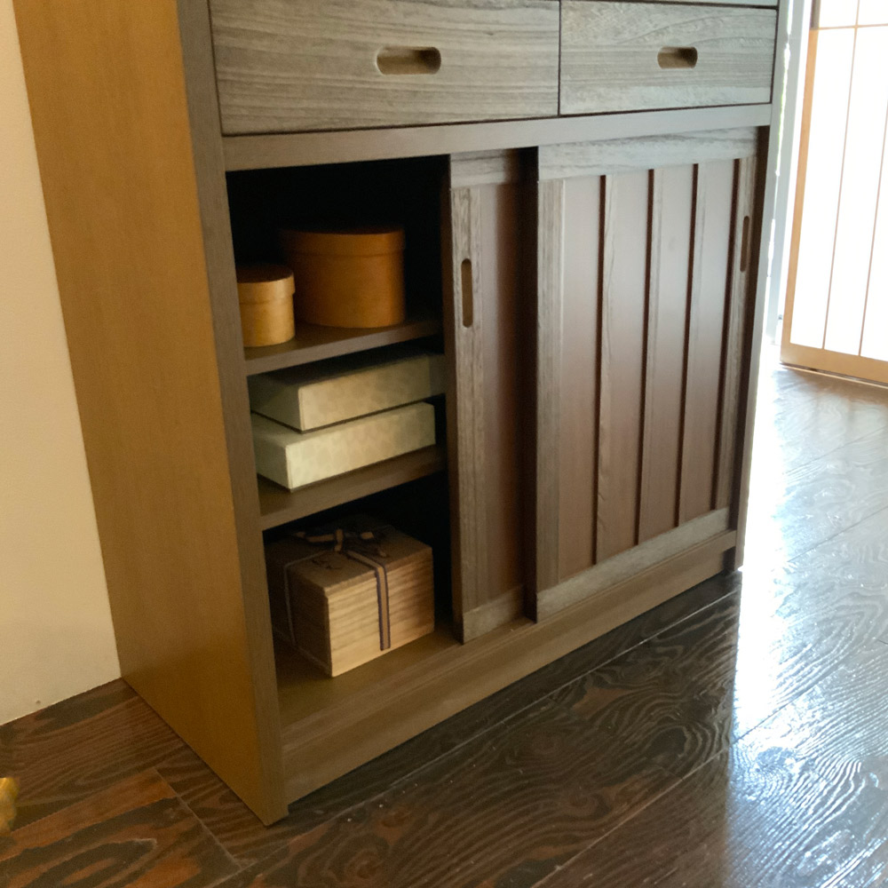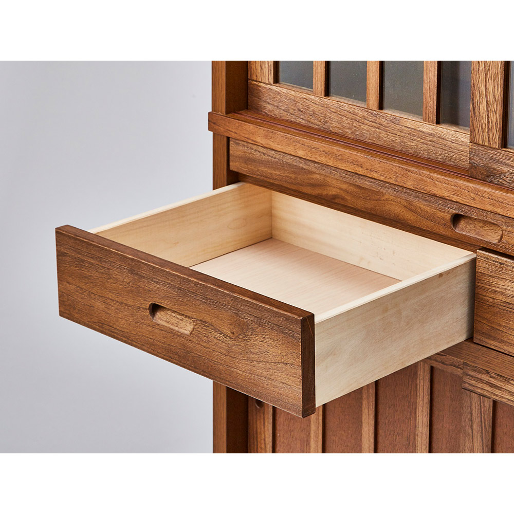 和モダンデザインの美しい木目の質感と格子が際立つ、国産水屋たんすシリーズのダイニングボード。収納力と使い勝手の良さも魅力です。〜立体的な木目の質感と人気の格子デザインがマッチ〜●古民家風デザインがおしゃれな引き戸式食器棚。●格子が美しいガラス扉の収納部は、飾り棚としてもおすすめです。●丈夫な箱組引き出しなど、国産ならではの丁寧なつくりが際立ちます。〜ほどよい高さと使い勝手の良さにもこだわりました〜●収納部は出し入れがしやすく、開閉に場所を取らない引き戸式です。●小物の収納に便利な引き出しが3杯付いています。●盛り付けやちょい置きに便利なスライドテーブル付き。●小柄な方でも最上部に手が届き、圧迫感のないほどよい高さ170cm。●幅120cmのワイドタイプで、収納力も十分です。〜暮らしに合わせて選べる7タイプ〜●幅、高さ、使用方法などに合わせて選べる7タイプをご用意しました。●古美術や本、CDなどのコレクションを上品に飾ることもできます。●憧れの古民家テイストを取り入れた、素敵なお部屋ができあがります。桐 うづくり仕上げ木の表面を磨きながら削ぎ落として木目に凹凸を付け、年輪が浮き上がった美しい表情に仕上げます。