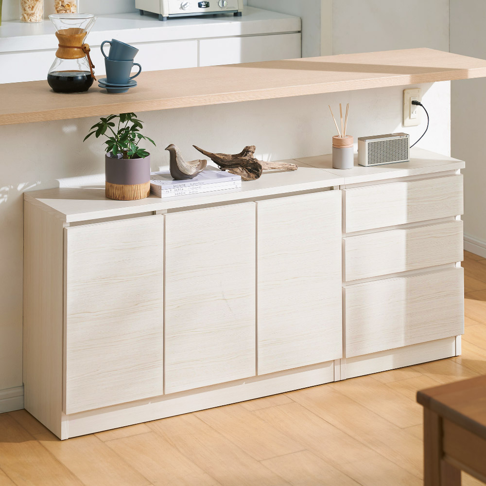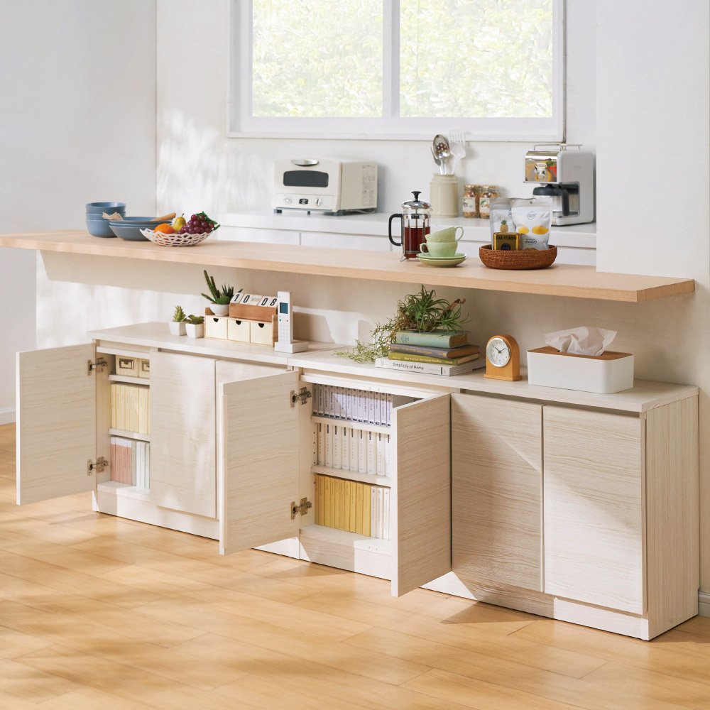 コーディネート例(ア)ホワイト(木目) 家電やティッシュ置き場としてカウンター天板下を有効活用。 ※左から幅90cm・3枚扉、幅120cm・4枚扉