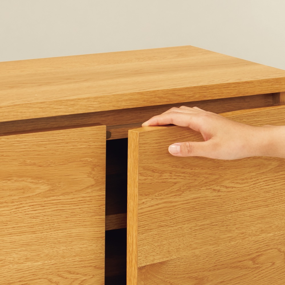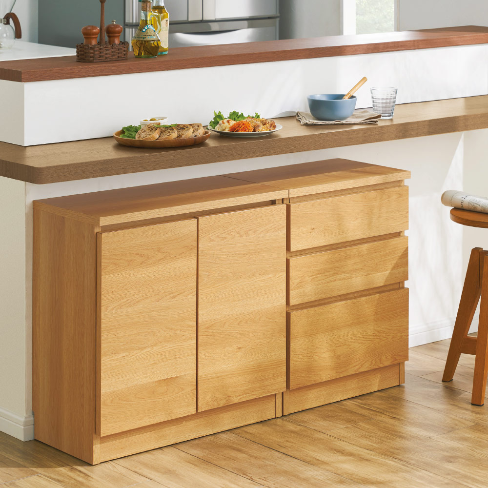 コーディネート例(イ)ナチュラル 高さ60.5cmの低めサイズなので、窓下にも圧迫感が少なくコンパクトに置けます。 ※左から幅45cm・引き出し、幅120cm・4枚扉