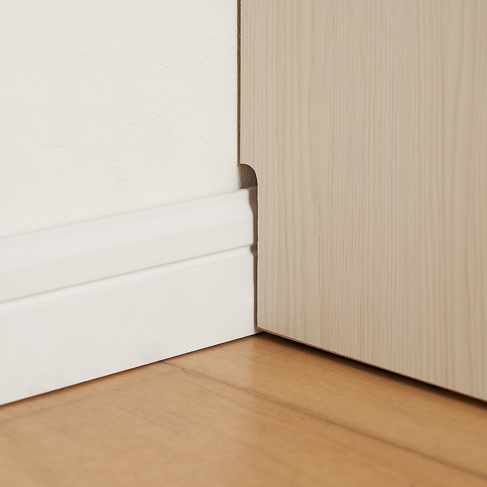 コーディネート例(ア)ホワイト(木目) 低めの高さなので、コンセントやカウンター天板下の金具も避けられます。 ※写真は幅90cm・3枚扉、幅45cm・引き出し