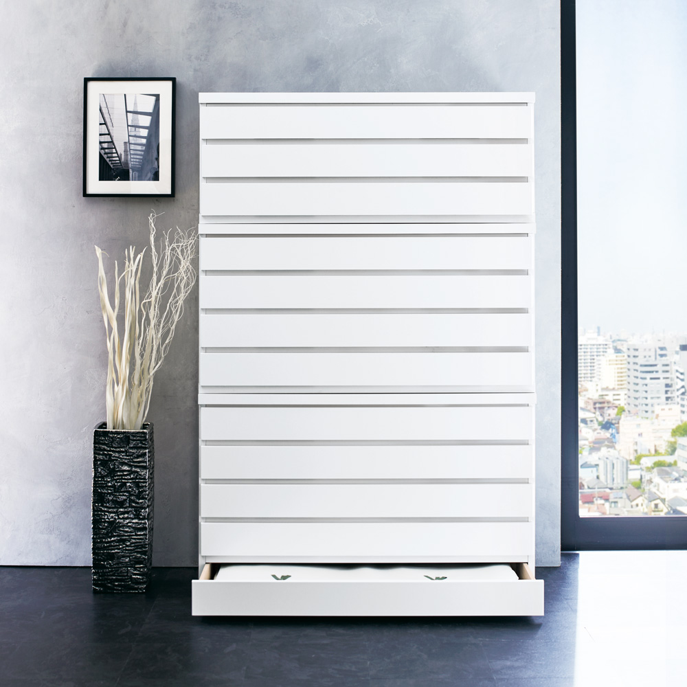 現代の住まいに調和するモダンなチェストに、着物を大切に収納するという伝統的な機能をプラス。着物と暮らす楽しみが、さらに広がるチェストシリーズです。洋室に置いてもしっくりなじむ、シンプルモダンな表情の着物収納●和室がない、着物箪笥を置くとインテリアにそぐわない、という着物収納のお悩みを解決。●着物に直接ふれる引き出し内側は、やわらかな木肌を生かした生地仕上げの桐天然木を使用。●桐材の調湿効果により収納部を一定の湿度に保ち、大切な着物を守りながら収納できます。●シルクやカシミヤなどデリケートな洋服もやさしく収納できます。●特大サイズのたとう紙(87cm)も折らずに入る引き出し内寸幅93cm。●お手持ちの着物コレクションに合わせて、3段や5段と重ねても使用できます。●引き出し内寸高さ6cm。着物以外にも、重ね置きするとシワが気になる薄手の洋服の収納にもおすすめです。●単品でご使用になる場合は、天板を飾り台としてもお使いいただけます。収納したい着物や洋服の量に合わせて、自分にぴったりのチェストにカスタマイズできます●着物収納タイプは3台まで重ねて使用できます。●シリーズ商品の衣類収納タイプと重ねての使用も可能。着物も洋服もまとめて収納できます。(衣類収納タイプは下段のみで、中段・上段には使用できません)●洋の小物を和の着物に合わせるなど、まとめて収納できるので自由なコーディネートを楽しみたい方にもぴったりのチェストシリーズです。●重ねて使用の際は、上下連結用金具で裏側からしっかり固定できます。外からは見えない内側にこそ、こだわりと贅沢を。伝統的な桐箪笥の良さを受け継ぐ仕様です●着物収納に適した木材として古くから愛され、高級箪笥にも使われることが多い桐天然木を、引き出し内側に使いました。●桐材は調湿効果があり、全体が呼吸しているので収納部を一定の湿度に保つと言われています。●湿気が多いと膨張して外からの湿気を防ぎ、空気が乾燥すると湿気を発散して収縮します。●桐にはタンニン等が多く含まれているため、害虫を寄せつけにくい特長があります。丹精こめて作られた国産家具です●国内工場で丁寧に作られた日本製です。●完成品でお届けするので、届いたらすぐにお使いいただけます。