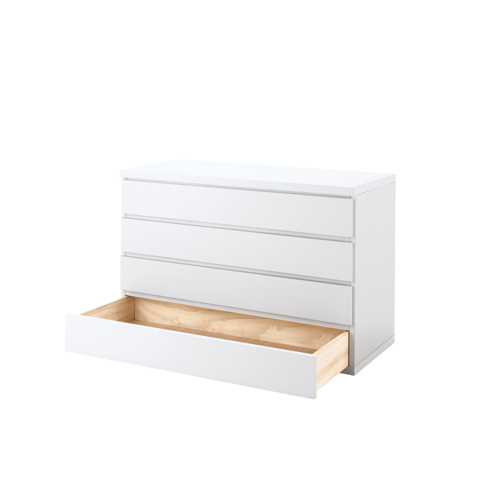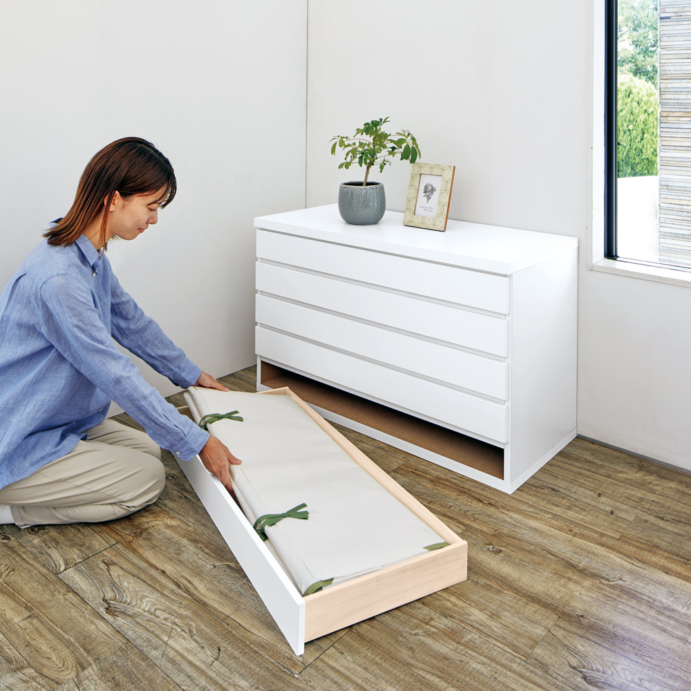 現代の住まいに調和するモダンなチェストに、着物を大切に収納するという伝統的な機能をプラス。着物と暮らす楽しみが、さらに広がるチェストシリーズです。洋室に置いてもしっくりなじむ、シンプルモダンな表情の着物収納●和室がない、着物箪笥を置くとインテリアにそぐわない、という着物収納のお悩みを解決。●着物に直接ふれる引き出し内側は、やわらかな木肌を生かした生地仕上げの桐天然木を使用。●桐材の調湿効果により収納部を一定の湿度に保ち、大切な着物を守りながら収納できます。●シルクやカシミヤなどデリケートな洋服もやさしく収納できます。●特大サイズのたとう紙(87cm)も折らずに入る引き出し内寸幅93cm。●お手持ちの着物コレクションに合わせて、3段や4段と重ねても使用できます。●引き出し内寸高さ6cm。着物以外にも、重ね置きするとシワが気になる薄手の洋服の収納にもおすすめです。●単品でご使用になる場合は、天板を飾り台としてもお使いいただけます。収納したい着物や洋服の量に合わせて、自分にぴったりのチェストにカスタマイズできます●着物収納タイプは3台まで重ねて使用できます。●シリーズ商品の衣類収納タイプと重ねての使用も可能。着物も洋服もまとめて収納できます。(衣類収納タイプは下段のみで、中段・上段には使用できません)●洋の小物を和の着物に合わせるなど、まとめて収納できるので自由なコーディネートを楽しみたい方にもぴったりのチェストシリーズです。●重ねて使用の際は、上下連結用金具で裏側からしっかり固定できます。外からは見えない内側にこそ、こだわりと贅沢を。伝統的な桐箪笥の良さを受け継ぐ仕様です●着物収納に適した木材として古くから愛され、高級箪笥にも使われることが多い桐天然木を、引き出し内側に使いました。●桐材は調湿効果があり、全体が呼吸しているので収納部を一定の湿度に保つと言われています。●湿気が多いと膨張して外からの湿気を防ぎ、空気が乾燥すると湿気を発散して収縮します。●桐にはタンニン等が多く含まれているため、害虫を寄せつけにくい特長があります。丹精こめて作られた国産家具です●国内工場で丁寧に作られた日本製です。●完成品でお届けするので、届いたらすぐにお使いいただけます。