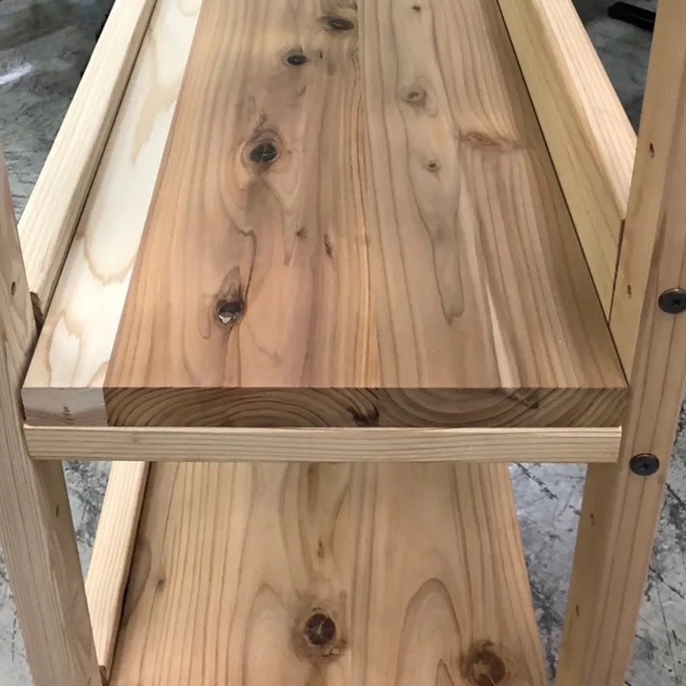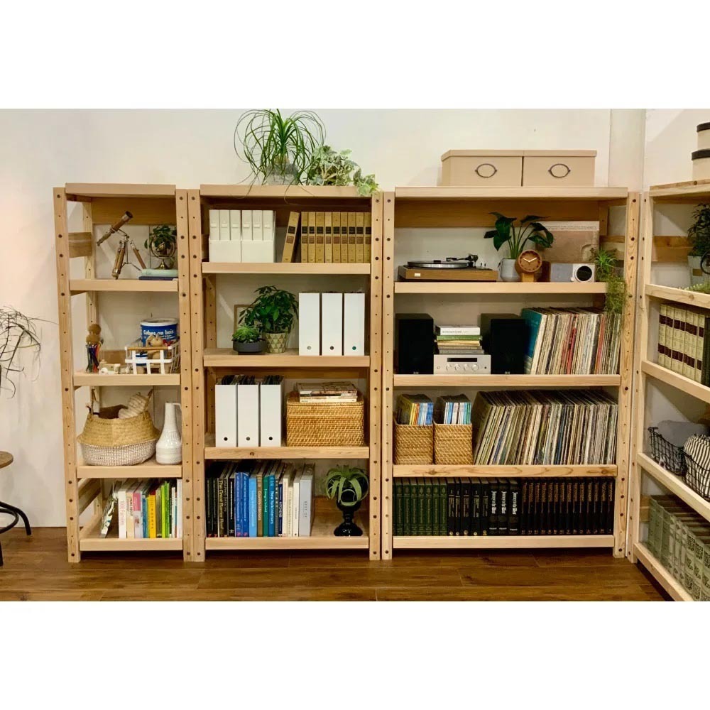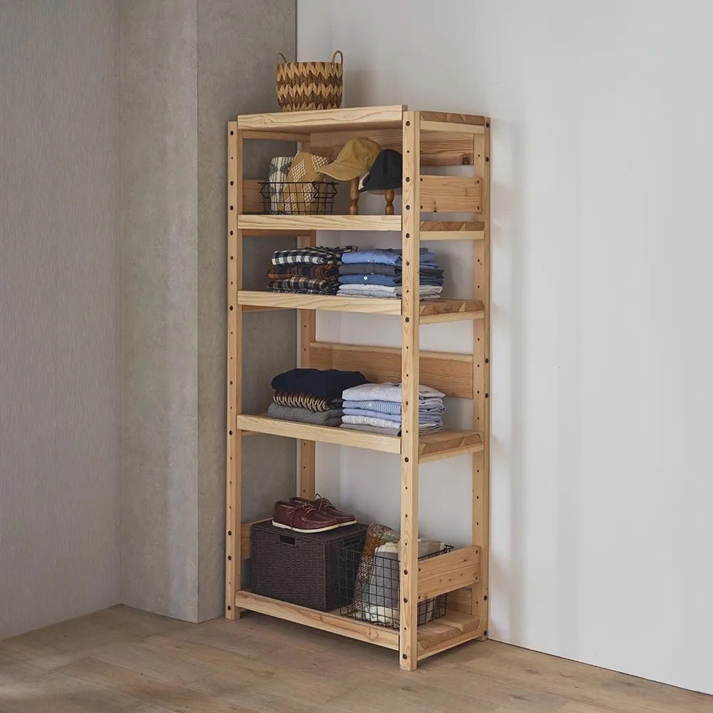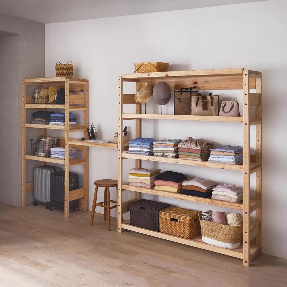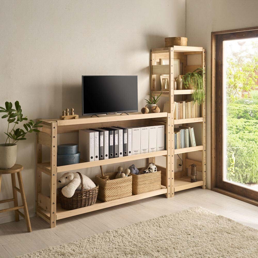 使用イメージ 時が経つほど愛着がわく、日田杉の頑丈さと美しさを兼ね備えた国産無垢材の収納ラック。長く愛着を持って使用できるサステナブル家具です。 ※写真左から別売りのハイタイプ幅120cm、ハイタイプ幅60cm、ロータイプ幅90cm。