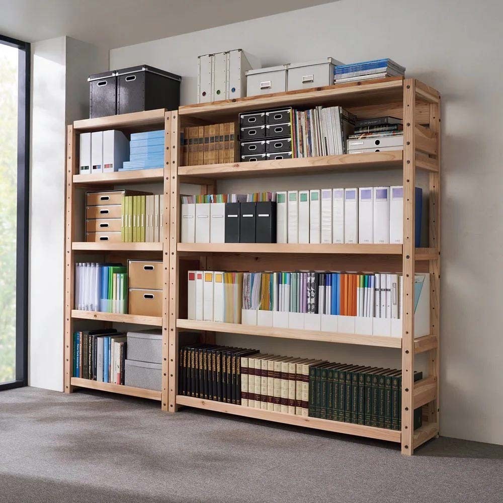 使用イメージ 重い本や書類、食器や調理家電をたっぷり収納してもたわみにくい、頑丈そのものの天然木ラックです。 ※写真左から別売りのロータイプ幅150cm、ハイタイプ幅60cm。