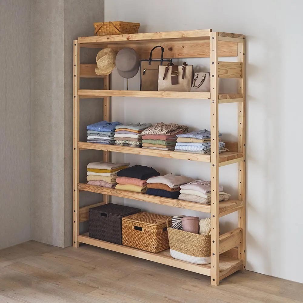 使用イメージ 時が経つほど愛着がわく、日田杉の頑丈さと美しさを兼ね備えた国産無垢材の収納ラック。長く愛着を持って使用できるサステナブル家具です。 ※写真左から別売りのハイタイプ幅120cm、ハイタイプ幅60cm、ロータイプ幅90cm。