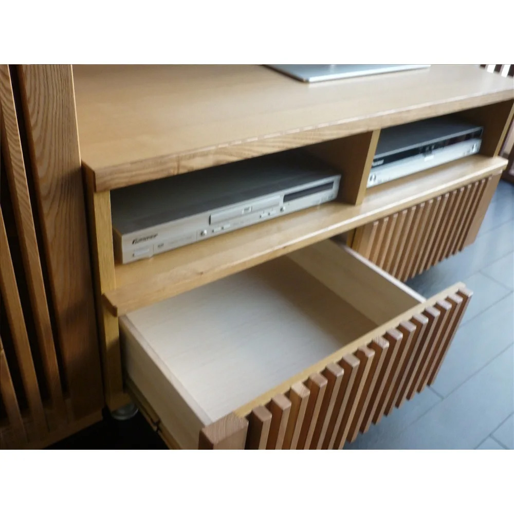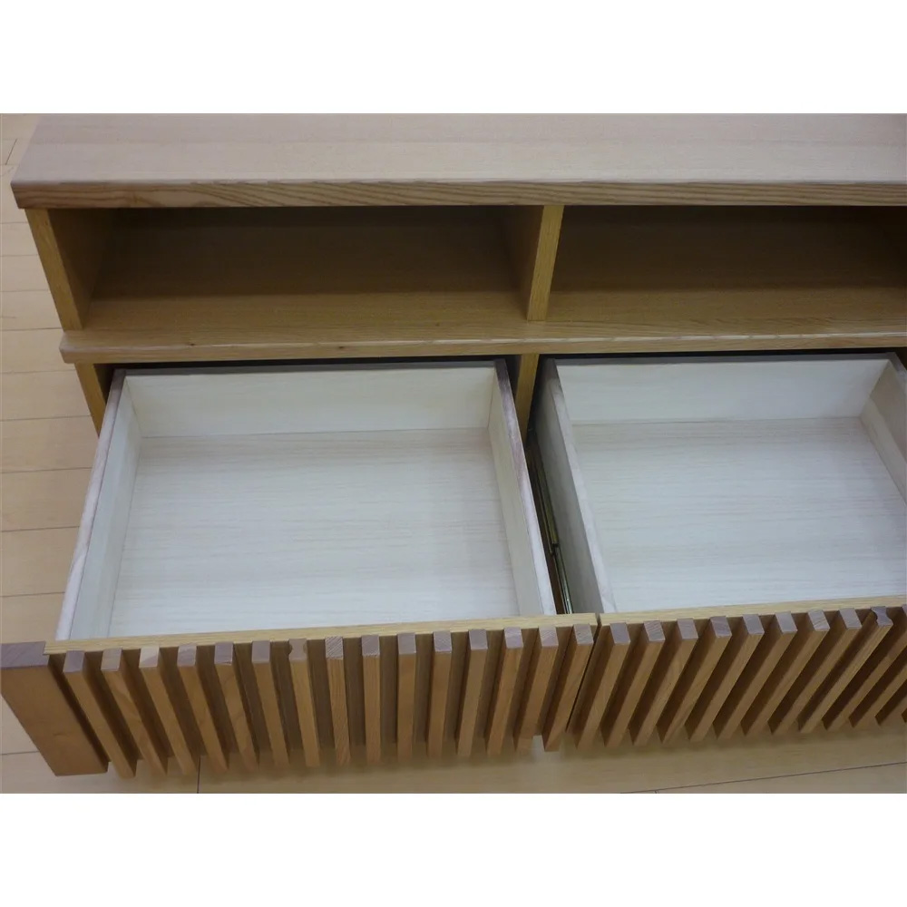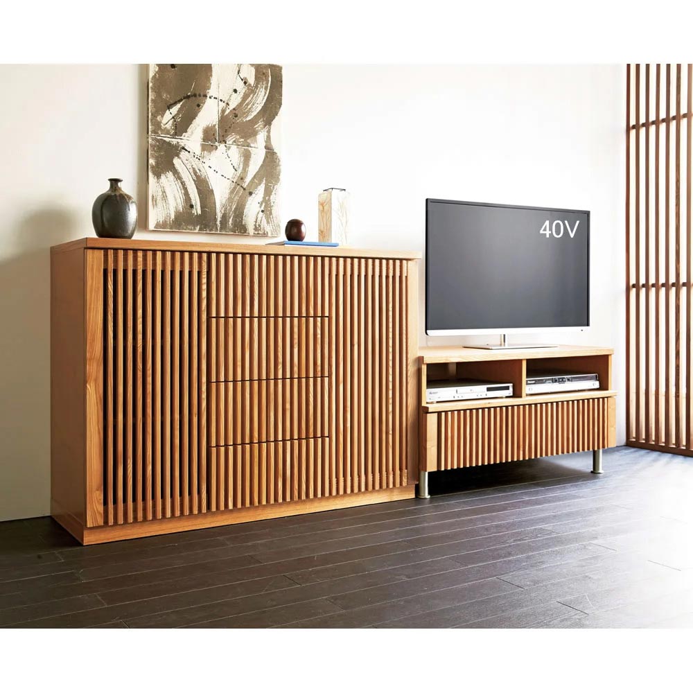 端正を極めた格子デザインで、こだわりのくつろぎ空間を演出するリビング収納シリーズ。日本国内の職人が一つひとつ手作業で丁寧に仕上げたタモ材の格子が、リビングダイニングや寝室、パーソナルルームに趣を添えます。シンプルで華やかなデザインなので、和室にも洋室にもなじみやすく、シーンを選ばずに設置できます。時を超えた美しさで多くの人を魅了する縦格子の収納家具です。日本の美意識が凝縮された格子シリーズ◆昔から日本の建築で多様に用いられてきた格子デザインは、光と風を取り入れ開放的な空間を演出します。◆シンプルながら目を引く、すっきりとしたデザインなので、和室はもちろん、洋室の収納にもオススメです。◆モダンな新築マンションに和モダンな美しい空間を生み出します。◆ストライプの様な縦の格子は天井の高さを強調し開放感を与えます。◆引出は分かれ目をなくすことでよりシンプルなデザインを施しています。どこか懐かしいあたたかみのあるタモ材◆木目がはっきりしているタモの無垢材を使用しあたたかみのある空間を演出します。◆強さとしなやかさを兼ね備えているタモ材は頑丈で安心してお使いいただけます。◆一つ一つ丁寧に、職人がこだわった作りをしています。使いやすさにもこだわった工夫◆幅100cmはデッキ2台収納、引き出し2杯の仕様です。◆引き出しはフルスライドレール仕様でスムーズに開閉ができます。◆脚部はアジャスター付きでお客様のお好みで高さ調節が可能です。商品担当者からのメッセージ◆タモ無垢材のあたたかみと和風の格子の美しいデザインが綺麗で明るい部屋を演出します。仕上がりはとても綺麗かつ高級感のある仕様でどこに置いても存在感のある商品です。