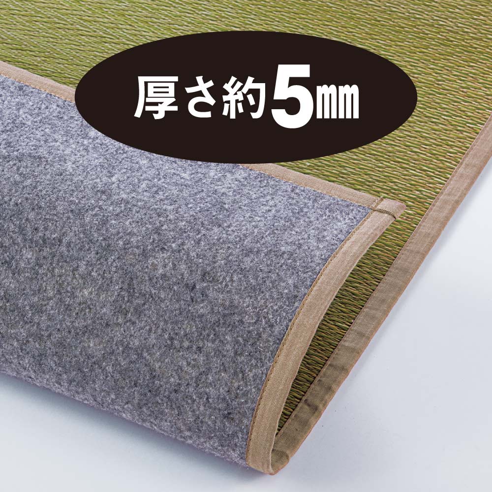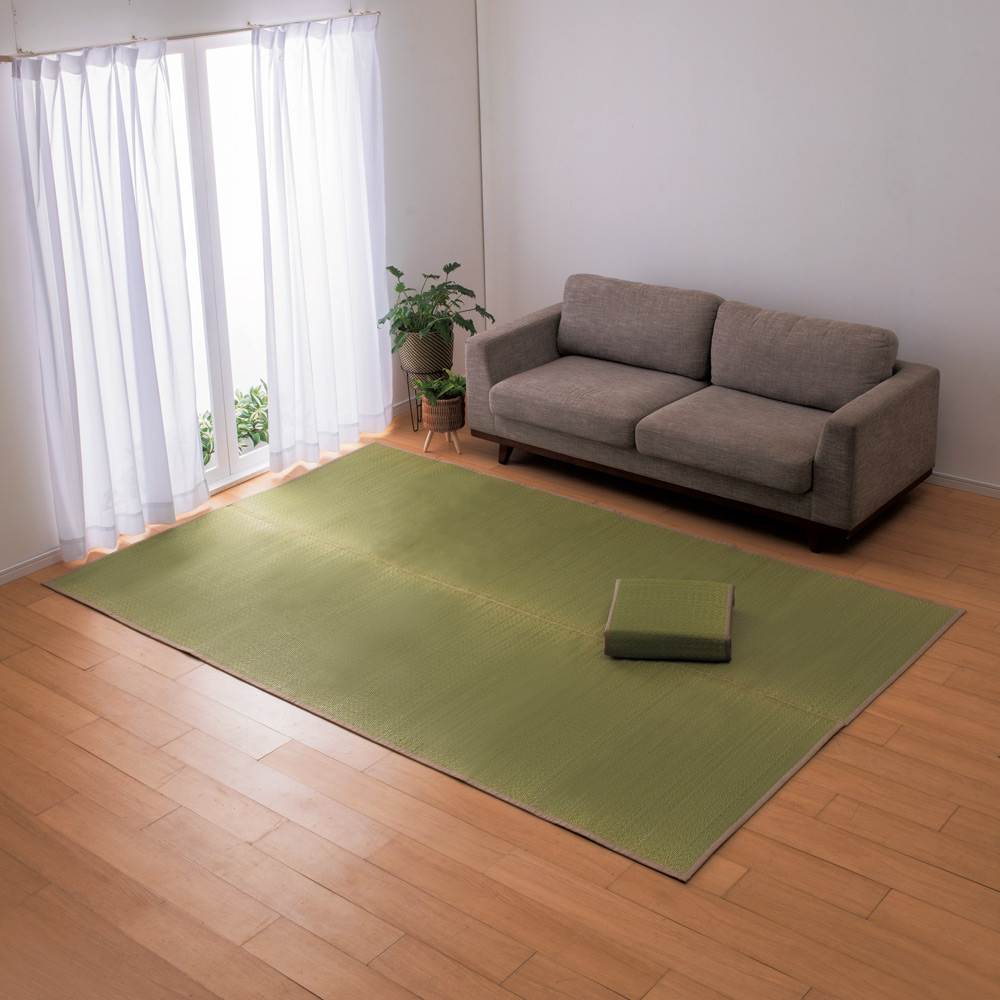 和風モダンなデザインと香りに心安らぐ。夏の暮らしを快適にするい草。裏付き・ふっくらと厚さが選べるラグタイプ。福岡花ござの裏付きカラーい草ラグ。洋室にも美しく調和し、手軽に夏らしいインテリアが実現できます。国内のい草の90%以上を生産する熊本県は、い草の栽培に適した、肥沃な土壌と温暖な気候により、高品質ない草の生産地として発展してきました。一本一本が太くて丈夫、色艶が美しい、香りがよいという特長を持つ熊本県産の貴重ない草を使用し福岡で織った、「福岡花ござ」のカラーい草ラグ。厚さ約5ミリの裏付きタイプと、厚さ約12ミリのふっくらタイプ、使い心地や用途に応じてお選びいただけます。現代風にアレンジしたシンプルな杉綾織(ヘリンボーン柄)のデザインと美しい色は、インテリアになじみやすく、和風のお部屋にも洋風のお部屋にも調和します。※い草は天然素材のため、若干色が異なる場合があります。【ポイント1】福岡花ござ貴重な国産い草を使用して、福岡県内で織られた花茣蓙(はなござ)のブランド。良質な素材と匠の技による高品質、優れたデザイン性が特長です。■い草の特長◎調湿・消臭効果い草は天然素材で、湿度を調整する働きがあり、部屋の空気を快適に保つのに役立ちます。独特の香りがリラックス効果をもたらすほか、ニオイを吸収する効果もあるため、ペットがいるご家庭にもおすすめです。◎オールシーズン使えます夏は涼しく、冬は暖かいという特性がありますので、一年を通して快適にお使いいただけます。◎耐久性が高くお手入れもしやすいい草は丈夫な素材で、適切に使えば長く愛用できます。汚れにくく、簡単な掃除で清潔を保つことができるため、日常使いに好適です。◎環境に優しい天然素材であるい草は、環境負荷が少なく、エコな選択肢として注目されています。使用後も土に還りやすい素材です。【ポイント2】お好みに合わせて選べる4色落ち着きのあるグレー系、爽やかなグリーン系、涼しげなブルー系、お部屋を明るくするオレンジ系の4色をご用意しました。【ポイント3】へりは天然染料・山桃による草木染へりは綿100%素材で、山桃の草木染によるやさしい色合いです。植物由来の染料を使用することで、人にも環境にも配慮しました。【ポイント4】厚さが選べる2タイプ■滑りにくい加工付きの裏付きタイプ厚さ約5ミリで、裏面はフローリングなどの床をキズから守る不織布。滑りにくい加工を施しているので、使用するたびにズレる不快感が少なく快適です。■底付き感の少ないふっくらタイプ裏面にウレタンフォームを使用した厚さ約12ミリのボリューム。程よいクッション性があり底付き感が少ない座り心地。床面とラグの接触面が滑りにくい効果もあります。