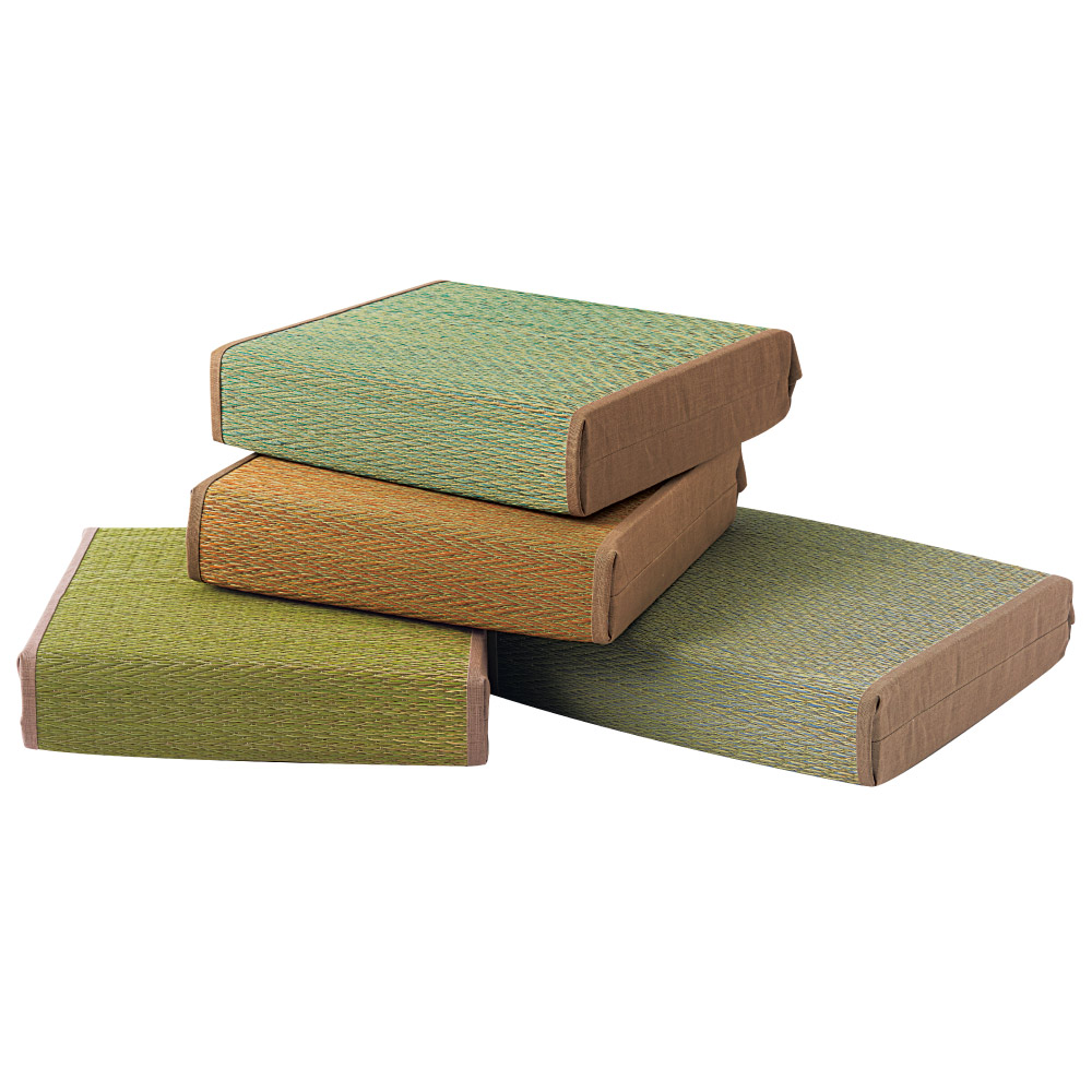 和風モダンなデザインと香りに心安らぐ。夏の暮らしを快適にするい草。ラグとお揃いで使えるフロアクッション。福岡花ござのフロアクッション。手軽に夏らしいインテリアが実現できます。国内のい草の90%以上を生産する熊本県は、い草の栽培に適した、肥沃な土壌と温暖な気候により、高品質ない草の生産地として発展してきました。一本一本が太くて丈夫、色艶が美しい、香りがよいという特長を持つ熊本県産の貴重ない草を使用し福岡で織った、「福岡花ござ」のフロアクッション。両面ともい草を使用しており、厚さは約10cm。中身は、固わた・ウレタンフォーム・固わたの3層構造で、しっかりとした固さがあり、ヘタリにくくなっています。現代風にアレンジしたシンプルな杉綾織(ヘリンボーン柄)のデザインと美しい色は、インテリアになじみやすく、和風のお部屋にも洋風のお部屋にも調和します。※い草は天然素材のため、若干色が異なる場合があります。【ポイント1】福岡花ござ貴重な国産い草を使用して、福岡県内で織られた花茣蓙(はなござ)のブランド。良質な素材と匠の技による高品質、優れたデザイン性が特長です。■い草の特長◎調湿・消臭効果い草は天然素材で、湿度を調整する働きがあり、部屋の空気を快適に保つのに役立ちます。独特の香りがリラックス効果をもたらすほか、ニオイを吸収する効果もあるため、ペットがいるご家庭にもおすすめです。◎オールシーズン使えます夏は涼しく、冬は暖かいという特性がありますので、一年を通して快適にお使いいただけます。◎耐久性が高くお手入れもしやすいい草は丈夫な素材で、適切に使えば長く愛用できます。汚れにくく、簡単な掃除で清潔を保つことができるため、日常使いに好適です。◎環境に優しい天然素材であるい草は、環境負荷が少なく、エコな選択肢として注目されています。使用後も土に還りやすい素材です。【ポイント2】お好みに合わせて選べる4色落ち着きのあるグレー系、爽やかなグリーン系、涼しげなブルー系、お部屋を明るくするオレンジ系の4色をご用意しました。【ポイント3】へりは天然染料・山桃による草木染へりは綿100%素材で、山桃の草木染によるやさしい色合いです。植物由来の染料を使用することで、人にも環境にも配慮しました。