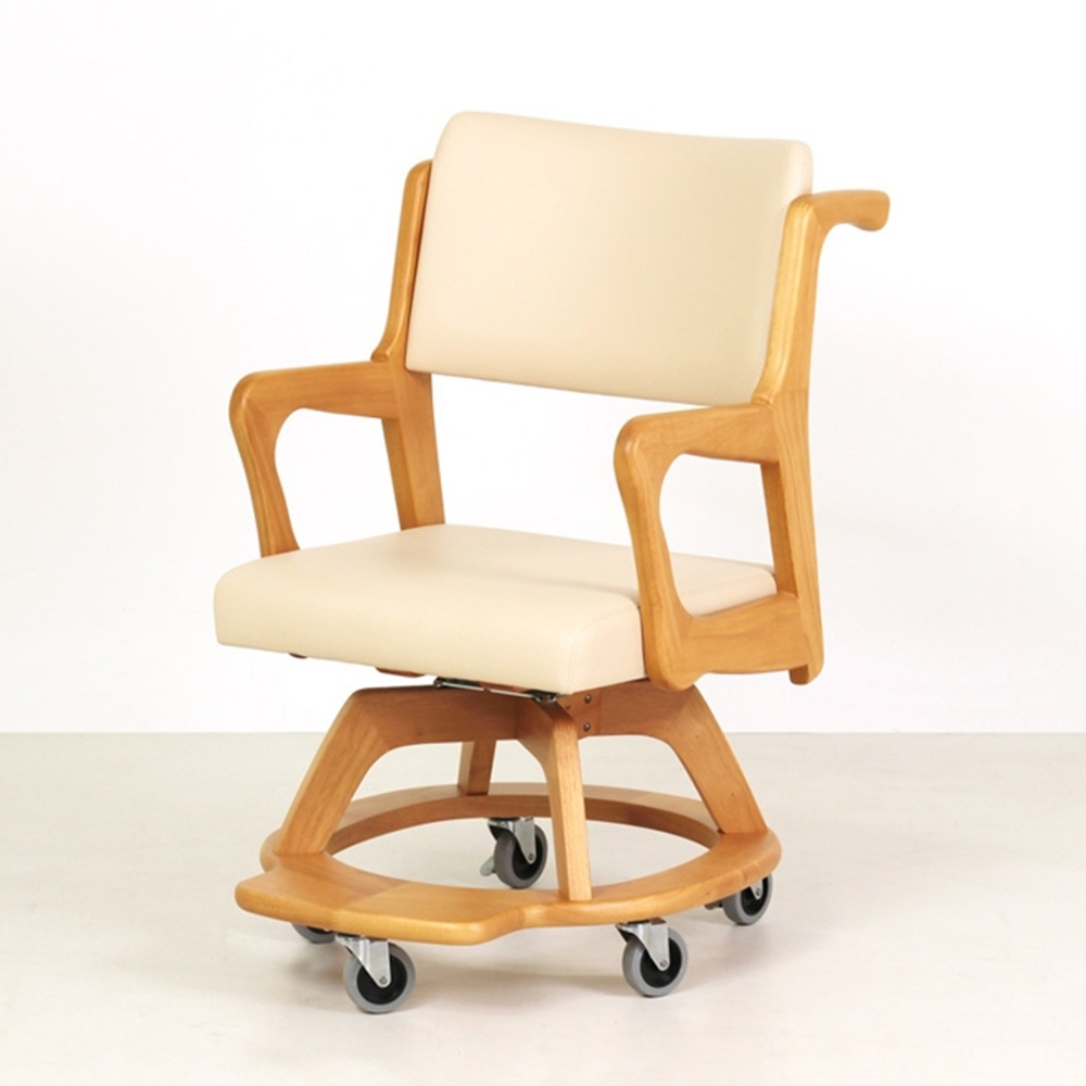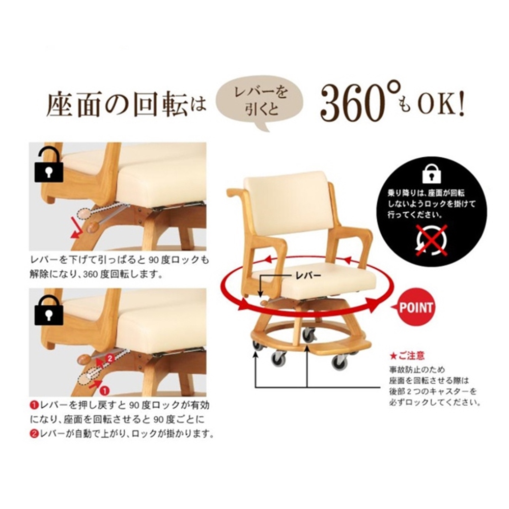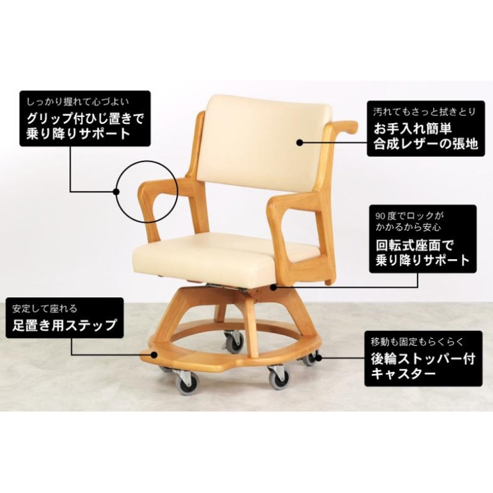 介護のプロにも選ばれる安心のチェア。機能に迷ったら全部ついてるこれで決まり!立ち座りをサポートする握りやすいグリップ、安全性を考慮した少し低めの座面、長時間座っても疲れにくいクッション性に加え、テーブルの出入りがラクな安全ロック付きの回転機能とキャスター、手押しハンドルをプラス。お世話する方、される方の双方に、よりやさしく寄り添う1脚です。張り地は汚れてもサッと拭き取れる合成皮革で、お手入れ簡単です。写真は別売りのテーブルとの組み合わせです。すみずみまで配慮されたダイニング家具で、ご家庭でも介護施設レベルの安心を立ち座りがつらくなった、脚が衰えて歩行が不安、つまずきや転倒によるけがが心配…。そんな気持ちに寄り添う、やさしさいっぱいのダイニング家具シリーズ。脚腰が不安になりはじめた時期はもちろん、介護が必要になってからも、ご本人と支えるご家族の安全を守って毎日の暮らしをサポートします。介護の現場でも選ばれる安心設計。機能をフル装備した頼れる1脚ですしっかり握れて立ち座り時に身体を支えられるグリップ、テーブルの出入りがラクな回転機能、さらに車椅子感覚で移動を助けるキャスターまで付いた「全部入り」。選ぶのに迷ったら、これで決まりです。ネジなしフレームによる優れた耐久性フレームにはネジがないのでゆるんでガタつく心配も、洋服を引っ掛けることもありません。張り地のカラーは、食べこぼしなどが見えやすく清潔感を保ちやすい(ア)アイボリー、汚れが目立ちにくい(イ)ブラウンの2色です。 ※この商品は張り地アイボリー×木枠ライトブラン、張り地ブラウン×木枠ブラウンの2色展開となります。不意の回転を防ぐ、安心なロック機能付き90度回るごとにストップする自動ロック機能付きの安心設計。さらに椅子を回転させたいときは、ラクに手が届く右下のレバーを下げるだけ。立ち上がるとき、急に回転してよろける危険を回避できます。姿勢が安定しやすい足乗せ付き。キャスターはストッパー付きで転倒リスクに配慮座ったまま車椅子のように押して移動が可能。足乗せ付きなので、自分で脚を上げておく必要がなくラクに移動できます。先頭以外の4つのキャスターは足でストッパーを踏んで固定が可能なので、急に動いてしまう心配も解消。 ※足でストッパーを上げ下げする際はケガをしないようご注意ください。木のハンドルで介護っぽさを軽減お世話される方にも、する方にもやさしいたくさんの機能を盛り込みながらも、普通のチェアに見えるデザインで、「まだ車椅子は…」という心理的な負担を軽減。張り地はお手入れが簡単で高機能な合成皮革飲み物や食べこぼしもサッと拭き取れ、お手入れ簡単。衛生的にお使いいただけます。また、6有害物質不使用、耐次亜塩素酸機能、耐アルコール機能、防汚機能、耐移行機能、難燃機能といった安心の機能が満載!!