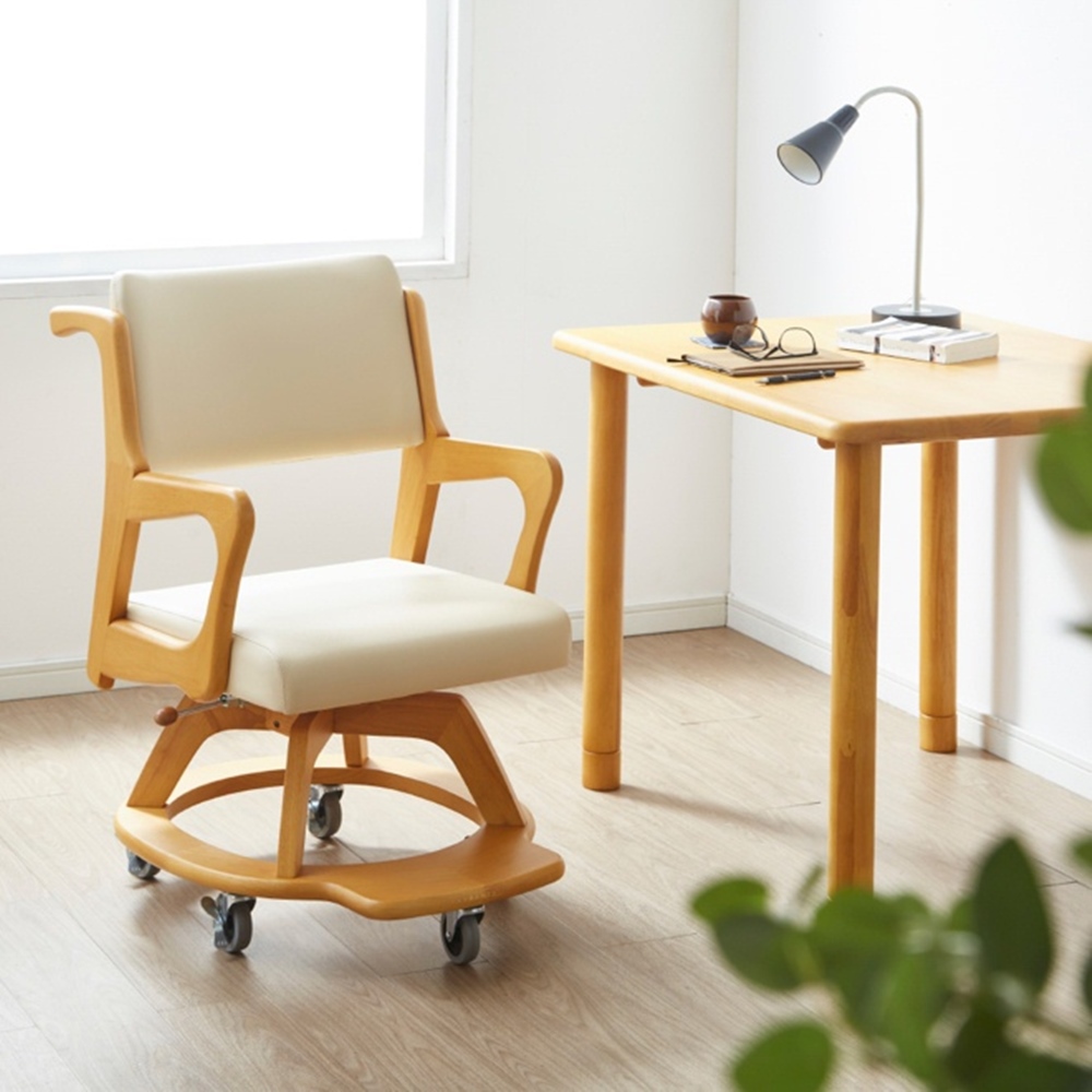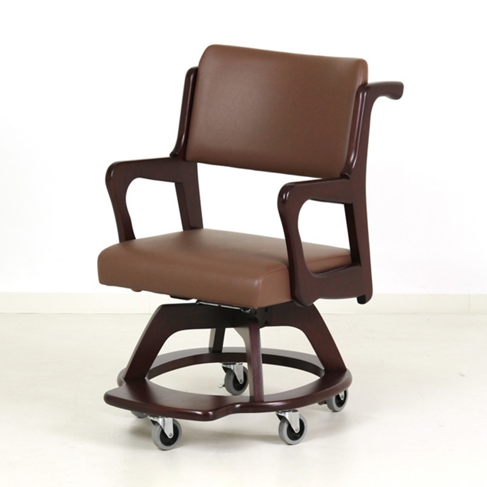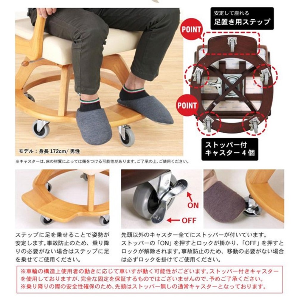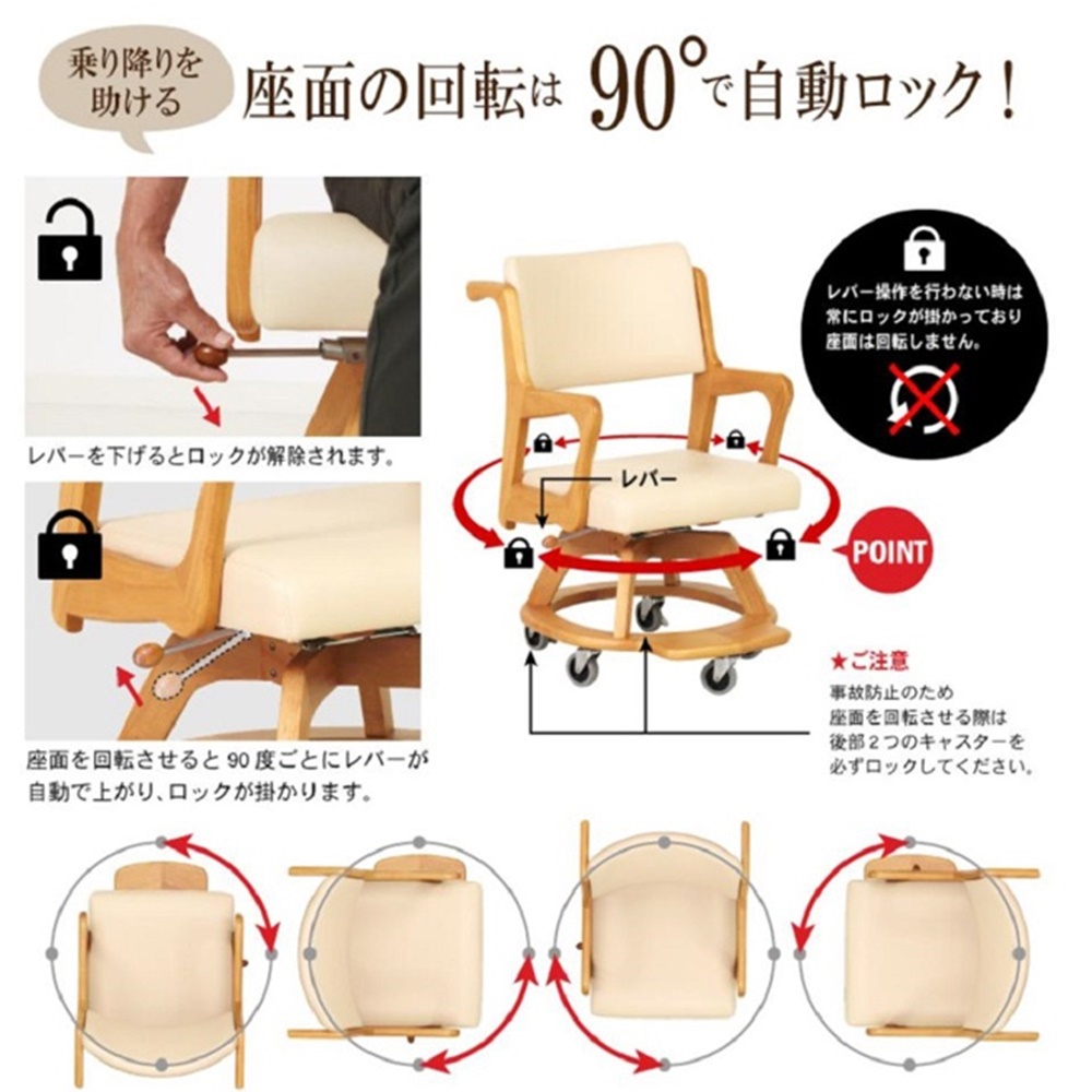 介護のプロにも選ばれる安心のチェア。機能に迷ったら全部ついてるこれで決まり!立ち座りをサポートする握りやすいグリップ、安全性を考慮した少し低めの座面、長時間座っても疲れにくいクッション性に加え、テーブルの出入りがラクな安全ロック付きの回転機能とキャスター、手押しハンドルをプラス。お世話する方、される方の双方に、よりやさしく寄り添う1脚です。張り地は汚れてもサッと拭き取れる合成皮革で、お手入れ簡単です。写真は別売りのテーブルとの組み合わせです。すみずみまで配慮されたダイニング家具で、ご家庭でも介護施設レベルの安心を立ち座りがつらくなった、脚が衰えて歩行が不安、つまずきや転倒によるけがが心配…。そんな気持ちに寄り添う、やさしさいっぱいのダイニング家具シリーズ。脚腰が不安になりはじめた時期はもちろん、介護が必要になってからも、ご本人と支えるご家族の安全を守って毎日の暮らしをサポートします。介護の現場でも選ばれる安心設計。機能をフル装備した頼れる1脚ですしっかり握れて立ち座り時に身体を支えられるグリップ、テーブルの出入りがラクな回転機能、さらに車椅子感覚で移動を助けるキャスターまで付いた「全部入り」。選ぶのに迷ったら、これで決まりです。ネジなしフレームによる優れた耐久性フレームにはネジがないのでゆるんでガタつく心配も、洋服を引っ掛けることもありません。張り地のカラーは、食べこぼしなどが見えやすく清潔感を保ちやすい(ア)アイボリー、汚れが目立ちにくい(イ)ブラウンの2色です。 ※この商品は張り地アイボリー×木枠ライトブラン、張り地ブラウン×木枠ブラウンの2色展開となります。不意の回転を防ぐ、安心なロック機能付き90度回るごとにストップする自動ロック機能付きの安心設計。さらに椅子を回転させたいときは、ラクに手が届く右下のレバーを下げるだけ。立ち上がるとき、急に回転してよろける危険を回避できます。姿勢が安定しやすい足乗せ付き。キャスターはストッパー付きで転倒リスクに配慮座ったまま車椅子のように押して移動が可能。足乗せ付きなので、自分で脚を上げておく必要がなくラクに移動できます。先頭以外の4つのキャスターは足でストッパーを踏んで固定が可能なので、急に動いてしまう心配も解消。 ※足でストッパーを上げ下げする際はケガをしないようご注意ください。木のハンドルで介護っぽさを軽減お世話される方にも、する方にもやさしいたくさんの機能を盛り込みながらも、普通のチェアに見えるデザインで、「まだ車椅子は…」という心理的な負担を軽減。張り地はお手入れが簡単で高機能な合成皮革飲み物や食べこぼしもサッと拭き取れ、お手入れ簡単。衛生的にお使いいただけます。また、6有害物質不使用、耐次亜塩素酸機能、耐アルコール機能、防汚機能、耐移行機能、難燃機能といった安心の機能が満載!!
