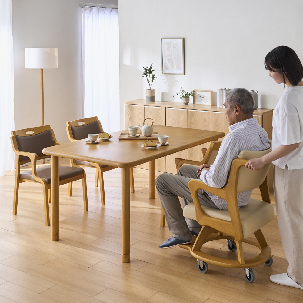 コーディネート例 介護のプロにも選ばれる安心設計には、優しさが詰まっています。 ※お届けはチェアです。写真は別売りのテーブルとの組み合わせです。