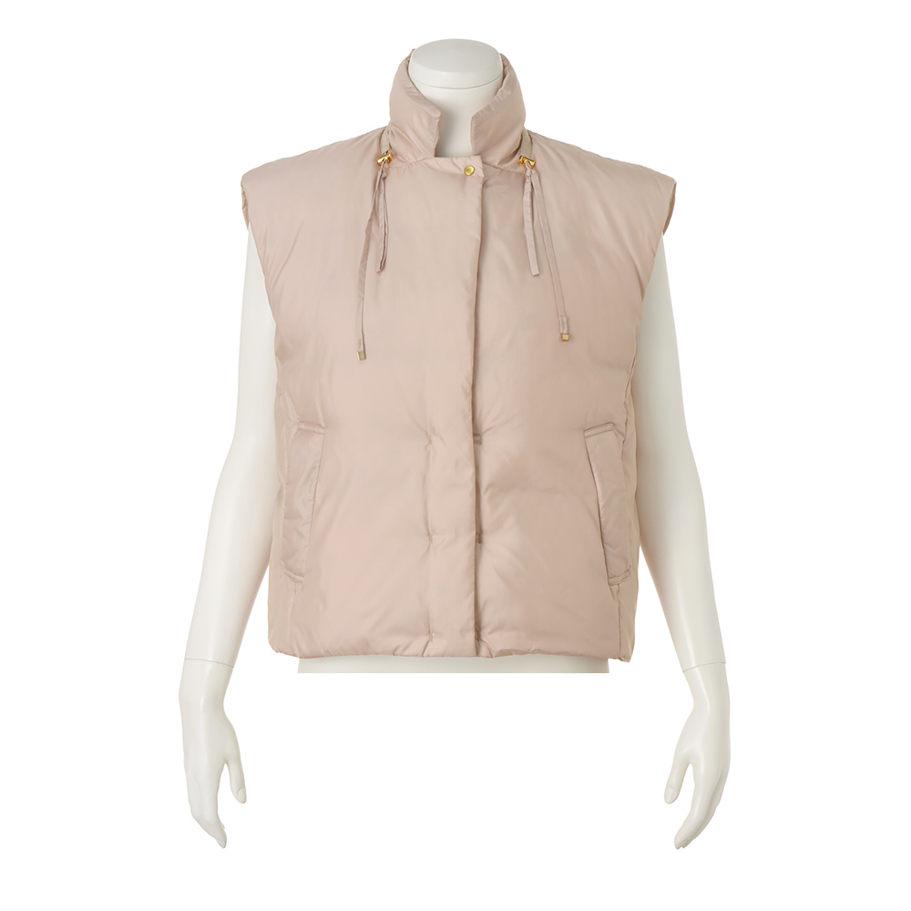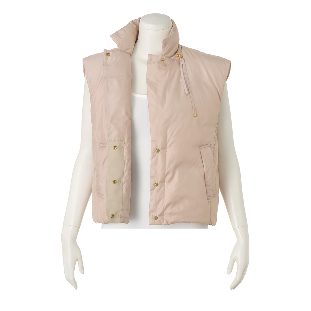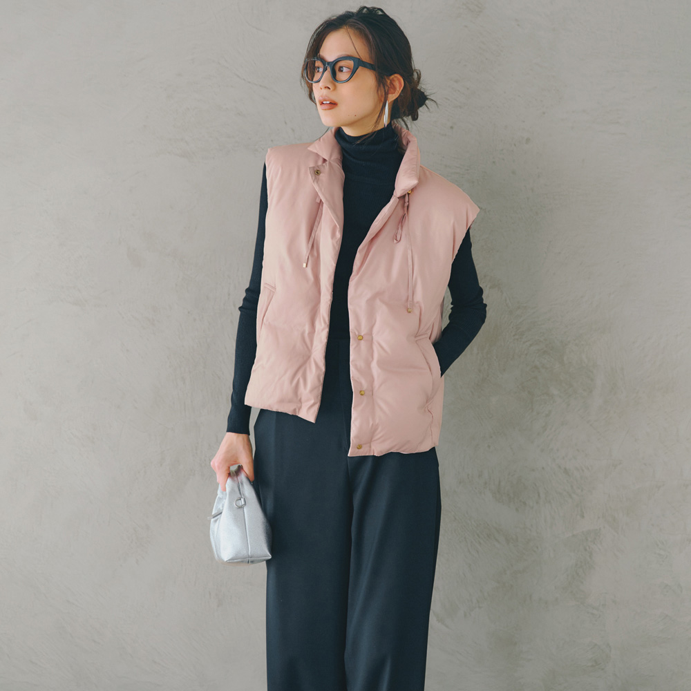 注目の襟つきデザインをノーステッチのダウンジレに。肌なじみのよいくすみピンクにゴールドパーツを効かせて、品よく仕上げました。バランスよく着こなせる絶妙な丈感と、高密度タフタのしなやかさで着ぶくれせず、シルエットを美しく見せます。