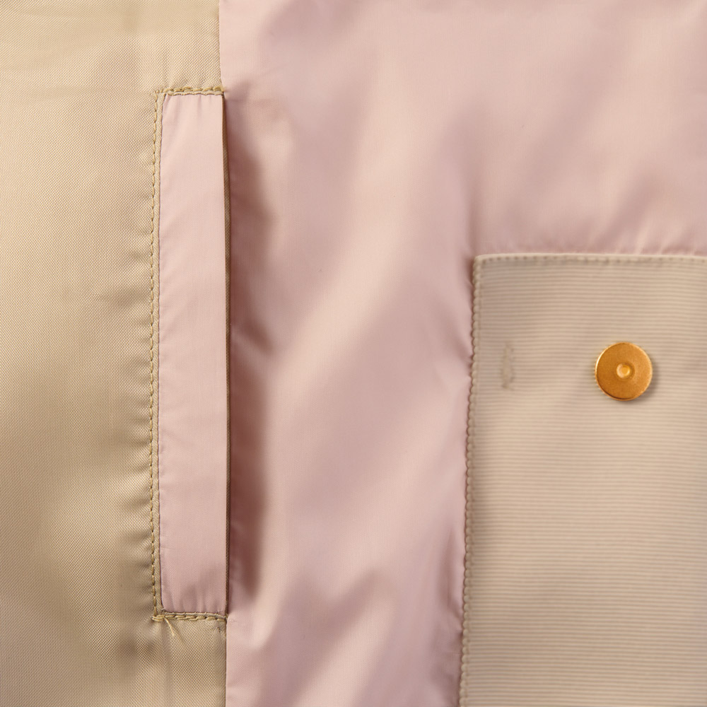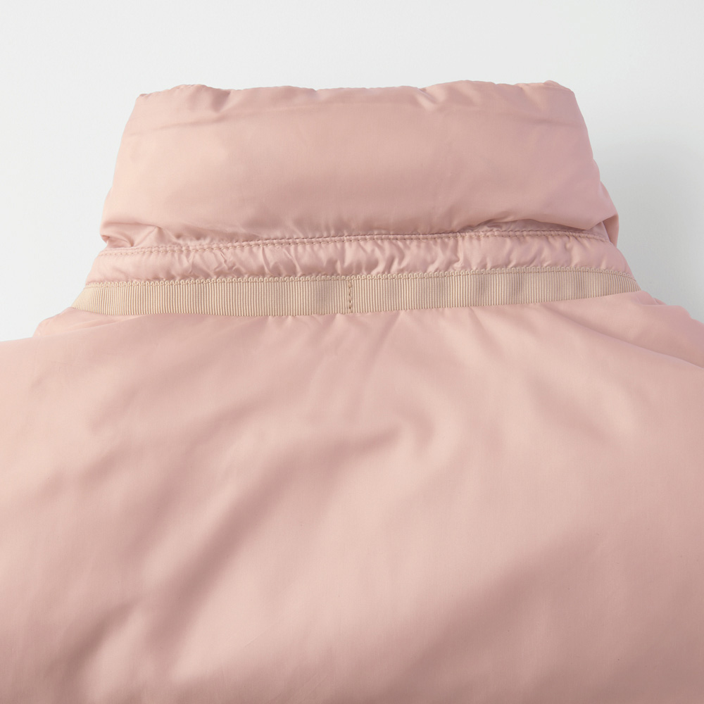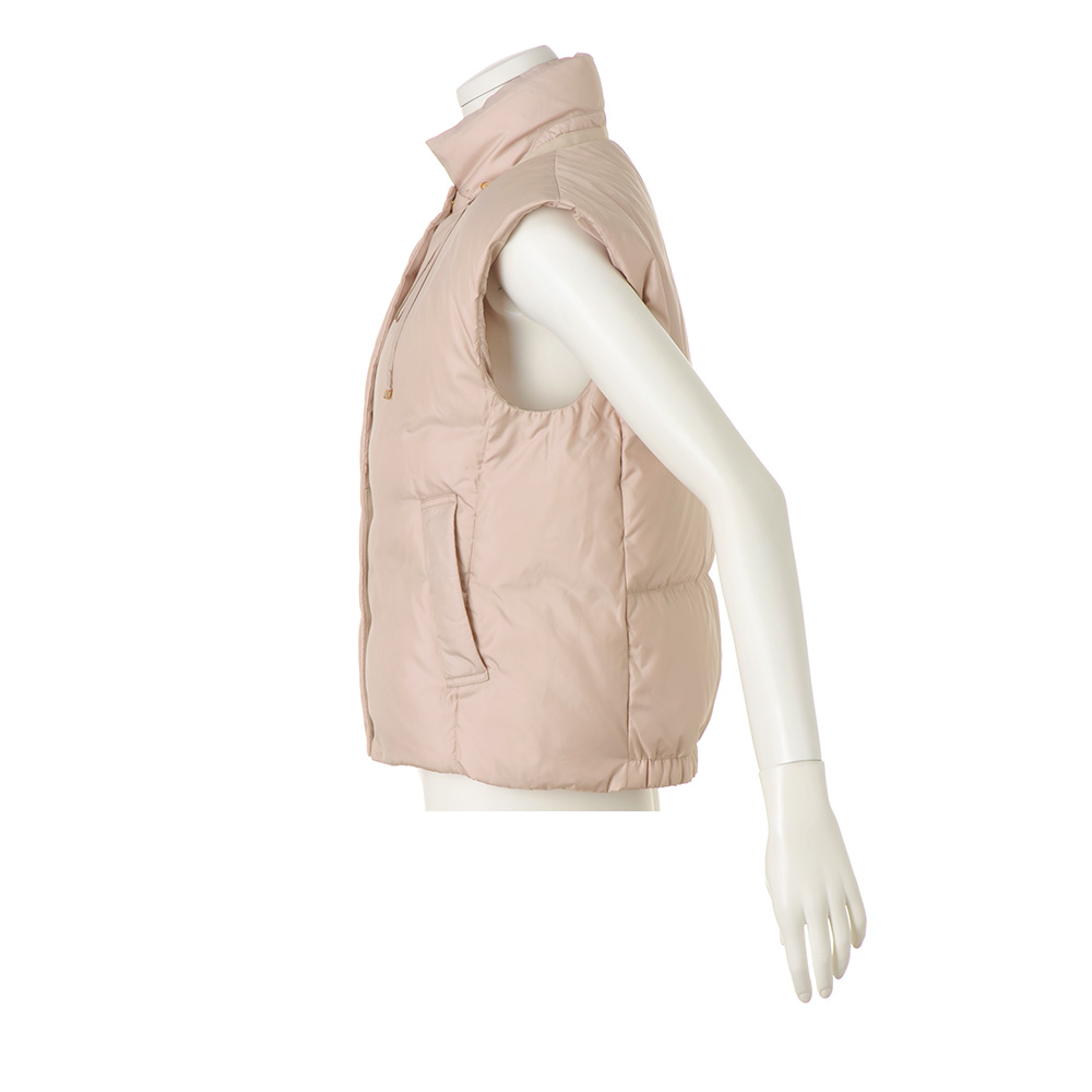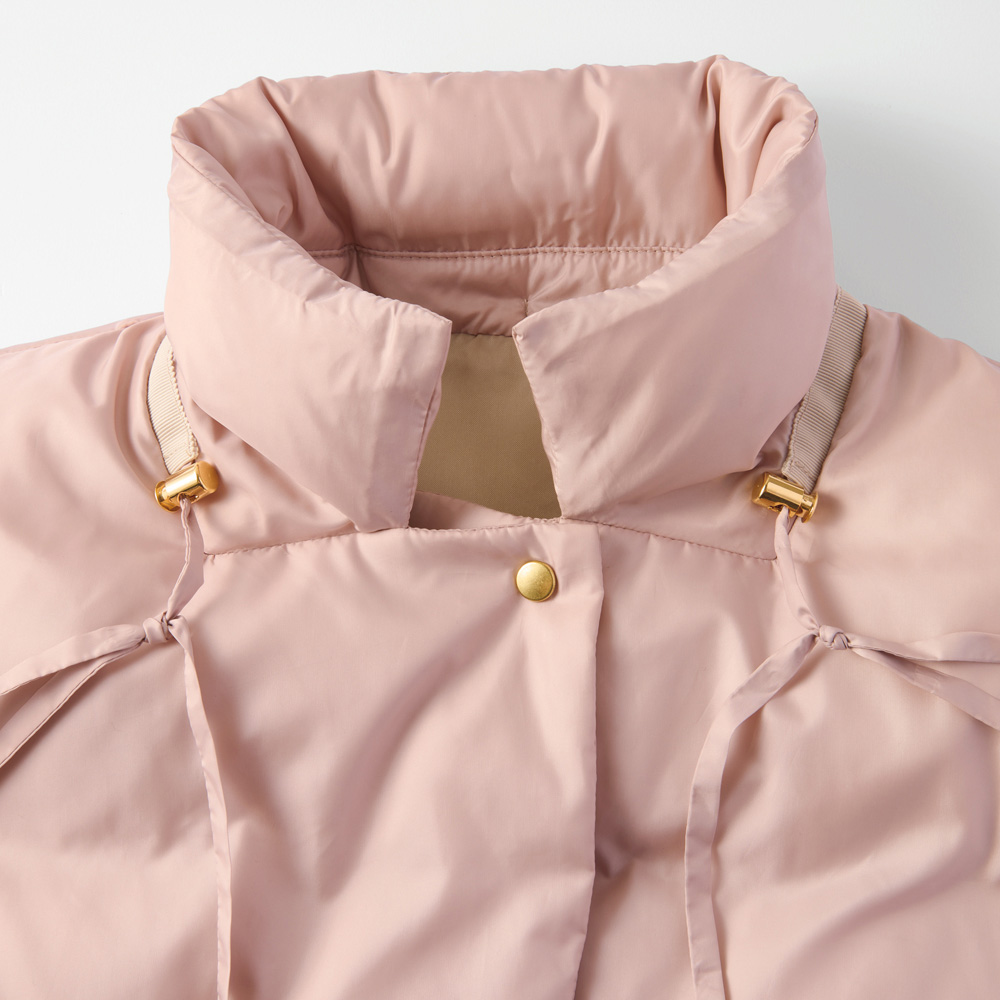注目の襟つきデザインをノーステッチのダウンジレに。肌なじみのよいくすみピンクにゴールドパーツを効かせて、品よく仕上げました。バランスよく着こなせる絶妙な丈感と、高密度タフタのしなやかさで着ぶくれせず、シルエットを美しく見せます。