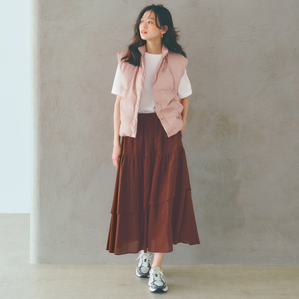 • コーディネート例 /ビターな甘さで魅せる、秋色レイヤード…フェミニンなティアードスカートに軽やかなジレをオン。足元はスニーカーでハズすと、今年らしいバランスが完成。