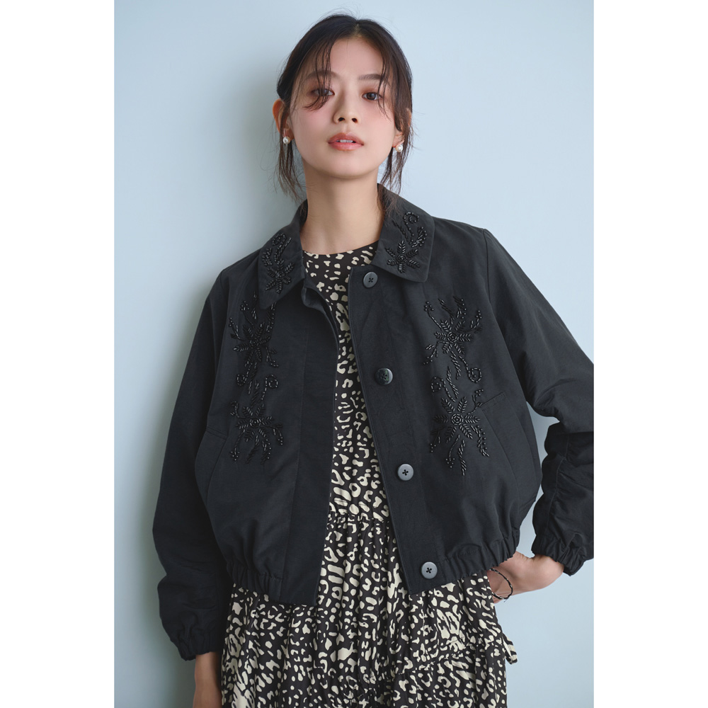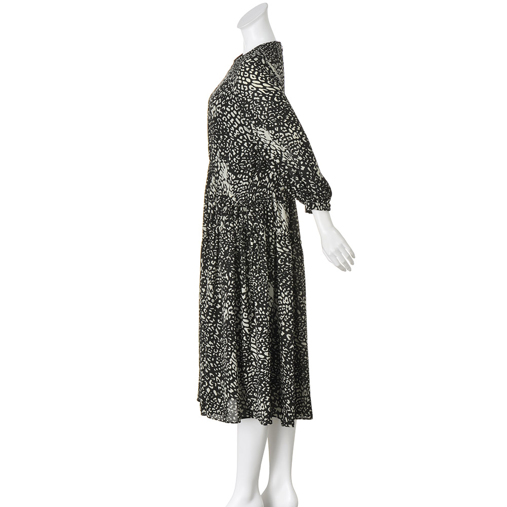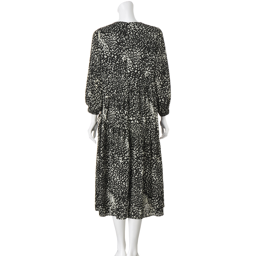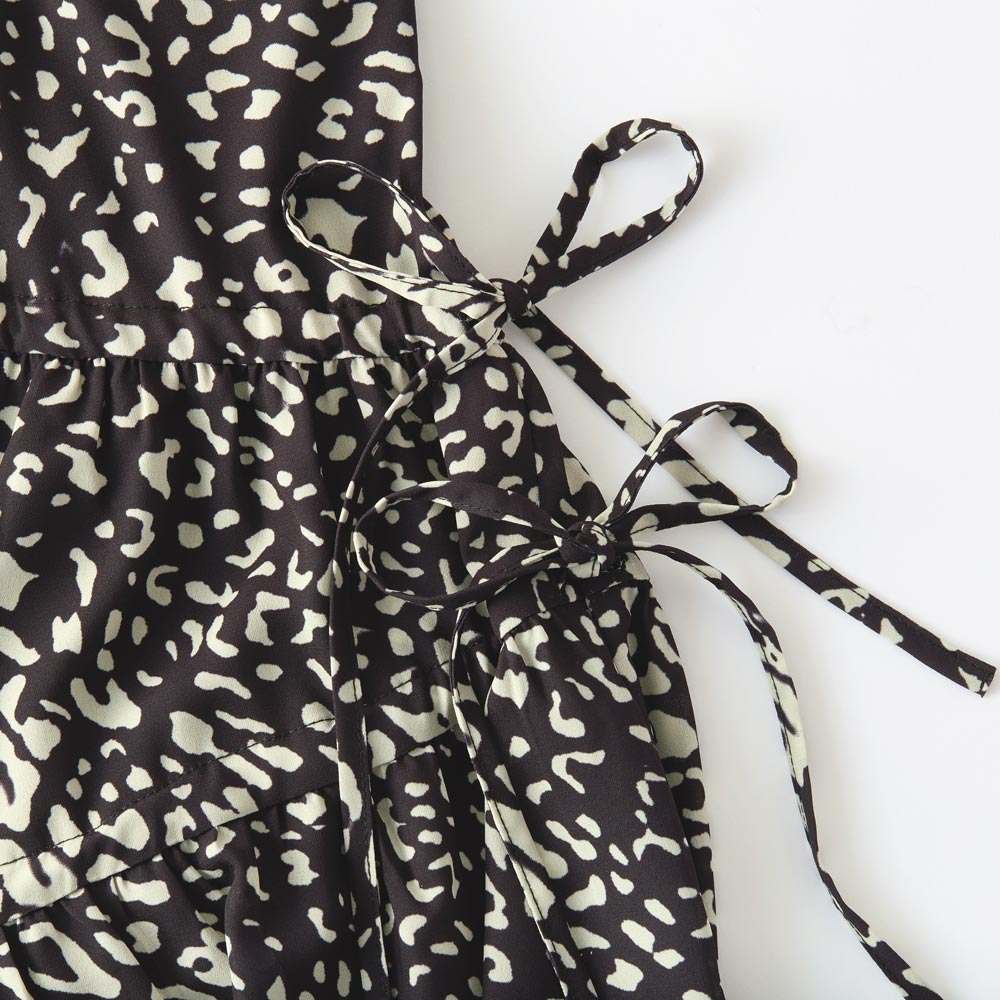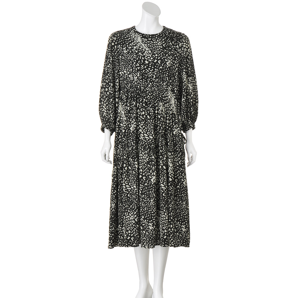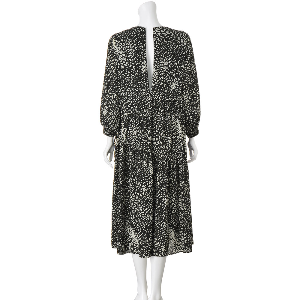 MONO TONE夏の装いが少し気恥ずかしくなってくる晩夏に、シックなモノトーンはうってつけ。フェミニンモードなイメージづくりもお手のもの。取り入れるだけで、魅力的な秋が始まります。斜めの切り替え位置に共布のリボンを仕込んだ、ドロスト仕様の変形ティアードワンピース。絞り具合でシルエットの変化を楽しめます。柔らかなジョーゼット生地にのせたレオパード柄は、モノトーンだからシックな印象をキープ。袖は裏地なしで軽やかな印象です。