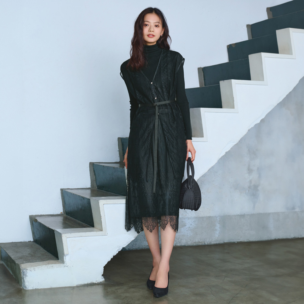 コーディネート例 /レースのニュアンスを味方に軽やかなオールブラックに