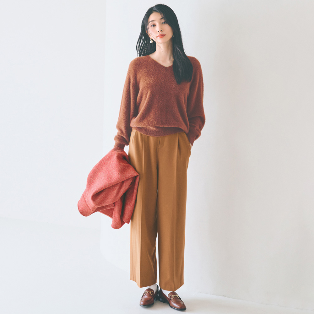 • 異素材MIXのモードなブラウンコーデで小粋に季節を更新。 (ア)キャメル コーディネート例