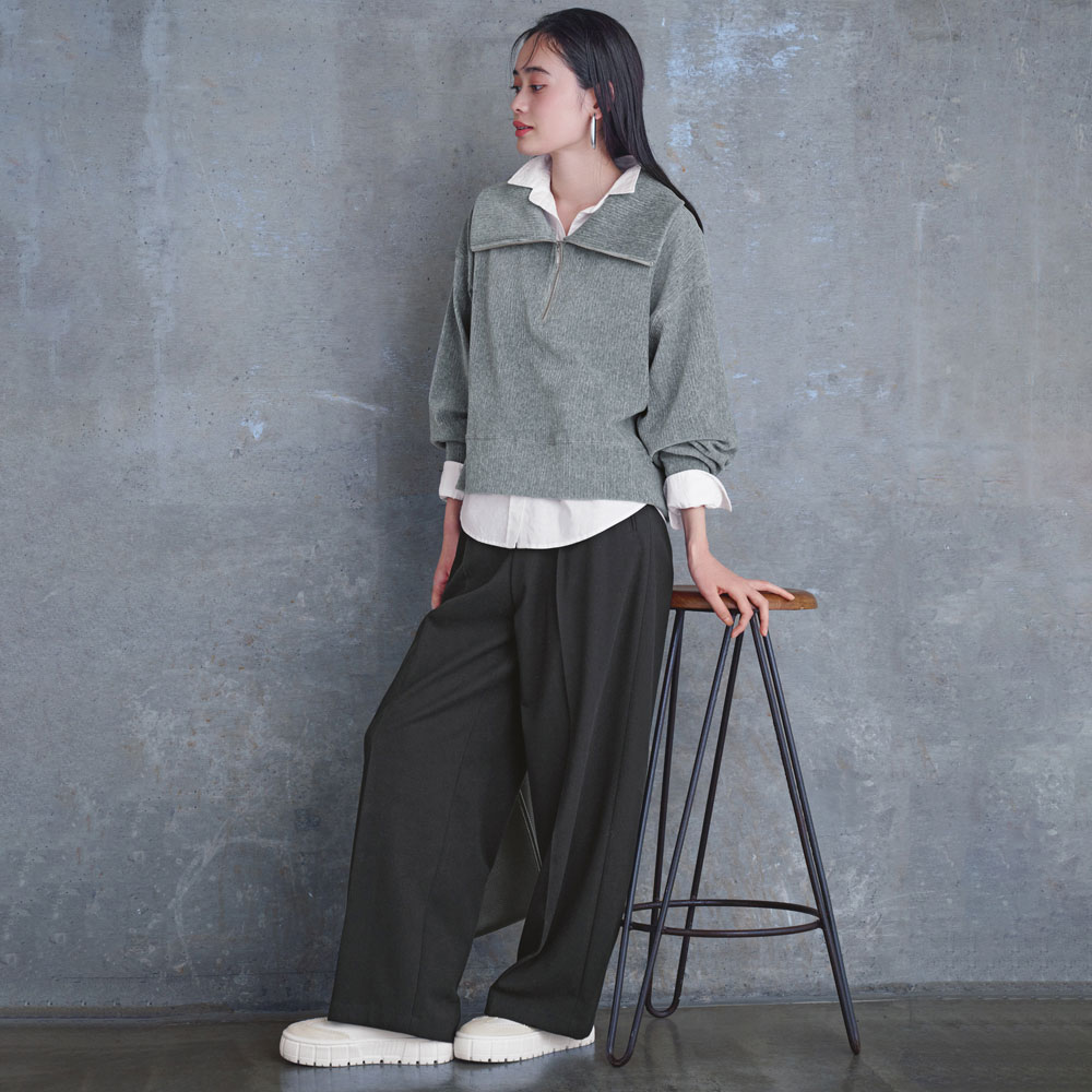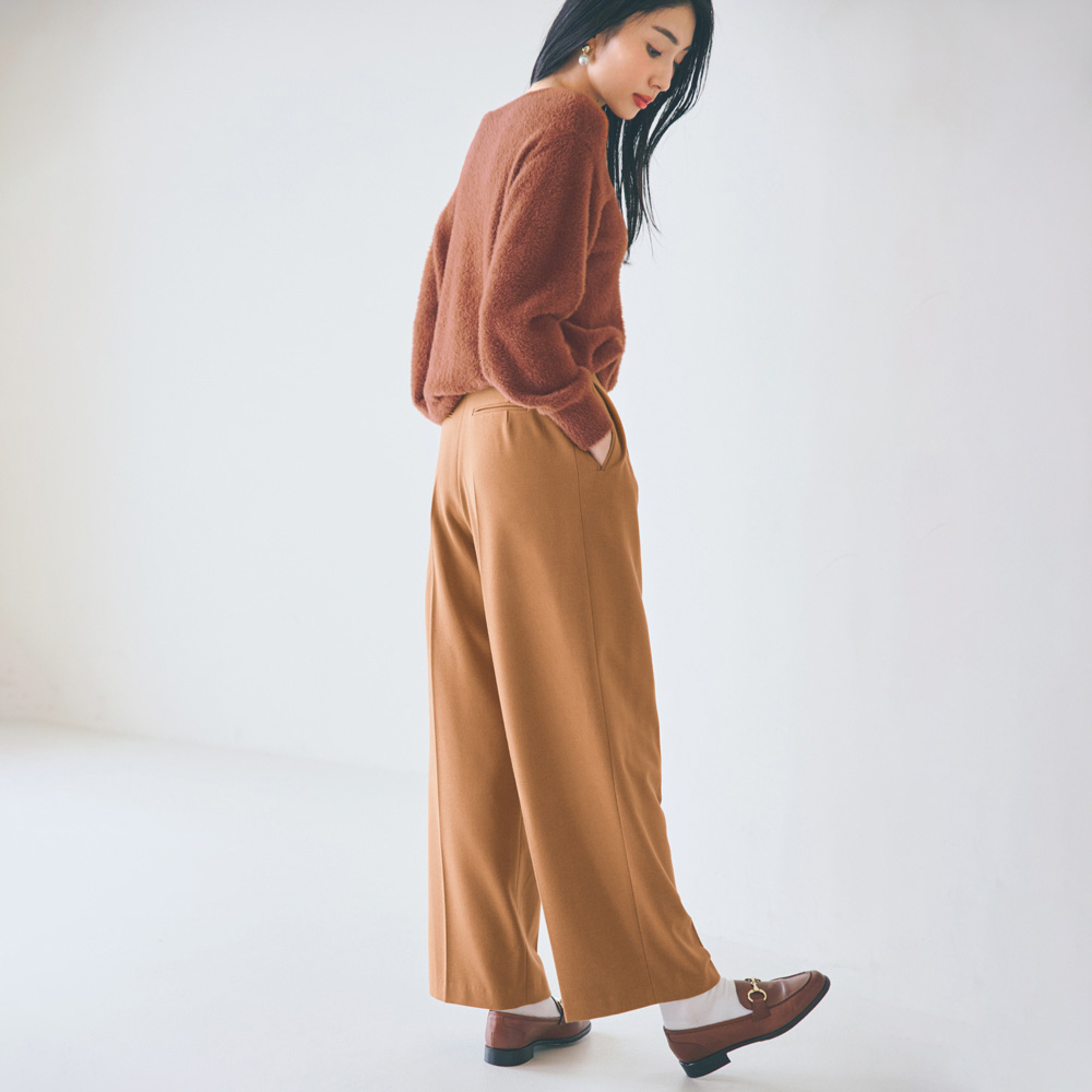ベーシックだけど盛れるアイテムが、いつもの日常をクラスアップしてくれます。美脚見せもこなれ感も欲張れる旬のゆるめシルエットふくらみのある生地を使ったセミワイドシルエットで、美脚見えが期待できるパンツ。リラクシーな雰囲気を持ちながらタック&センタープレス入りのきちんと感もあり、幅広い着こなしに対応できます。両面にしっとりとした起毛感があるため素足ではいてもやわらかなあたたかみが感じられ、快適なはき心地に。2ウェイストレッチによる動きやすさも魅力です。