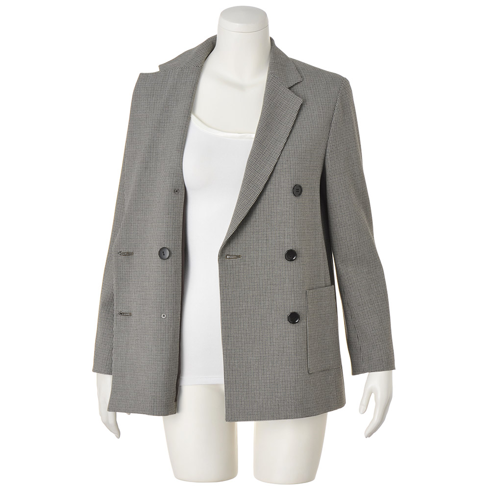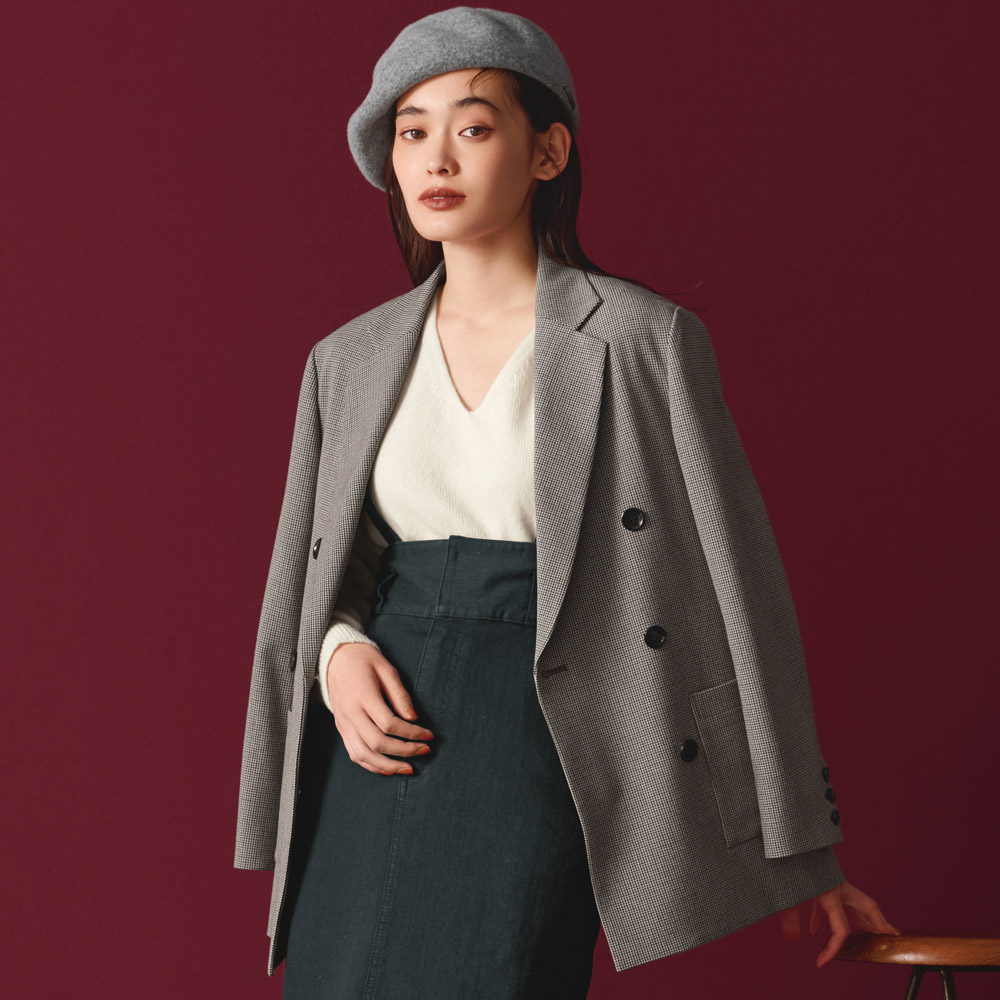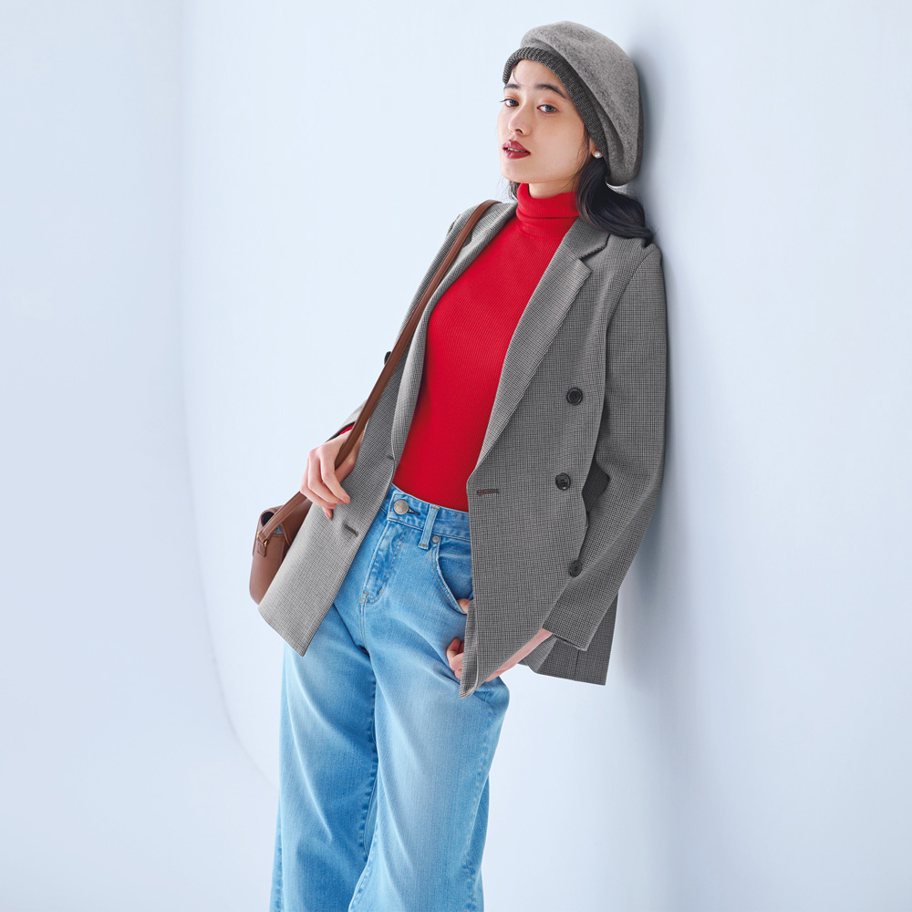 冬のカジュアルスタイル毎日を支える着こなしは、「がんばりすぎずに女性らしくきまる」そんなカジュアルが理想。旬のエッセンスを効かせた扱いやすいアイテムで、冬の装いの洗練度を高めて。 しなやかに伸びる縦横ストレッチにこだわった、着心地のよい本格テーラードジャケット。メンズライクなダブルのシルエットは、ゆとりがあって着やすく、大きめのパッチポケットと脇のマチ使いがすっきり見えをアシスト。なめらかな風合いはアルガンオイル加工ならではのリッチ感です。