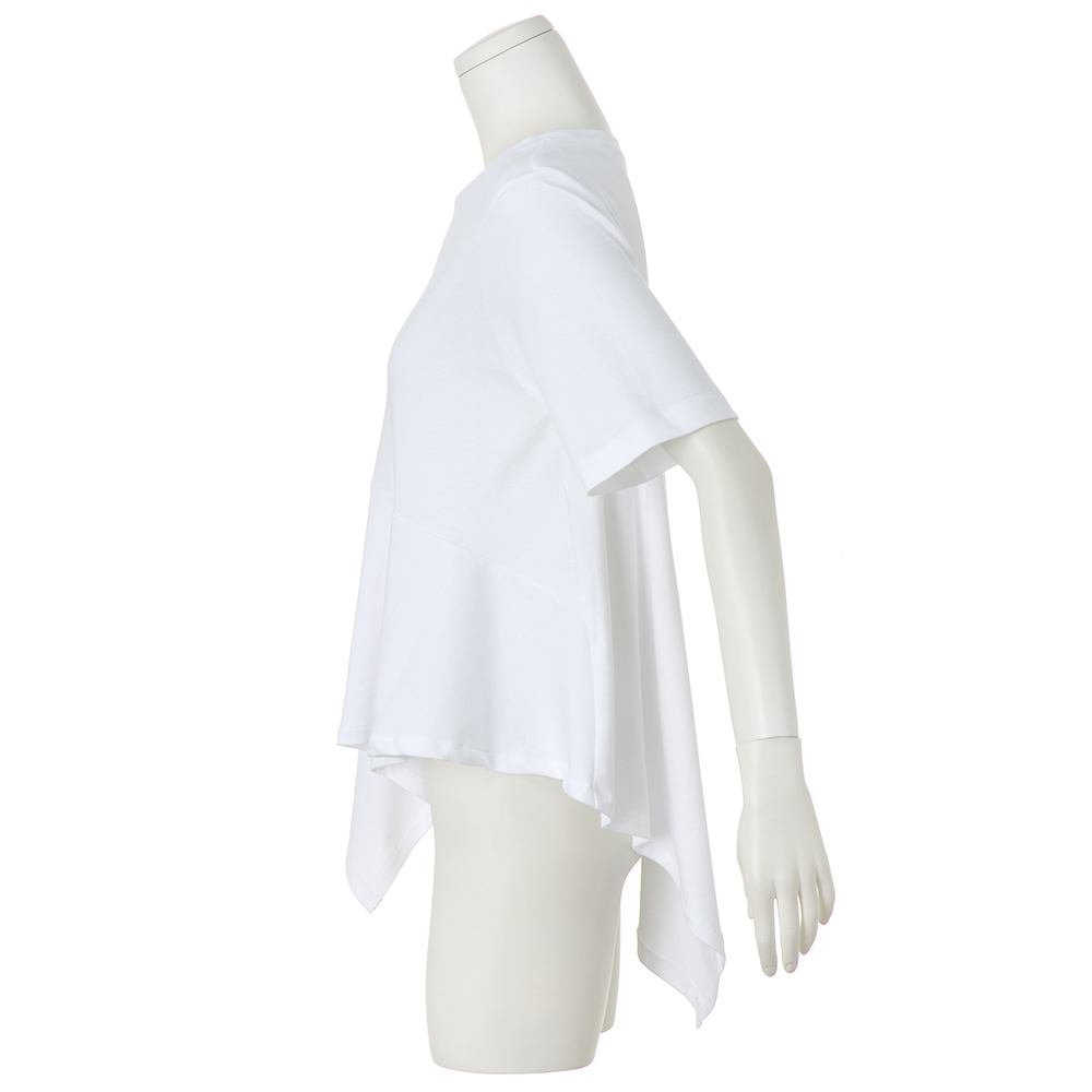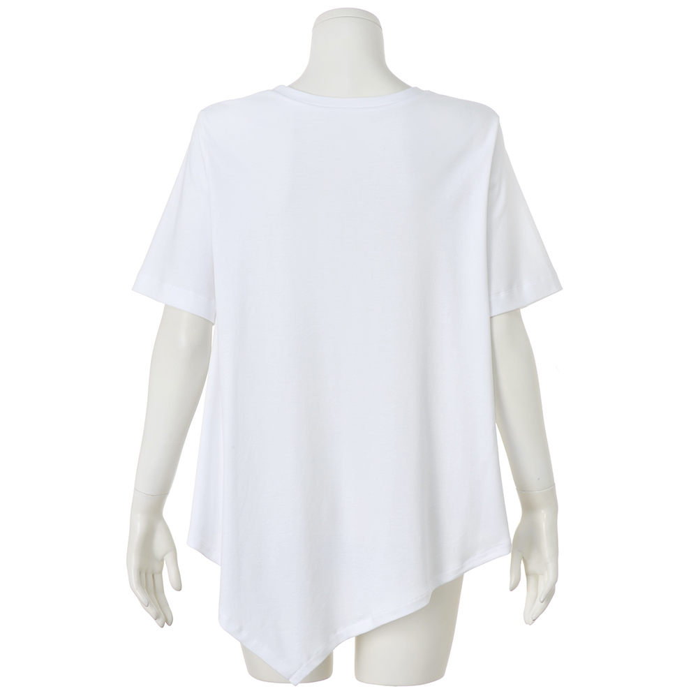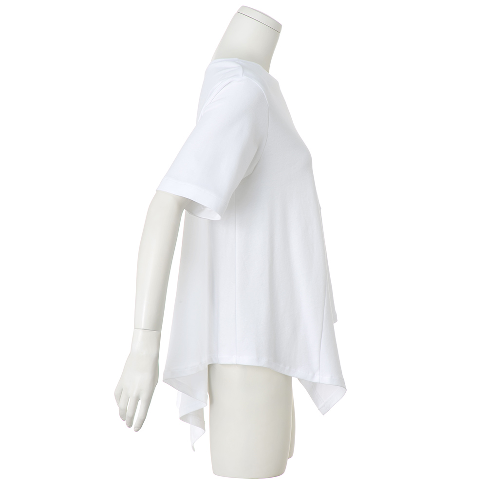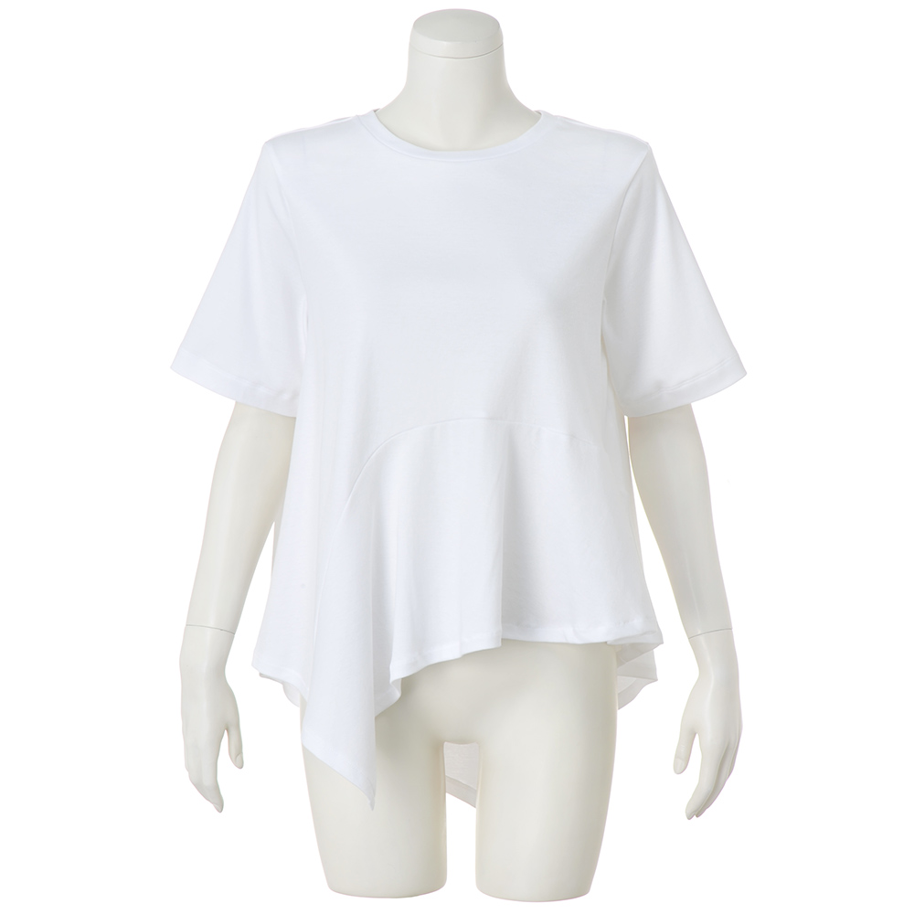 前身頃がアーチ型の切り替えにフレアラッフルをほどこした、アシンメトリーなデザイン。お腹まわりのラインをぼかし、少し長めの5分丈袖で二の腕をカバーしてくれます。バックはすっきり見えする、Aラインシルエット。シンプルなボトムに合わせるだけで洒落感を演出します。コスメプラス(R)とはマリンコラーゲンやシルクプロテインなど肌にやさしい「コスメプラス(R)加工」をほどこした、しっとりなめらかな着心地。綿100%で、きめ細かく上品な艶感が特徴です。