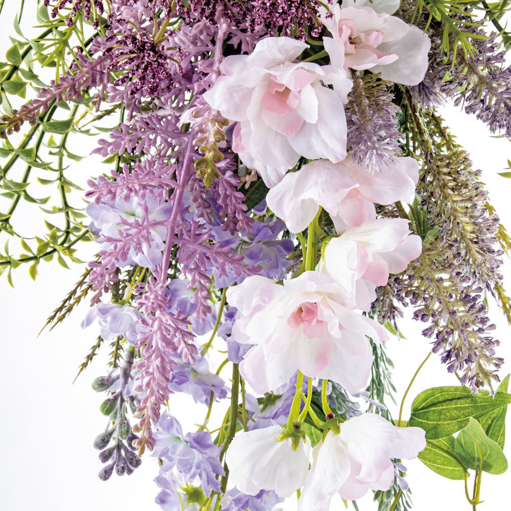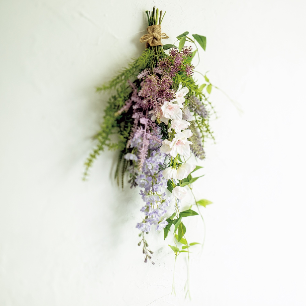 まるでナチュラリスティックガーデンから摘んできたようなスワッグ。宿根草やグラスをふんだんに使って植物本来の姿と四季の庭を愉しむナチュラリスティックガーデン。その素朴で美しい空気感をインテリアに運びます。〈使用花材〉デルフィニウム、タイム、グラス、他
