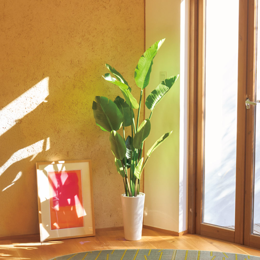 どこに置いても絵になるから、家中で活躍。リアルなグリーン感で大きな葉が魅力のストレリチアの存在感は、玄関やリビングに華やぎと品格を演出します存在感のあるグリーンで空間を演出ストレリチアスリムプランターは、リアルなグリーンの質感と大きな葉が特長のフェイクグリーンです。玄関やリビングに設置するだけで、空間をスタイリッシュに彩ります。限られたスペースにも置きやすいスリムなデザインなので、マンションや省スペースなお部屋にもおすすめです。お手入れ不要で美しさが長持ち水やりや土の入れ替えが不要なため、忙しい毎日でも気軽にグリーンのあるインテリアを楽しめます。本商品の葉や枝は、リアルな質感にこだわって作られており、長期間、美しい状態をキープします。本体には陶器鉢が付属しており、彩光石もセットになって高級感も演出します。フェイクグリーンで清潔な暮らしフェイクグリーンは虫が発生しにくく、お子様やペットのいるご家庭にも取り入れやすいアイテムです。常に清潔で美しい状態を保てるので、グリーン初心者の方にも安心してご使用いただけます。インテリアグリーンで印象アップナチュラルなインテリアコーディネートや、空間のアクセントとして活躍するストレリチアスリムプランター。設置場所を選ばず、すっきりとした印象を与えられます。