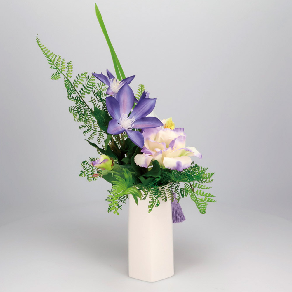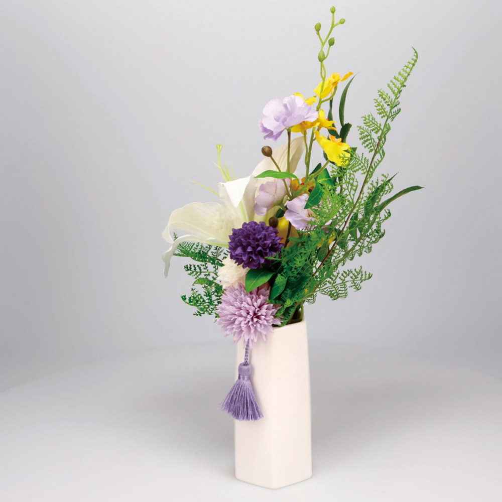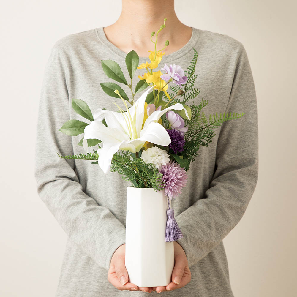【ディノスオリジナル】今回準備数:(ア)68点(イ)92点フラワーベースに活けるように飾る、生花さながらの存在感ある花束。しっかりお花を手向けたい方におすすめ!普段はこの花束を飾り、命日や法要時には生花に替える、そんな使い方も◎。仏花らしすぎない花材の組み合わせが素敵です。気品漂う胡蝶蘭やカサブランカを使ったタッセル付きの上品で華やかな供花です。ボリューム感があるので、お仏壇だけでなく、仏間に置いても絵になります。花器は光沢感のあるシンプルな六角形の花器にすることで、凛とした印象に引き立てます。おすすめポイント●花束と器は別々に使えます。●暑い夏でも寒い冬でも水替えの必要なく、お手入れ不要でいつまでも美しく飾っていただけます。●忙しい方・共働きの世帯や年配の方への贈り物にも重宝されています。●花材:(ア)カサブランカ…カサブランカ、オンシジューム、ポンポンマム、ミニフラワー、サカキ、シダ、タッセル(イ)コチョウラン…胡蝶蘭、テッセン、トルコキキョウ、ポンポンマム、シダ、リーフ、タッセル別品番で、お得な2個セットも販売しております。