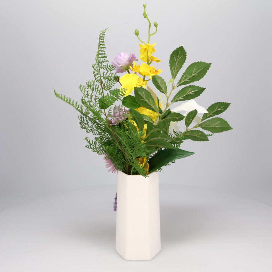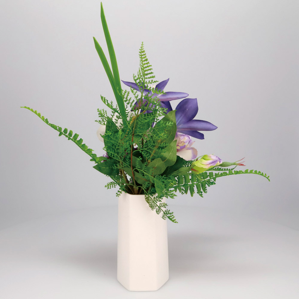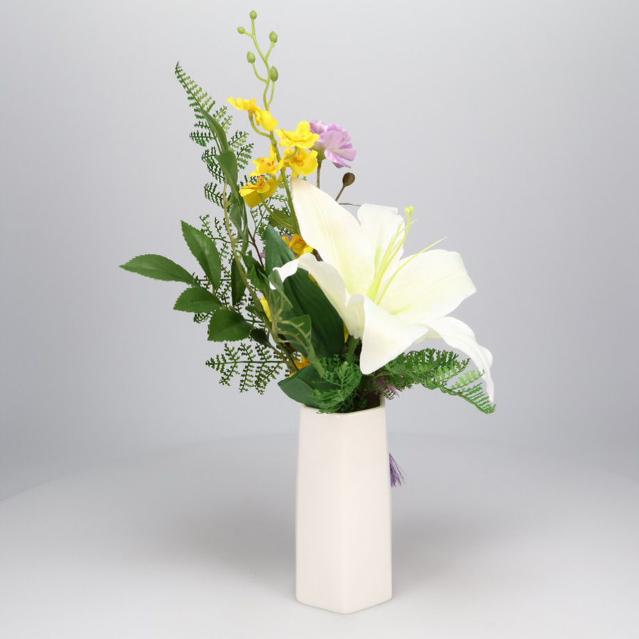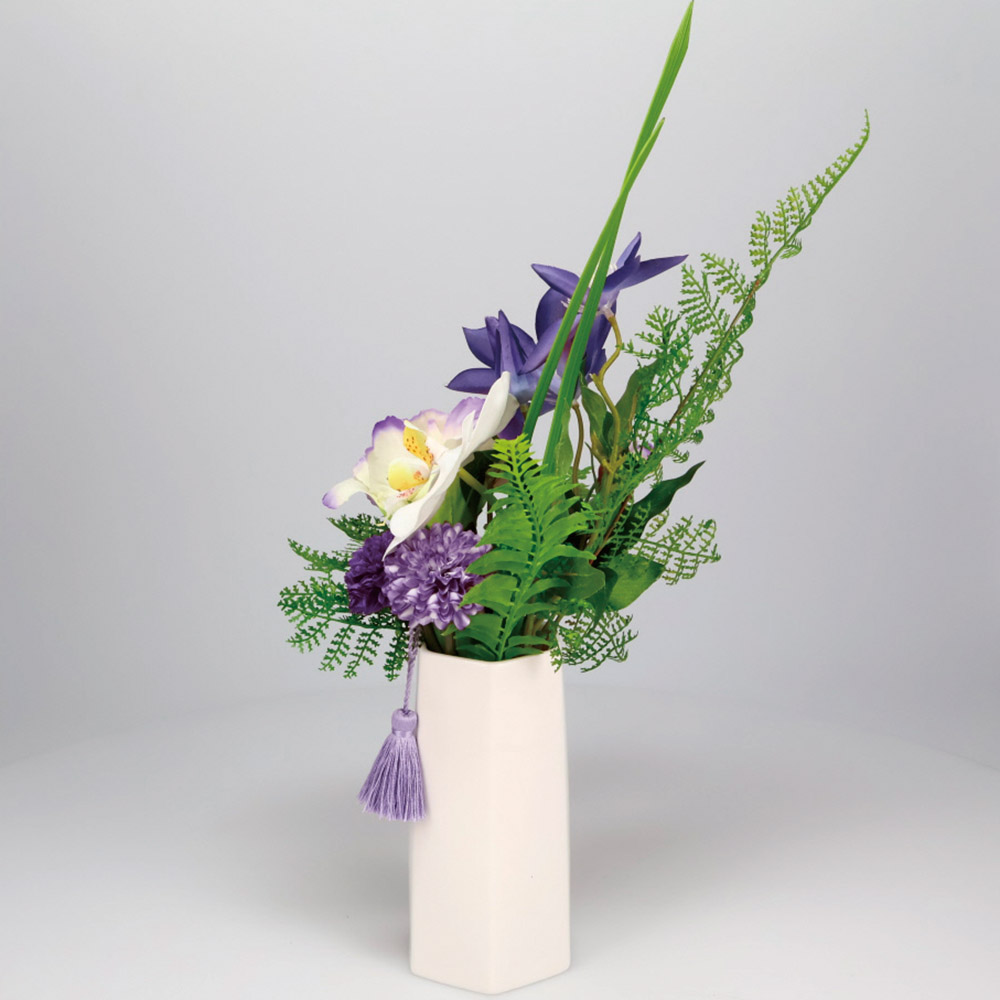 【ディノスオリジナル】今回準備数:(ア)68点(イ)92点フラワーベースに活けるように飾る、生花さながらの存在感ある花束。しっかりお花を手向けたい方におすすめ!普段はこの花束を飾り、命日や法要時には生花に替える、そんな使い方も◎。仏花らしすぎない花材の組み合わせが素敵です。気品漂う胡蝶蘭やカサブランカを使ったタッセル付きの上品で華やかな供花です。ボリューム感があるので、お仏壇だけでなく、仏間に置いても絵になります。花器は光沢感のあるシンプルな六角形の花器にすることで、凛とした印象に引き立てます。おすすめポイント●花束と器は別々に使えます。●暑い夏でも寒い冬でも水替えの必要なく、お手入れ不要でいつまでも美しく飾っていただけます。●忙しい方・共働きの世帯や年配の方への贈り物にも重宝されています。●花材:(ア)カサブランカ…カサブランカ、オンシジューム、ポンポンマム、ミニフラワー、サカキ、シダ、タッセル(イ)コチョウラン…胡蝶蘭、テッセン、トルコキキョウ、ポンポンマム、シダ、リーフ、タッセル別品番で、お得な2個セットも販売しております。