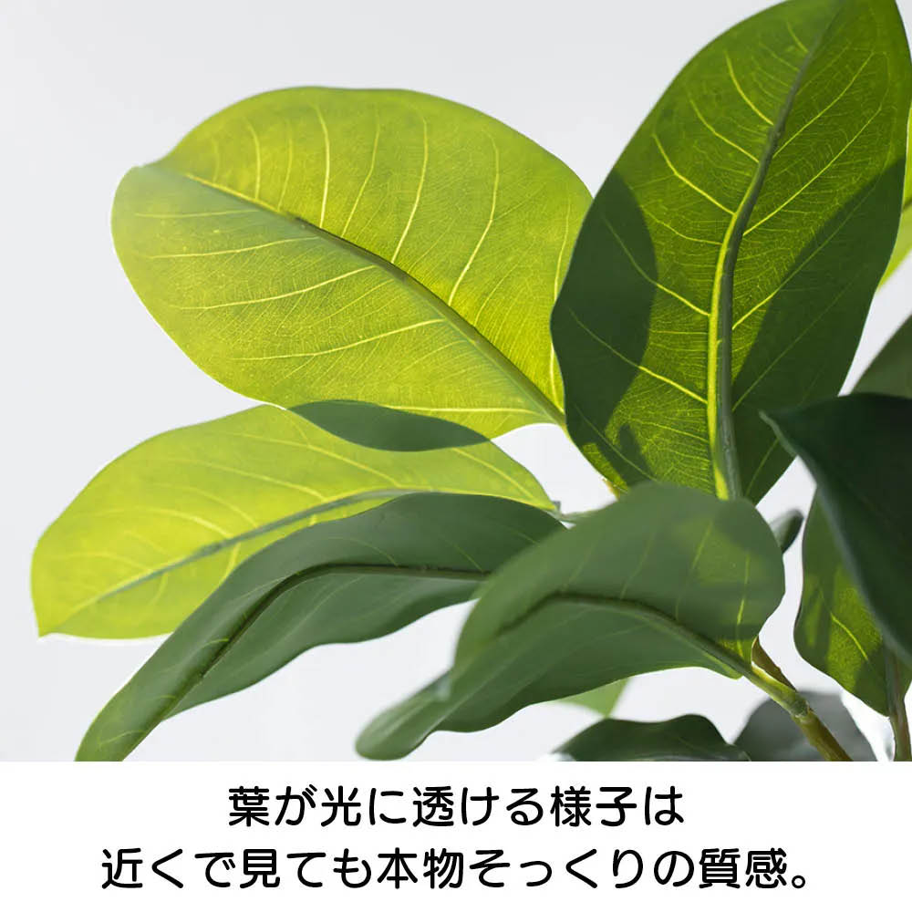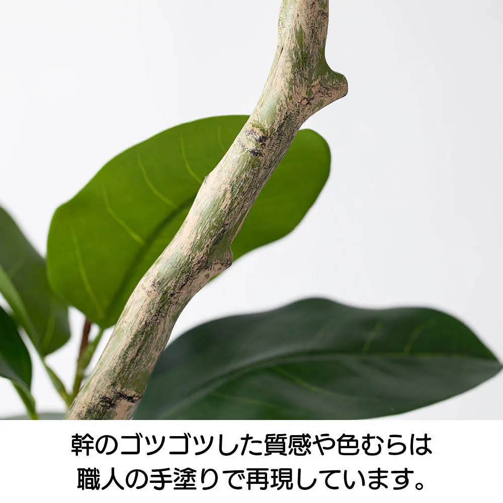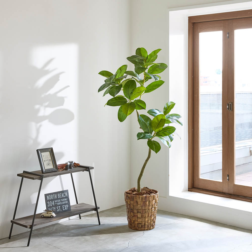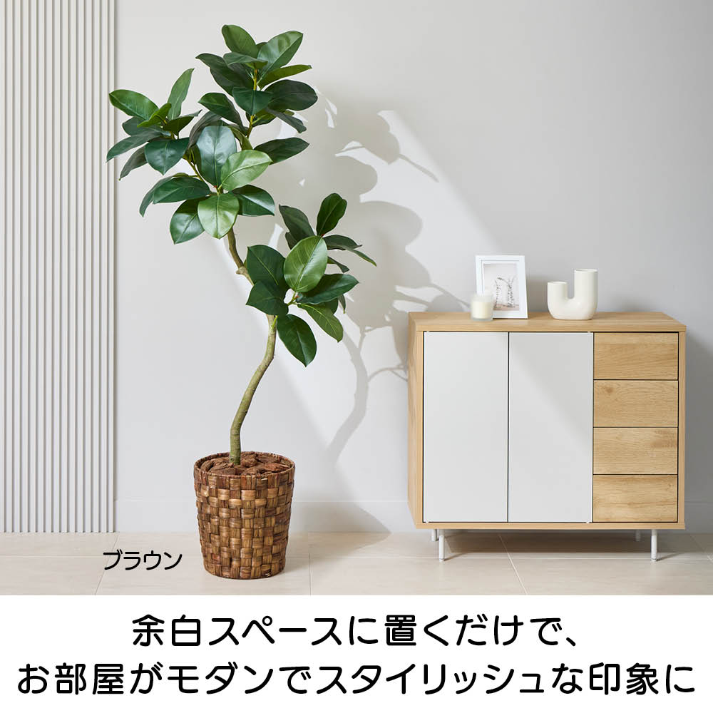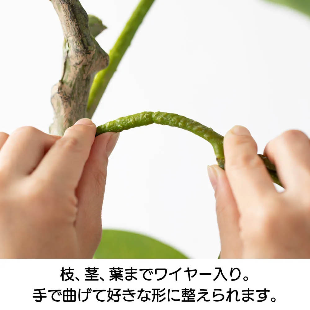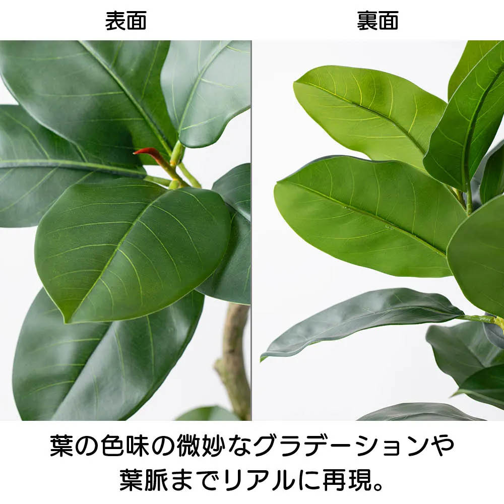 本物そっくりのリアルな質感を職人技で再現した、フェイクグリーン(人工観葉植物)です。お手入れの手間がなく、水やりや虫・枯れの心配もないので、毎日忙しい方や、お部屋にグリーンを初めて取り入れたい方にもぴったりです。艶やかな厚みのある葉が魅力のゴムの木。深みのあるグリーンと堂々とした樹形が、お部屋にスタイリッシュな雰囲気をもたらします。インダストリアルやモダン、ヴィンテージ風のインテリアとも相性が良く、空間のアクセントとしておすすめです。高さは約155cm。リビングや玄関、窓辺などに飾れば、お部屋の印象がグッと引き立ちます。お部屋の雰囲気や好みに合わせて選べる2色の鉢カバー。インテリアに合わせやすいブラウンとホワイトをご用意。シンプルで上質なデザインが空間を美しく引き立てます。葉の色味の微妙なグラデーションや葉脈までリアルに再現。葉ごとに異なる色合いは、本物の植物そのもの。重なり合う若葉の淡いグリーンから深い緑へのグラデーションは、思わず見とれてしまうほど。葉が光に透ける様子は近くで見ても本物そっくりの質感。光にかざすと透ける葉の質感、裏から見ても美しい葉脈は近くで見ても感動もの!丁寧な作りに植物の息遣いまで聞こえてきそう。幹のゴツゴツした質感や色むらは職人の手塗りで再現しています。一本一本、職人が手塗りで仕上げた幹は、絶妙な色の濃淡や質感が本物の樹木のような存在感を放ちます。枝、茎、葉までワイヤー入り。手で曲げて好きな形に整えられます。すべての枝や葉にはワイヤーが入っているため、簡単に好きな形に整えることができます。空間に映える存在感。ひと鉢でお部屋にメリハリをプラス高さ155cmの堂々としたフォルムは、飾るだけでお部屋の雰囲気を引き締めてくれます。置くだけで、お部屋が温かくスタイリッシュに深みのあるグリーンと光沢の美しい葉が、お部屋に落ち着きとあたたかみを添えます。まるで本物のようなリアルな質感で、空間全体が一段とモダンでおしゃれな印象に。