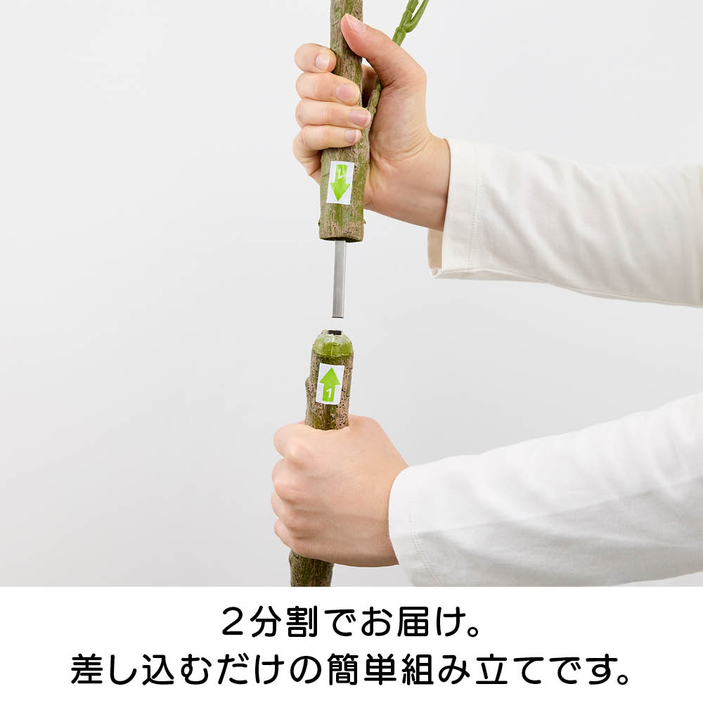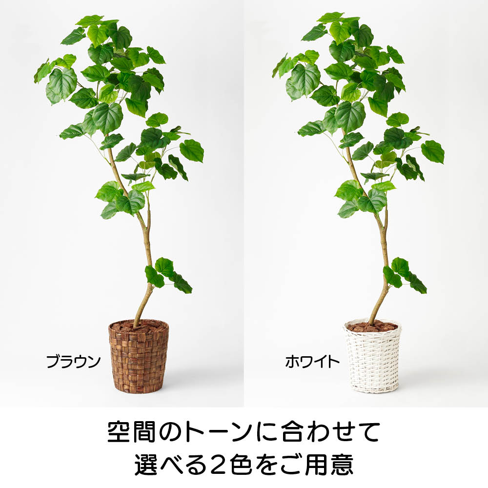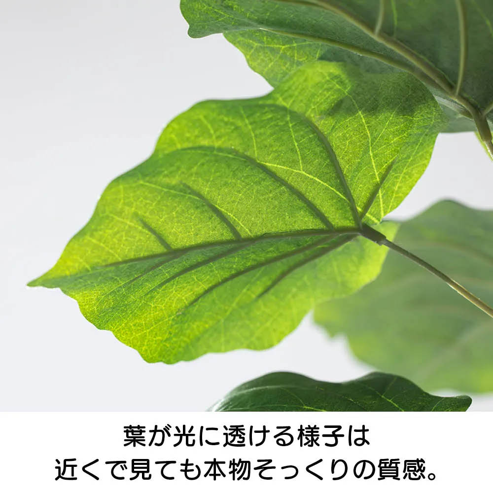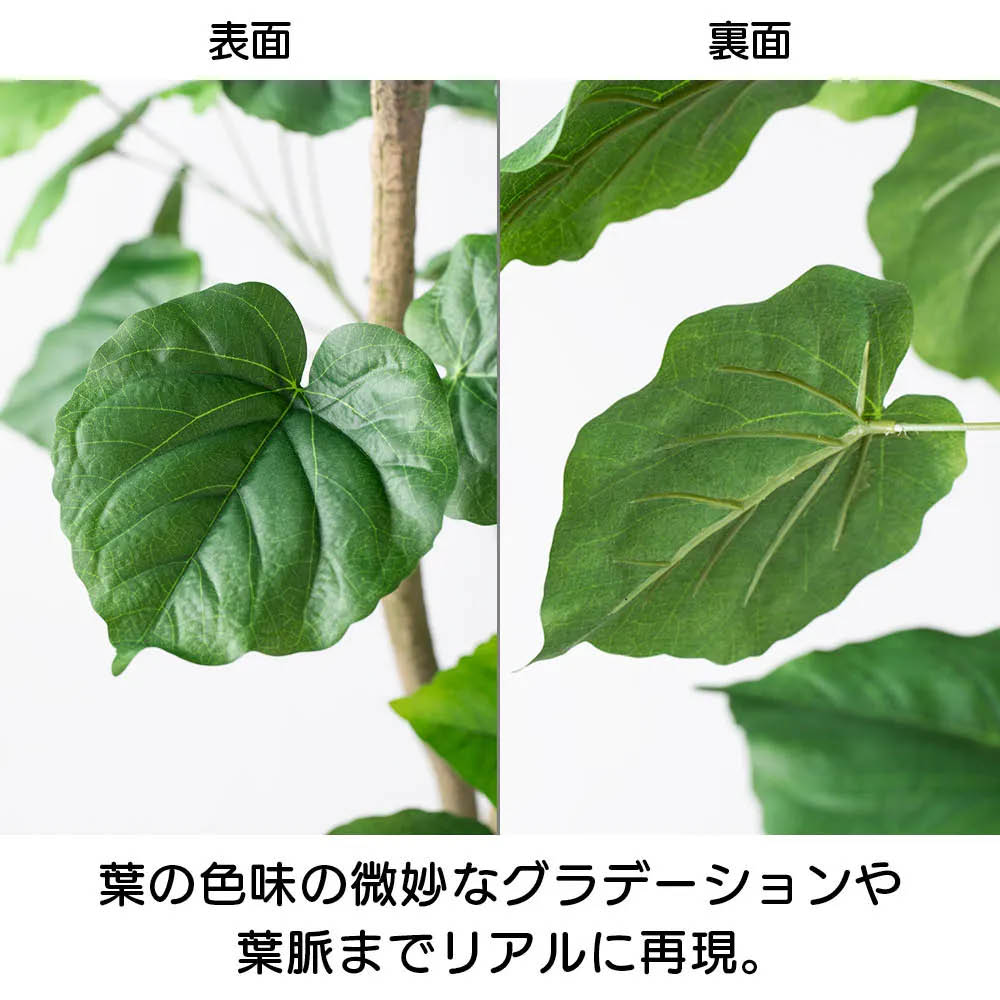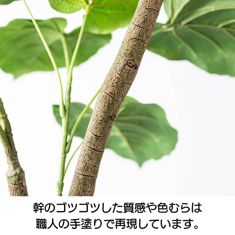 本物そっくりのリアルな質感を職人技で再現した、フェイクグリーン(人工観葉植物)です。お手入れの手間がなく、水やりや虫・枯れの心配もないので、毎日忙しい方や、お部屋にグリーンを初めて取り入れたい方にもぴったりです。大きなハート型の葉が印象的なウンベラータ。やわらかなグリーンが、空間にやさしい温もりを運んでくれます。北欧テイストやリラックスした雰囲気のお部屋、木目調の家具とも相性よく、リビングやダイニングの雰囲気づくりにおすすめです。高さは約185cm。お部屋のアクセントにはもちろん、リビングを中心に、広めの空間や窓辺のコーディネートにもよく映えます。空間のトーンに合わせて選べる2色をご用意インテリアに合わせやすいブラウンとホワイトをご用意。シンプルで上質なデザインが空間を美しく引き立てます。葉の色味の微妙なグラデーションや葉脈までリアルに再現。明るいグリーンから濃いグリーンへ、美しい葉のグラデーションを再現。陽光に浮かび上がる繊細な葉脈まで丁寧に作り込みました。ウンベラータの軽やかな印象そのままに、暮らしに潤いと癒しを演出してくれます。葉が光に透ける様子は近くで見ても本物そっくりの質感。陽光を受けてほんのり明るく透ける葉の質感や、裏側の葉脈までリアルに表現された丁寧な作りが魅力です。間近でも見ても本物と見間違えしまう上質な仕上がり。幹のゴツゴツした質感や色むらは職人の手塗りで再現しています。ここまで寄ってもリアル。一本一本、職人が手塗りで仕上げた幹は、絶妙な色の濃淡や質感が本物の樹木のような存在感を放ちます。枝や葉にワイヤーを仕込んでいるため、お好みの樹形に整えられますすべての枝や葉にはワイヤーが入っているため、簡単に好きな形に整えることができます。空間に伸びやかな躍動感。ひと鉢でお部屋に広がりをプラス高さ185cmのゆったりとしたシルエット。大きな葉がやさしく広がり、お部屋に開放感を生み出します。置くだけで、お部屋がやさしく洗練された空間に大ぶりのハート型の葉と伸びやかな枝ぶりが、お部屋にやさしさと抜け感をもたらします。まるで本物のようなリアルな質感で、空間全体が明るく洗練された印象に。