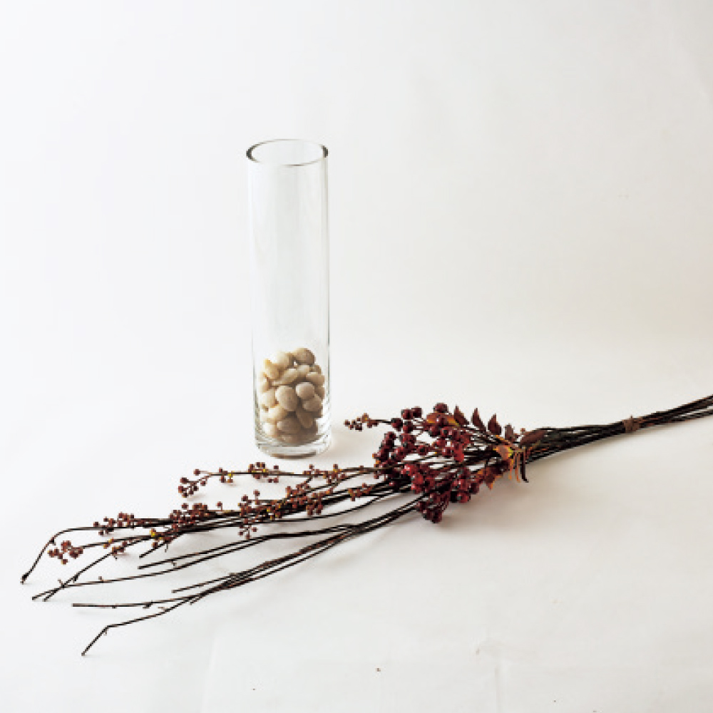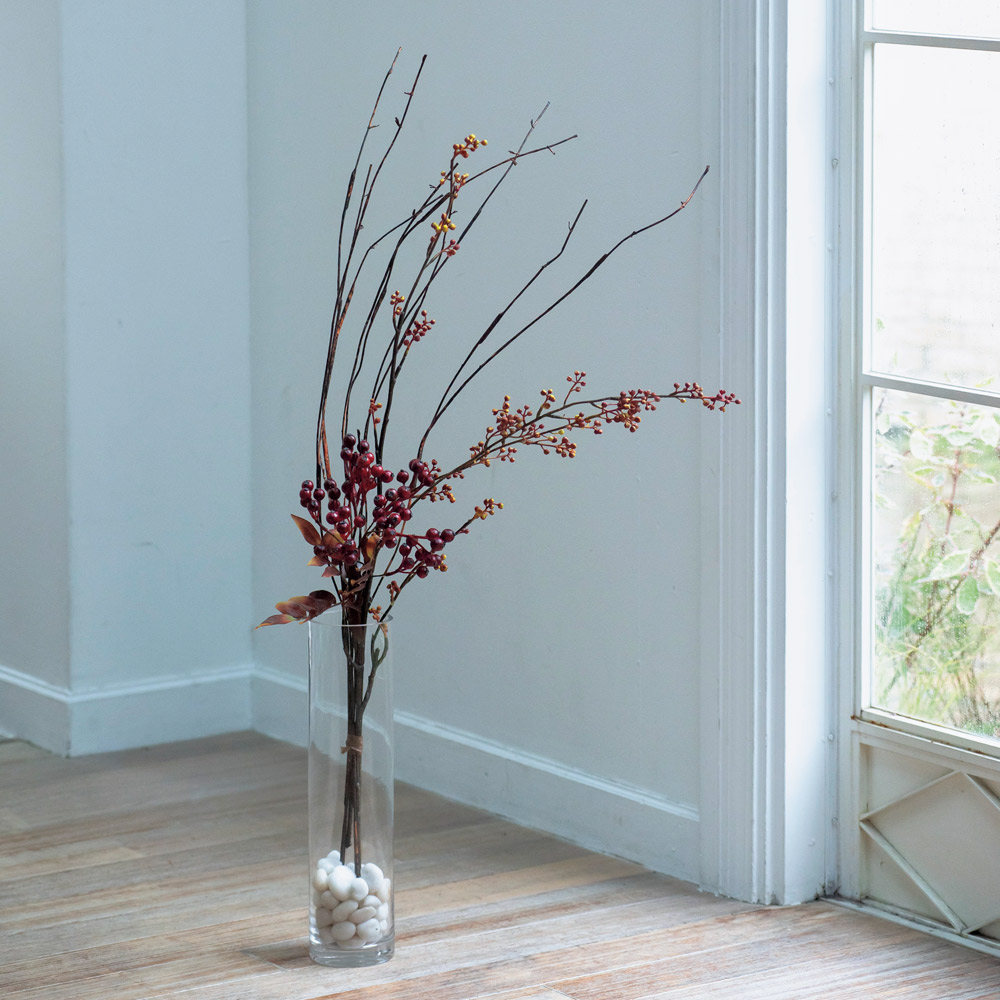 ローズヒップの実が愛らしい枝ものアレンジメント秋冬に枝先に実るバラのローズヒップと、しなやかに長く伸びる柳の細枝をシンプルに投げ入れたアレンジメント。レッド〜ブラウンの色合わせが落ち着いた秋冬のインテリアを温かく彩ります。