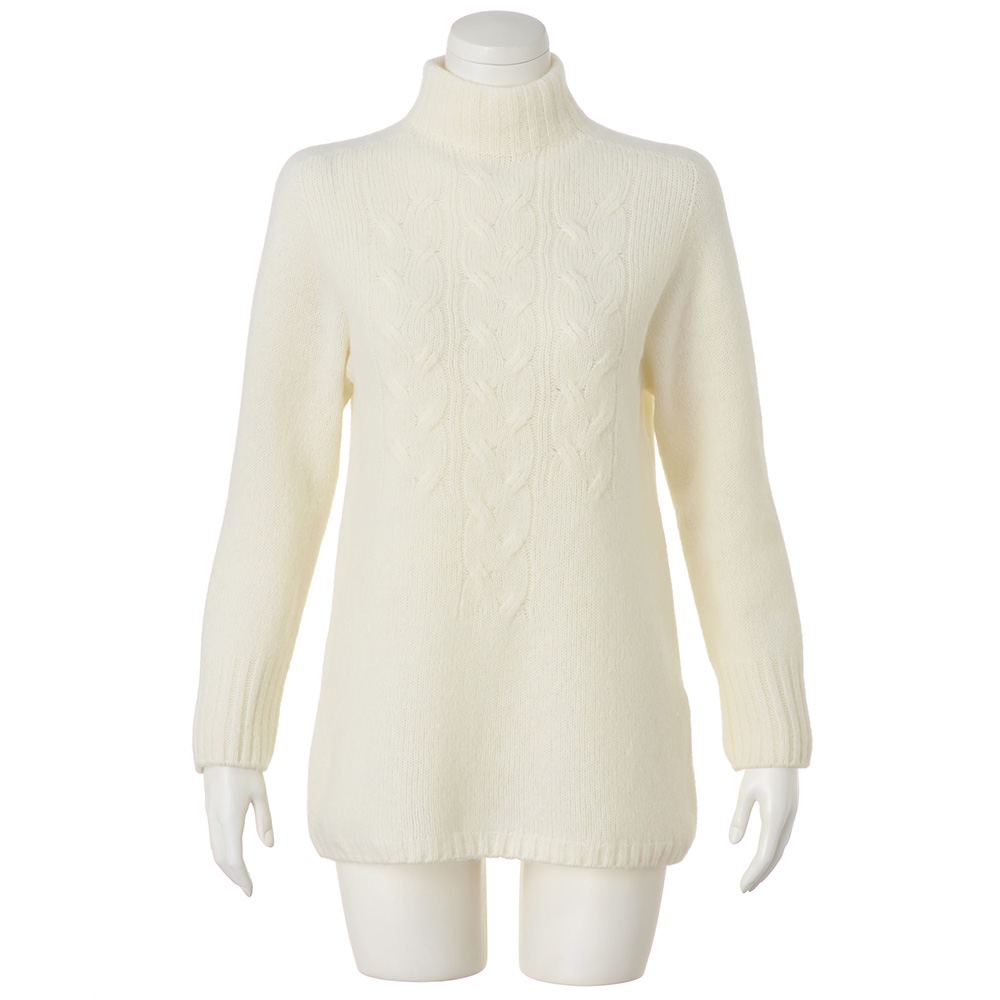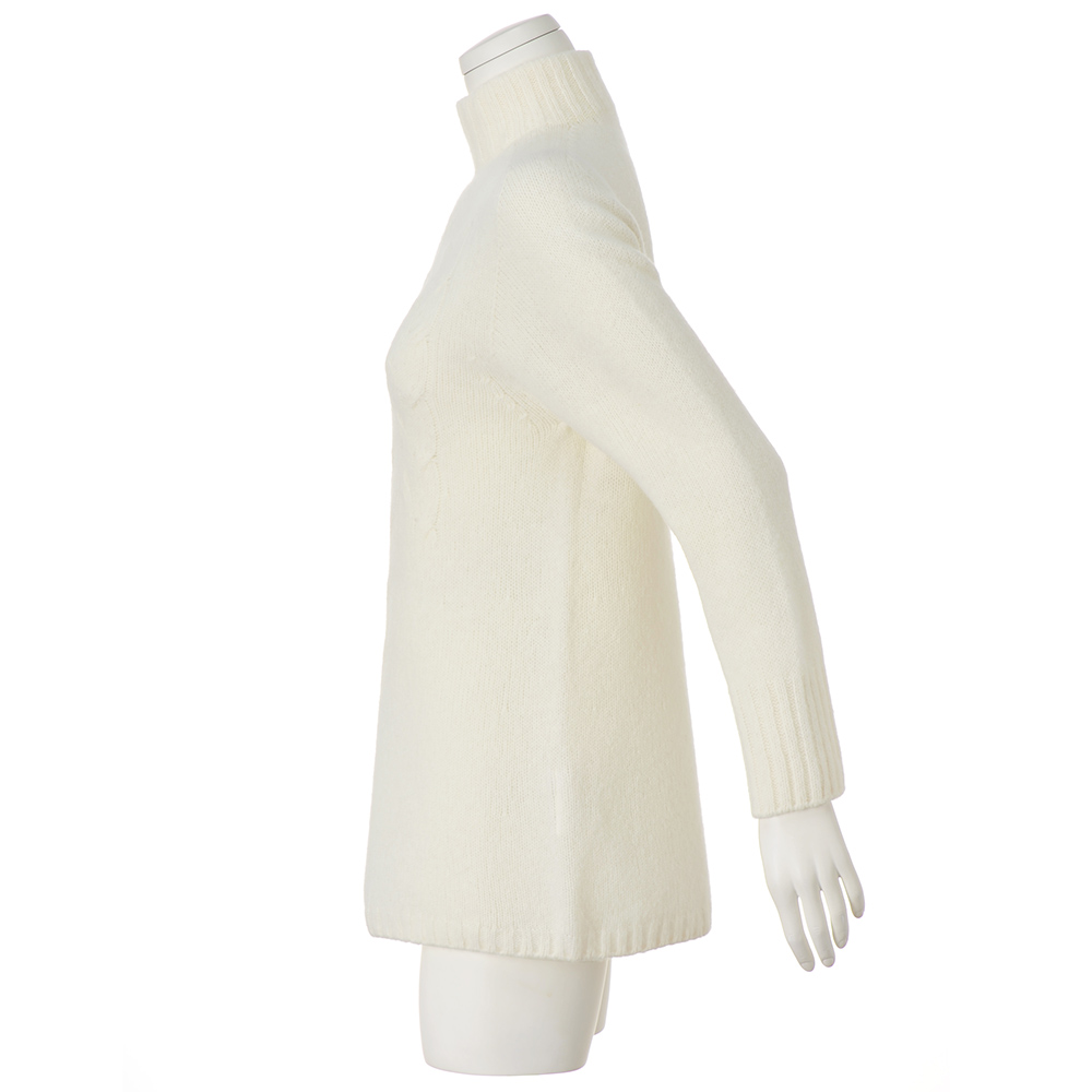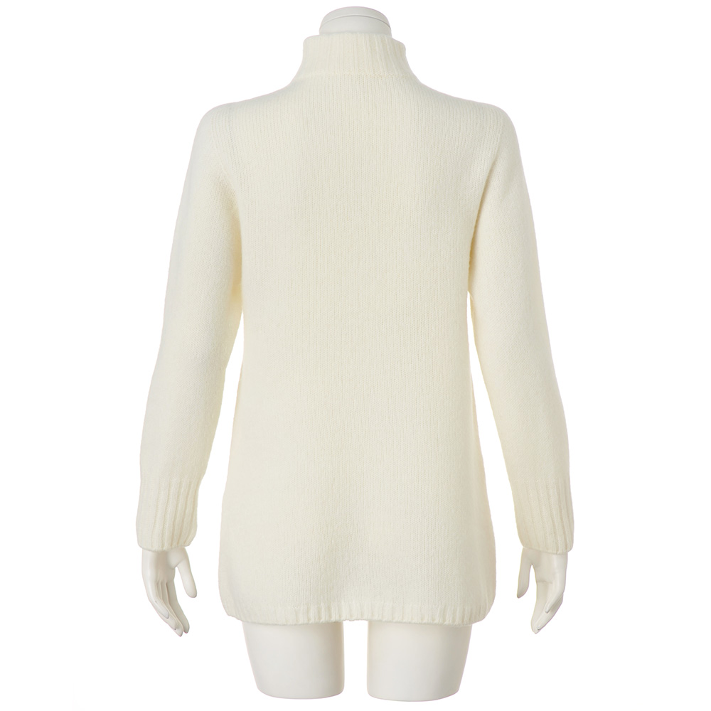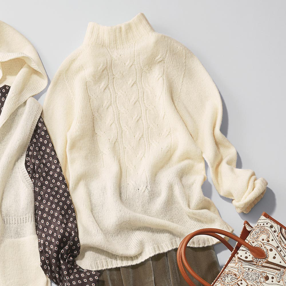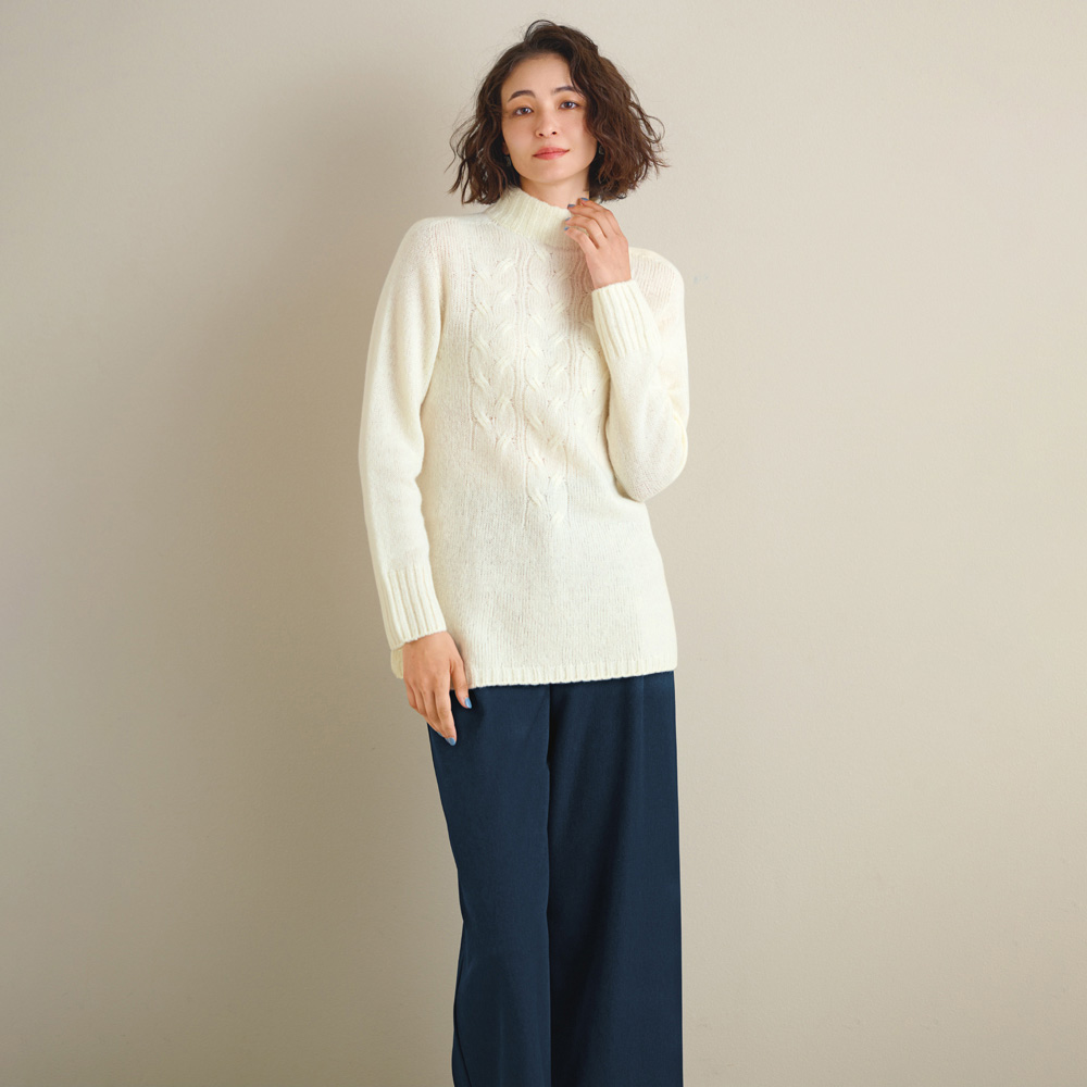 STORY CLOTHESエターナルな魅力は背景のあるモノ作りにあり。こだわりの生地選び、すっきり見せるパターンなど、作り手のこだわりが随所に感じられるアイテムをご紹介します。日本の紡績技術から生まれた軽い糸を立体的に編み上げた、ふんわりニットエアーヤーンという空気を多く含んだ軽いウール混糸を使い、ホールガーメント(R)で一着丸ごと編み立てたニット。糸も編み方もこだわっているから、通常のウールのニットにくらべて軽やかな着心地を感じられるはず。冬映えするケーブル編みをポイントに、着るだけでキャッチーにきまるプルオーバーホールガーメント(R)によりハイネックまで編み続きで、すっきり。ハイネックプルオーバーは、中心にケーブル柄を入れてジレ(商品番号:135401)と合わせても隠れずポイントになるようにデザイン。アンサンブル着用はもちろん、単品使いでも着回ししやすいので便利にお使いいただけます。また、一着丸ごと編み立てるため、生産時に糸ロスが少ないというエコな点にも注目です。