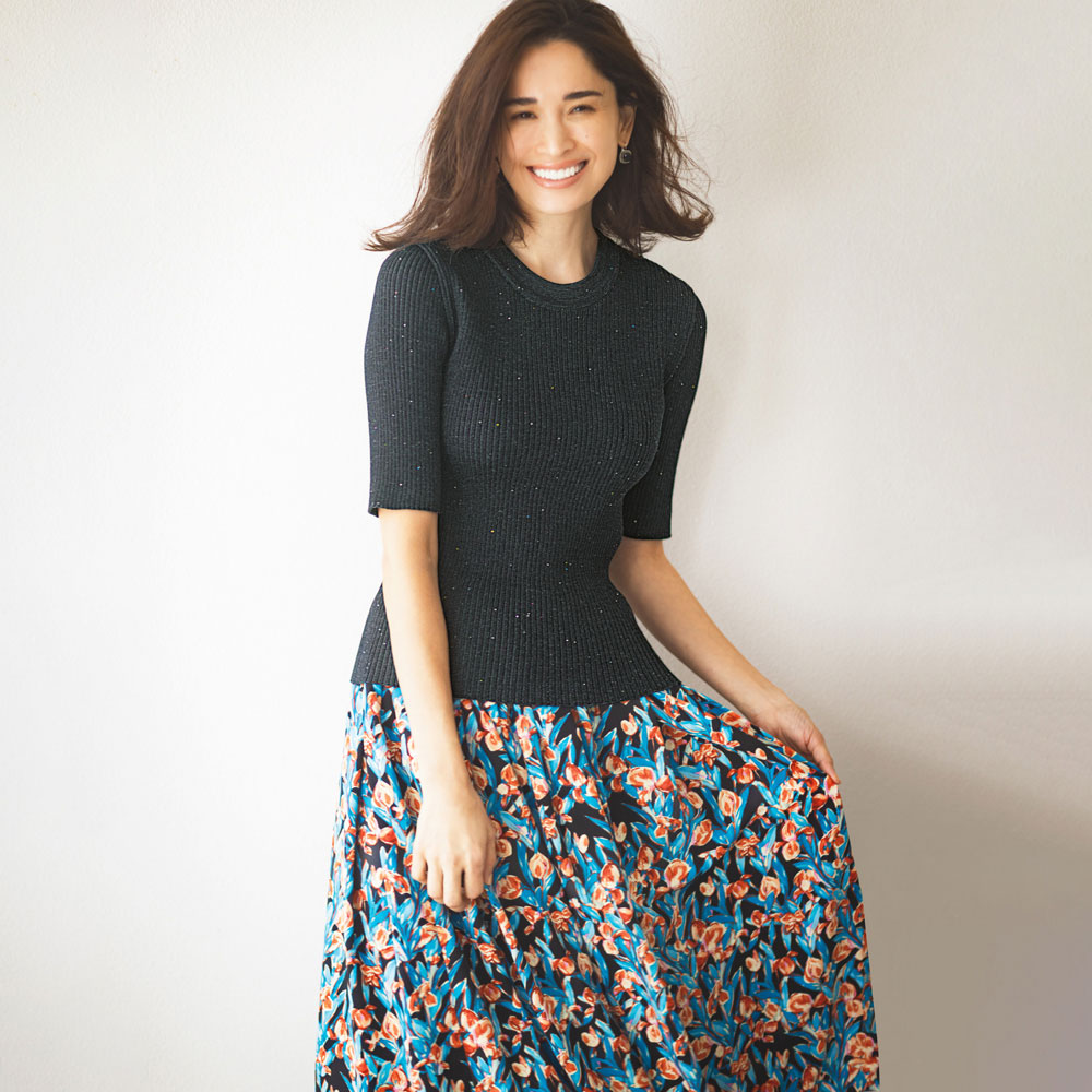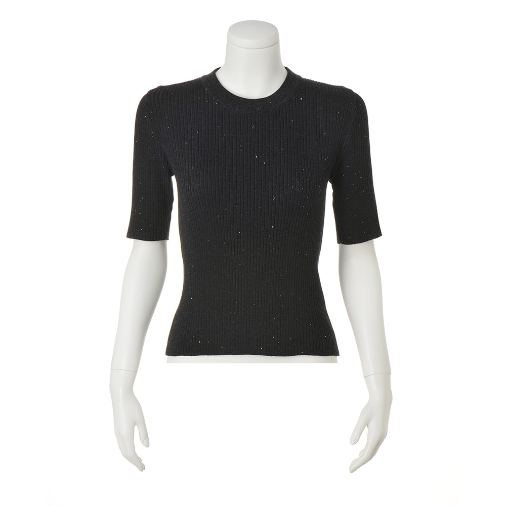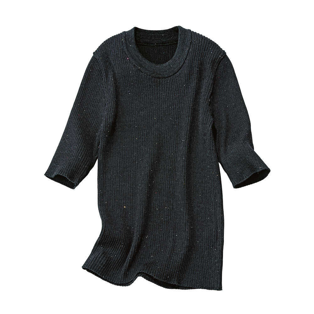 極小スパンコールを紡績した糸で編み上げた、リブニットプルオーバー。肌へのあたりは気にならず、光を反射するきらめきが上品なアクセントを加えます。首元はリブ幅を太めにとったクルーネックでトレンドを加味。二の腕をさりげなくカバーする5分袖は、冬はもちろんシーズンレスで着回せます。