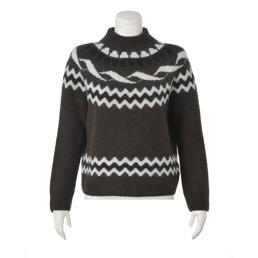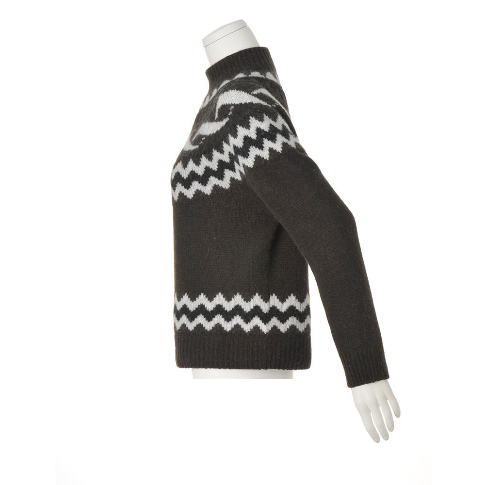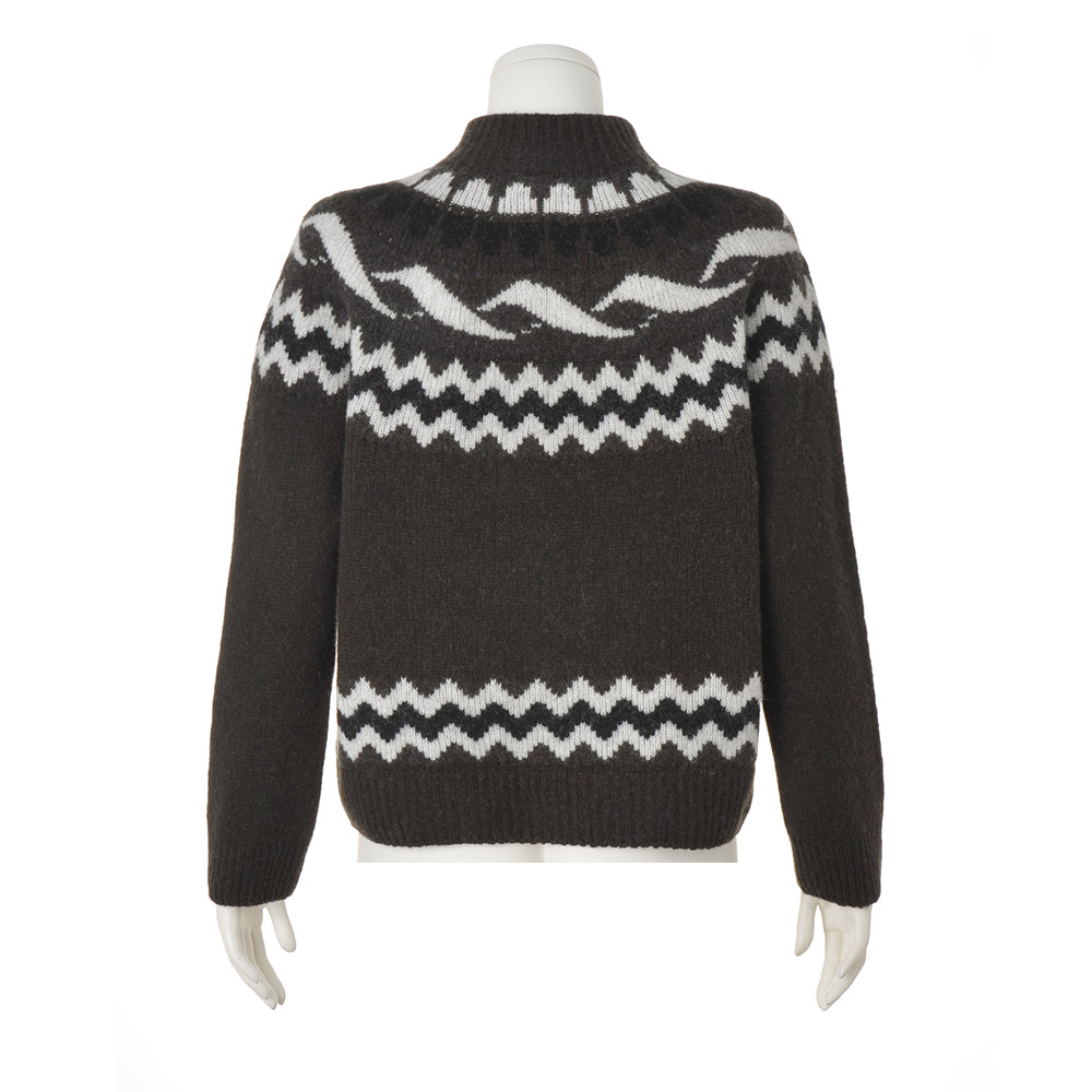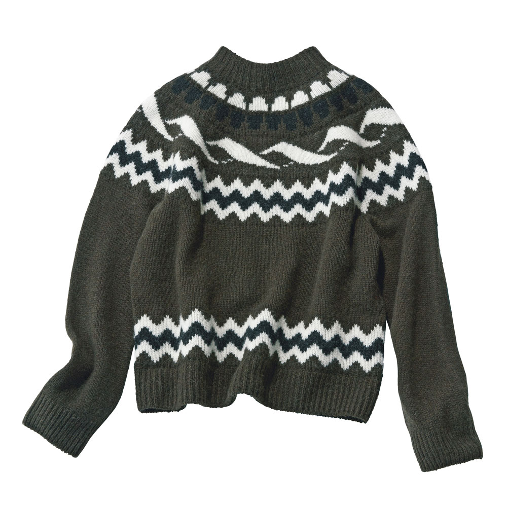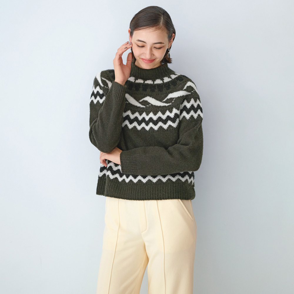 テクニックデザインニット目新しいものをお探しの方は必見!一着で主役になれる、デザインニットにクローズアップ。ベーシックなボトムに合わせるだけで、旬のコーディネートが即完成します。トレンドのノルディック柄はシックな色使いがキーワード肩まわりと裾に放射線状にノルディック柄をデザイン。首元が詰まっているので、ほっこりしすぎずモードに着られます。ホールガーメント(R)でサステナブル、さらにリンキングのゴワつきがないため伸びやかで着心地◎。日本製ならではの上質さも魅力です。