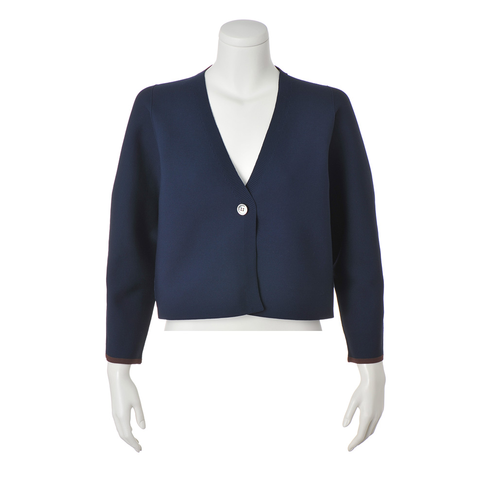 カーディガンの襟裏にもラインを効かせてアクセントに。