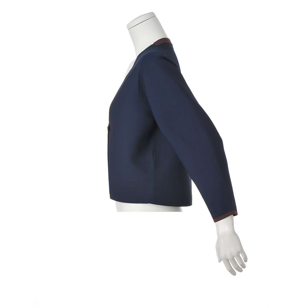 “抜け感”を楽しむ、品格きれいめスタイル毎日に寄り添いながら、きちんと感も華やかさも欲張れる。女性らしさを引き出し、品よく着映える「大人のおでかけ服」に、今年らしいエッセンスを加えました。構築的なフォルムに配色の存在感で、ほんのりモードな装いにホールガーメント(R)仕立てで糸ロスが少なく、環境にもやさしいニット。伸縮性があり着心地はふんわり軽やか。適度な反撥力で立体的なシルエットを叶えました。同素材のスカート(商品番号:147803)とブラウンの配色ラインでリンク。単品でもセットアップでも、着こなしの印象度を高めます。