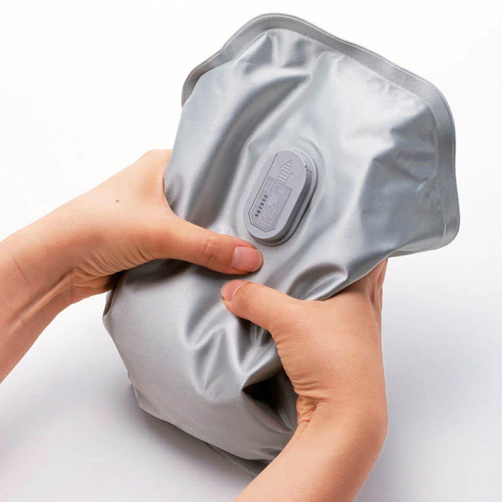 カバーから本体を取り出し、専用プラグに挟んで充電。15分程度で蓄熱完了。