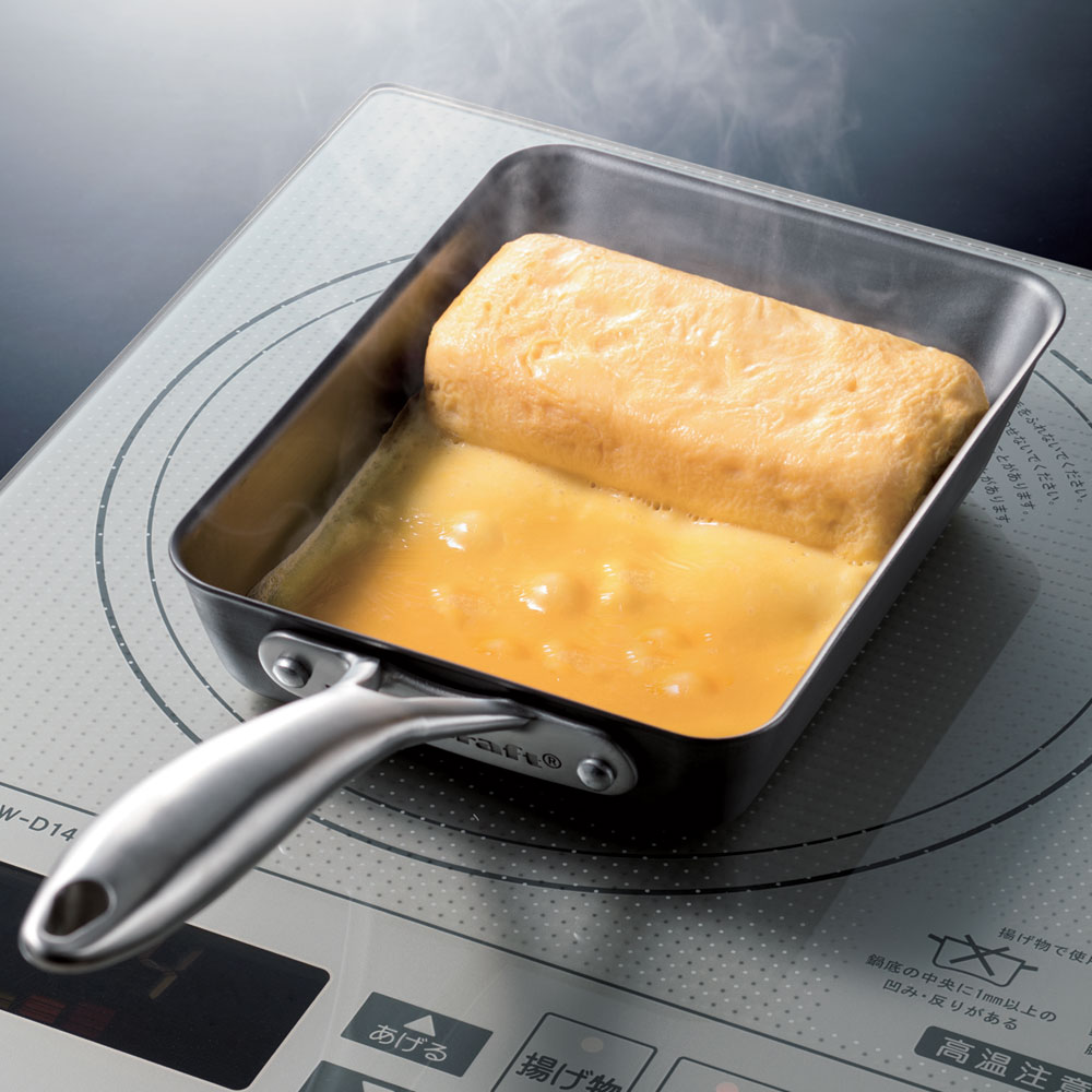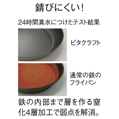ビタクラフトの自信作!鉄なのに錆びにくく、面倒なお手入れも不要の鉄の玉子焼き器。玉子焼き以外にも四角いケーキも作れます。鉄なのに錆びにくい「窒化4層加工」料理が美味しく仕上がる鉄フライパンの魅力をそのままに、鉄の弱点「錆びやすさ」をクリアしたのが、ビタクラフト独自の「窒化4層加工」。錆びが大敵の船舶や航空機に使われる加工技術を応用し、鉄の内部に窒素を浸透させ表面強度を高めることで、錆びにくい強靱なフライパンを完成させました。窒化加工によってできた表面の凹凸が油の吸収性を高め、使えば使うほど油がなじみ、より使いやすいフライパンに育っていきます。焼き物はきれいな焼き色に、炒め物はシャキッとした仕上がりに。Made in Japan 品質本体の成形から窒化加工、表面仕上げ、部品の取り付け、最終検品まで、全ての工程を一貫して国内で行っています。熟練された職人の技術と、ビタクラフトの徹底した品質管理によって生まれた、信頼の「Made in Japan」製品です。面倒なお手入れは不要窒化加工を施しているため、使い始める際の焼き入れや、使用後の油引きなど、従来の鉄フライパンに必須だった面倒なお手入れは全く必要ありません。鉄フライパンが初めての方でも安心してご使用いただけます。使えば使うほど表面に油がなじみ、こびりつきにくくなるので、使った後はぬるま湯でさっと洗うだけで大丈夫です。使いやすいステンレス製ハンドルハンドルは高級感のあるステンレス製。耐久性が高く、劣化の心配がありません。手になじんで持ちやすく、熱くならないよう中が空洞になっています。本体とはリベットで取り付けられ、非常に頑丈。窒化加工により接合部が錆びにくく、安心・安全です。丈夫で長持ちガスはもちろん、200VのIHクッキングヒーターなどの熱源にも対応。コーティングフライパンとは違って性能が劣化したり剥がれることがなく、金属製のキッチンツールやヘラの使用も可能です。幅広いサイズ展開底面が広く、目玉焼き・ハンバーグ・餃子・魚・ステーキ・ホットケーキ・お好み焼き等の焼き物に最適な「フライパン」、野菜炒め・チャーハン・焼きそば・中華料理等の炒め物に最適な深型の「炒め鍋」、お弁当作りに大活躍の「エッグパン」の計3種類をラインアップ。ディノスでは単品で、フライパン22・24・28・30cmを、炒め鍋20・24・26・28cmを取り揃えており、セットでは、フライパン20cmと炒め鍋22cm、フライパン24cmと炒め鍋28cm、フライパン20cmと26cmの3パターンをご提供中です。焼く・炒めるそれぞれの用途で使い分けていただくとスムーズな調理が可能ですが、フライパンから購入し、買い足す際に炒め鍋、という順番も◎。■Vita Craftについて1939年にアメリカで創業されたビタクラフト。社名は、ビタミン(ビタ)を逃さない手作り(クラフト)の鍋であることから、その名が付いた。当時、ロケットの部品用に開発された金属同士を接着させた熱伝導の良い金属板を鍋に応用。創業当時から変わらぬ「家族の健康は家庭料理で守っていく」という考えにもとづき、今なお、一つひとつ熟練されたクラフトマンの手により成型、仕上げ、品質チェックが行われ、世界中へと届けられている。