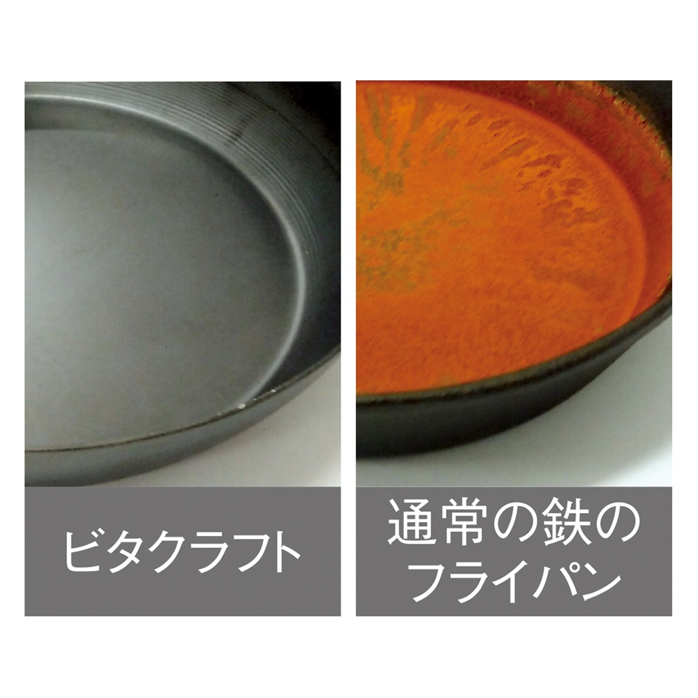 ビタクラフトの自信作!鉄なのに錆びにくく、面倒なお手入れも不要の鉄フライパンです。鉄なのに錆びにくい「窒化4層加工」料理が美味しく仕上がる鉄フライパンの魅力をそのままに、鉄の弱点「錆びやすさ」をクリアしたのが、ビタクラフト独自の「窒化4層加工」。錆びが大敵の船舶や航空機に使われる加工技術を応用し、鉄の内部に窒素を浸透させ表面強度を高めることで、錆びにくい強靱なフライパンを完成させました。窒化加工によってできた表面の凹凸が油の吸収性を高め、使えば使うほど油がなじみ、より使いやすいフライパンに育っていきます。焼き物はきれいな焼き色に、炒め物はシャキッとした仕上がりに。Made in Japan 品質本体の成形から窒化加工、表面仕上げ、部品の取り付け、最終検品まで、全ての工程を一貫して国内で行っています。熟練された職人の技術と、ビタクラフトの徹底した品質管理によって生まれた、信頼の「Made in Japan」製品です。面倒なお手入れは不要窒化加工を施しているため、使い始める際の焼き入れや、使用後の油引きなど、従来の鉄フライパンに必須だった面倒なお手入れは全く必要ありません。鉄フライパンが初めての方でも安心してご使用いただけます。使えば使うほど表面に油がなじみ、こびりつきにくくなるので、使った後はぬるま湯でさっと洗うだけで大丈夫です。使いやすいステンレス製ハンドルハンドルは高級感のあるステンレス製。耐久性が高く、劣化の心配がありません。手になじんで持ちやすく、熱くならないよう中が空洞になっています。本体とはリベットで取り付けられ、非常に頑丈。窒化加工により接合部が錆びにくく、安心・安全です。丈夫で長持ちガスはもちろん、200VのIHクッキングヒーターなどの熱源にも対応。コーティングフライパンとは違って性能が劣化したり剥がれることがなく、金属製のキッチンツールやヘラの使用も可能です。幅広いサイズ展開底面が広く、目玉焼き・ハンバーグ・餃子・魚・ステーキ・ホットケーキ・お好み焼き等の焼き物に最適な「フライパン」、野菜炒め・チャーハン・焼きそば・中華料理等の炒め物に最適な深型の「炒め鍋」、お弁当作りに大活躍の「エッグパン」の計3種類をラインアップ。ディノスでは単品で、フライパン22・24・28・30cmを、炒め鍋20・24・26・28cmを取り揃えており、セットでは、フライパン20cmと炒め鍋22cm、フライパン24cmと炒め鍋28cm、フライパン20cmと26cmの3パターンをご提供中です。焼く・炒めるそれぞれの用途で使い分けていただくとスムーズな調理が可能ですが、フライパンから購入し、買い足す際に炒め鍋、という順番も◎。●20cm朝食などの1人分の軽食料理に最適なサイズで、目玉焼きが2つ焼けます。大きめフライパンのサブにもオススメです。●24cm1人〜2人までのちょっとした一品料理に最適なサイズで、目玉焼き2つに、横でベーコンや野菜が焼けるサイズ感です。大きすぎず小さすぎない扱いやすいサイズ感が魅力です。●26cm2人〜3人暮らしに最適なサイズで、目玉焼きが4つ、横でベーコンや野菜が焼けるくらいです。20cmと併用すると、もう一品必要な場合に役立ちます。●28cm以上4人以上のメイン料理を作るのであれば28cmや30cmが最適です。2品目・3品目のお料理には24cmや26cmを使用するなど、お料理やシーンに合わせたサイズ選びを。■Vita Craftについて1939年にアメリカで創業されたビタクラフト。社名は、ビタミン(ビタ)を逃さない手作り(クラフト)の鍋であることから、その名が付いた。当時、ロケットの部品用に開発された金属同士を接着させた熱伝導の良い金属板を鍋に応用。創業当時から変わらぬ「家族の健康は家庭料理で守っていく」という考えにもとづき、今なお、一つひとつ熟練されたクラフトマンの手により成型、仕上げ、品質チェックが行われ、世界中へと届けられている。