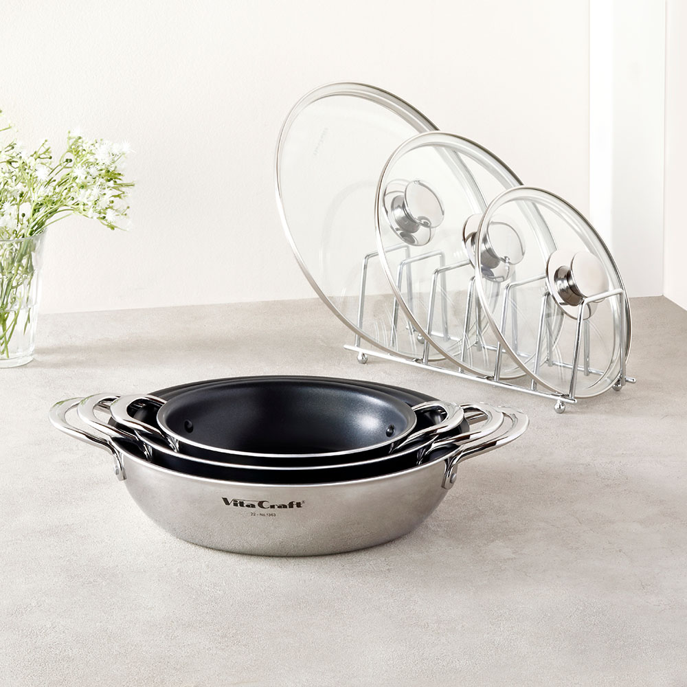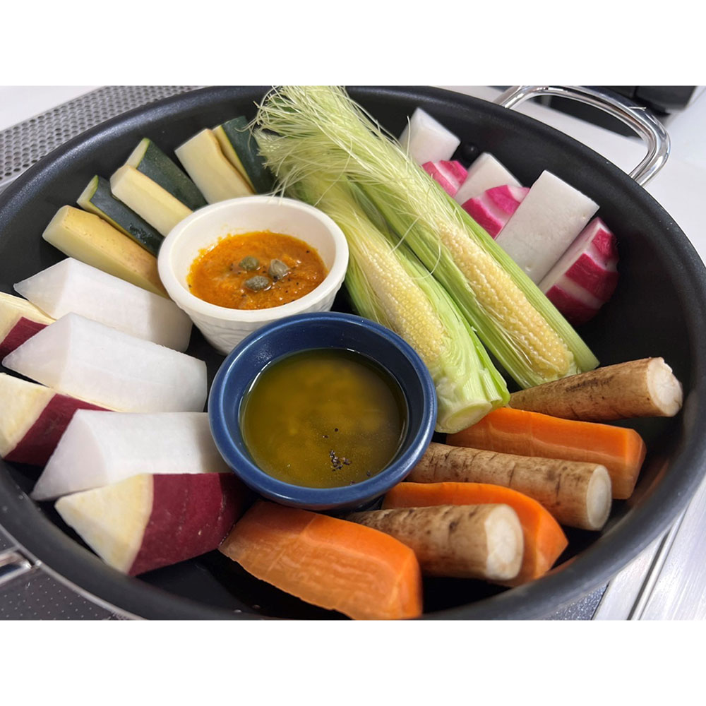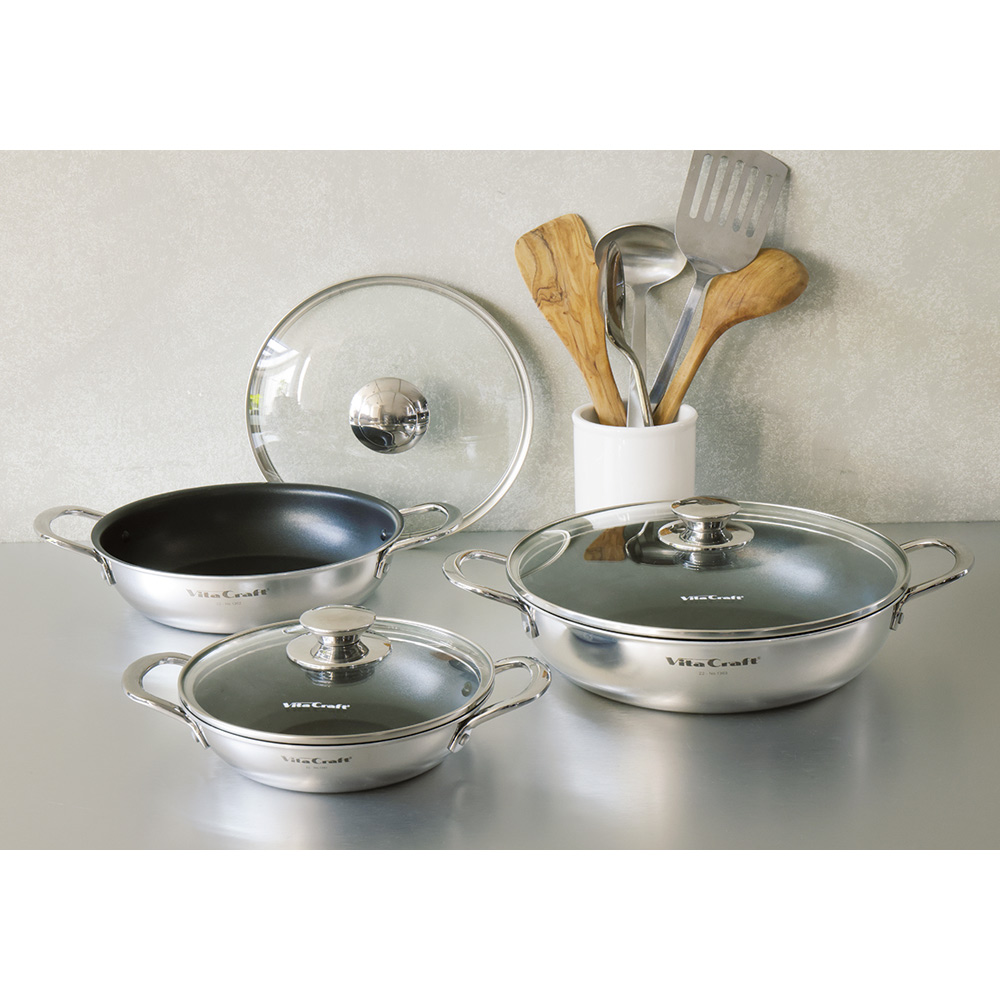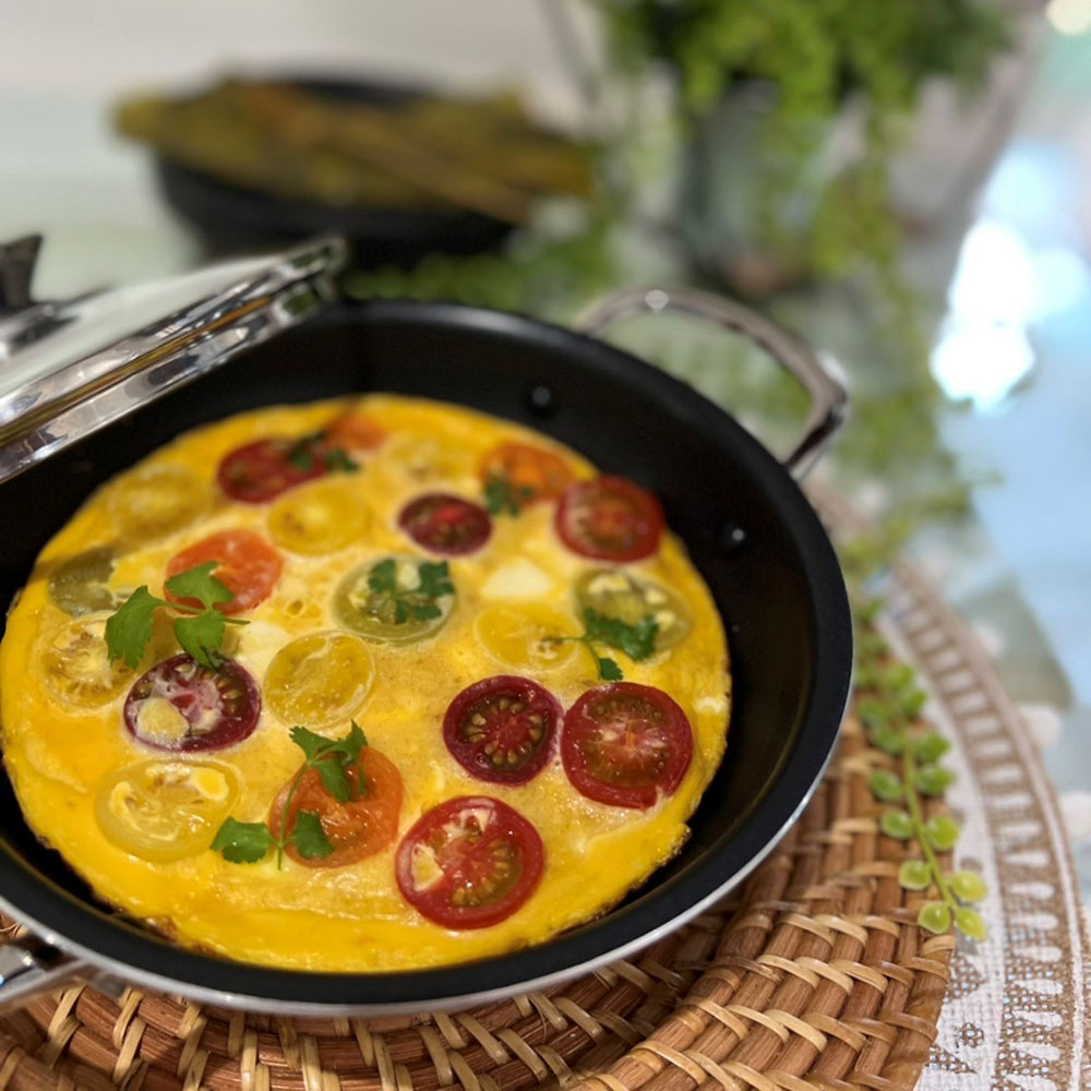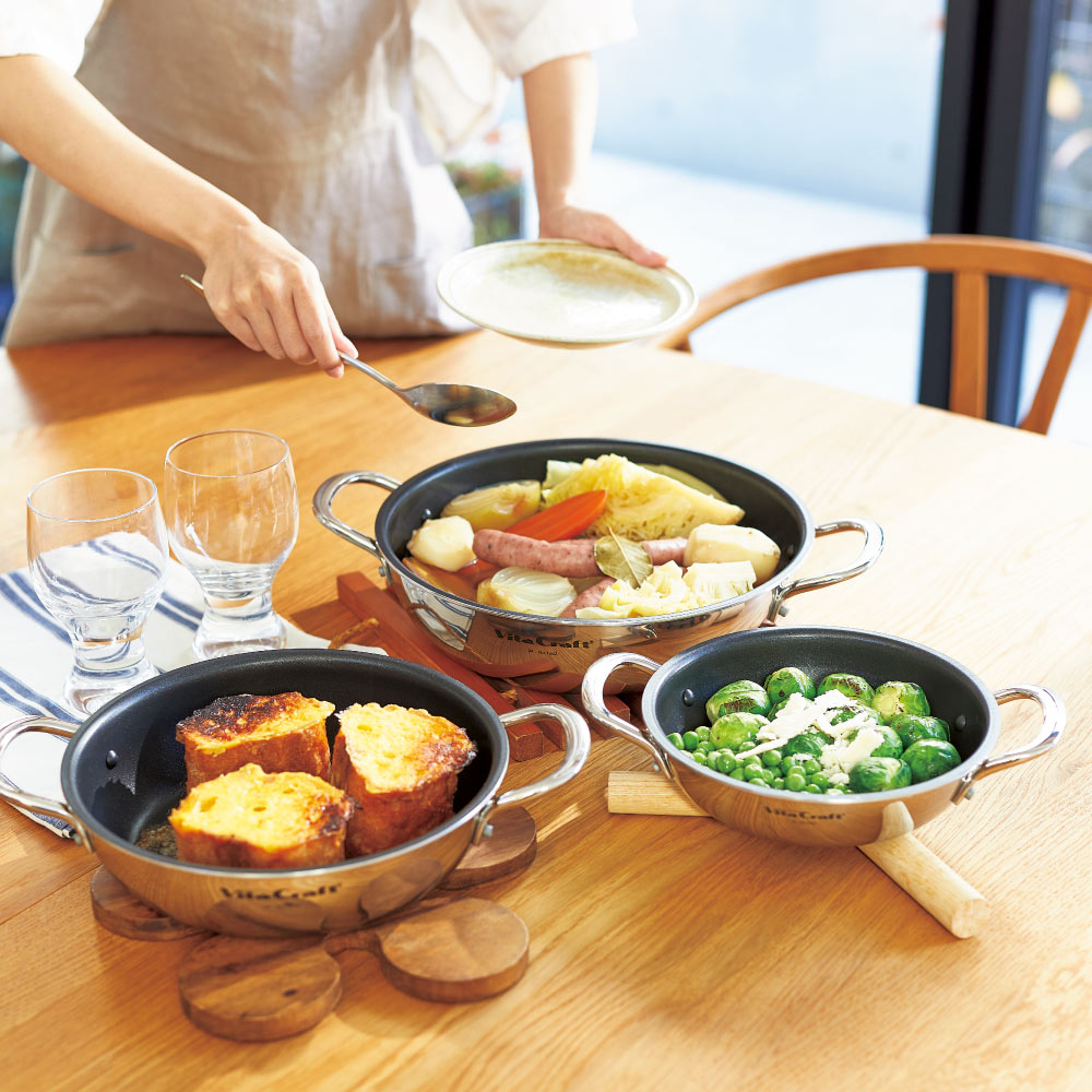 作りたてをそのまま食卓へ使いやすさで人気の両手フライパン両手フライパン、使ってみると便利さに驚きます!全面2層構造でムラなく火を通す、両手タイプが登場!フライパンは持っているけど、両手フライパンは持っていない、という方多いのではないでしょうか?使ってみると驚くほど便利です!ハンドルが短いので収納に便利、調理中にコンロの上で邪魔にならない、そして一番のポイントは…作ってそのままテーブルに出せる!こと。フライパンをそのままテーブルに出すのは抵抗がありますが、こちらならそのままテーブルに出してもとっても素敵!だからその名も「テーブルパン」。食卓でアツアツを頂けるのはもちろん、洗い物が減ることが一番嬉しい!いつもの野菜炒めや目玉焼きもこちらで出すと一気にお洒落に見えますよ!耐摩耗性200万回の高性能フッ素コートはさすがビタクラフトオキツモ社の最高峰の性能を誇るマキシプリムスという3層スーパーハードコートで焦げつきを防止します。もちろんPFOA(水溶性界面活性剤)は不使用です!金属ヘラ試験200万回をクリアしているので焦げ付きにくくストレスフリーです。使いやすい絶妙な深さ絶妙な深さで、素材が重なりにくく炒めものやソテーがラクにできます。野菜やチャーハンも食材が重ならず炒められるから火の通りも早く、シャキシャキ・パラりと仕上がります。それでいて炊飯もできる深さがあるのでパエリアや鯛めし、ビビンパなどご飯料理も楽しめます。ガラスふたでいろいろな料理ができる!シーフードたっぷりのパエリアや丸ごと一匹の煮魚、お店のような円盤餃子も一気に焼けます!蓋があるだけで料理の幅がぐーんと広がります。炊飯目安:【18cm】=1カップ(炊飯方法は同梱されるレシピに掲載しています)卓上ガスコンロにのせて使っても◎鍋物、すき焼きがおいしい季節に大活躍。食卓でアツアツを食べられます。卓上IH調理器でも使用できます。オーブンやトースターでも使用できます。グラタンやキッシュなどのオーブン料理もOK!18cmならトースターにも入るサイズ。※ガラスふたは外してください。