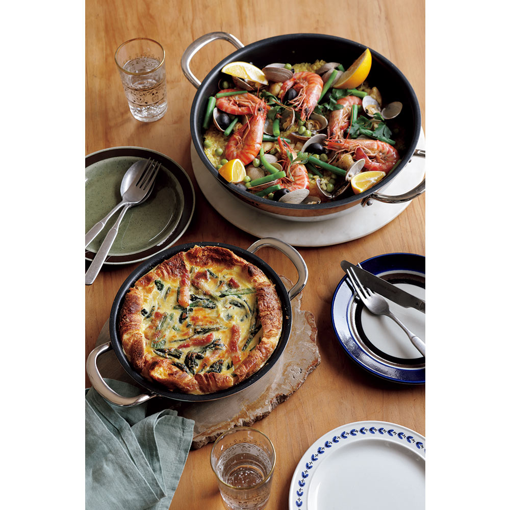 写真は26cmです。パエリアや煮魚、餃子にもピッタリ。料理の幅が広がります。炊飯目安:18cm=1カップ22cm=3カップ 26cm=4カップ