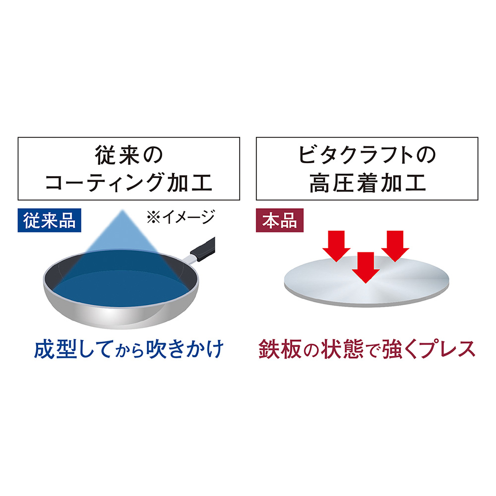 高級キッチンブランド「ビタクラフト」の“リアルに使える”4点セット。55年分の感謝を込めて、通常価格単品合計から55%オフのジャスト1万円でお届けします!高級キッチンブランド「ビタクラフト」の“リアルに使える”4点セット朝食やお弁当づくりなど毎日の料理に出番の多い20cmと、大量の炒め物や煮物にも重宝な24cmの深型。とことん使える2つのフライパンに、専用の蒸し板とステンレスふたをプラスすることで、今話題の蒸し料理や、無水調理まで可能になりました。メーカー1年保証のコーティングフッ素加工にも様々な方法があり、品質にも違いがあります。ビタクラフトのアメリアシリーズは、成型する前の鉄板の段階で強力にプレスしてフッ素の密着力を高める高熱圧着法を採用。だから、表面が驚くほどツルツルとして快適に使える上に、こびりつきにくさが長持ち。なんと300万回の耐久性テストもクリアしています。ワンランク上の味を実現する全面2層構造ぜひ試して欲しいのがハンバーグ。熱伝導率の高いアルミニウム×蓄熱性の高いステンレスの贅沢な全面2層構造が、美しい均一な焼き目と、ふっくらジューシーな焼き上がりを実現。ナイフを入れた瞬間あふれる肉汁に、料理の腕前が一気に上がった気分に。24cm深型+ステンレスふたでつくる、みんな大好き無水カレー本体をふたは、調理中にできる水の膜でぴたっと密着する構造。内部の気密性が高まることで、野菜の水分だけでつくる無水カレーも簡単にできます。肉や野菜本来の味わいが、ぎゅっと詰まった濃厚でコク深い無水カレーのおいしさは、一度食べたらやみつきに。毎日使うフライパンで蒸し料理ができる幸せ24cm深型フライパンに蒸し板をセットするだけで、ヘルシーな、蒸し料理も簡単。気密性の高いステンレスふたが蒸気をしっかり閉じ込めて、夏野菜も手早くごちそうに。通常価格単品合計から55%オフ!55年分の感謝を込めて、通常価格単品合計から55%オフのジャスト1万円でお届けします!