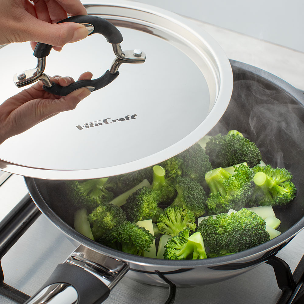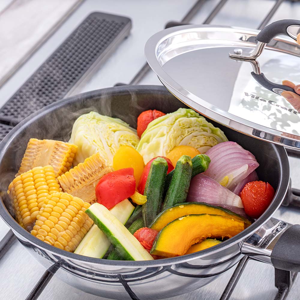 ステンレスふたを使えば、少量の水分で無水調理が可能