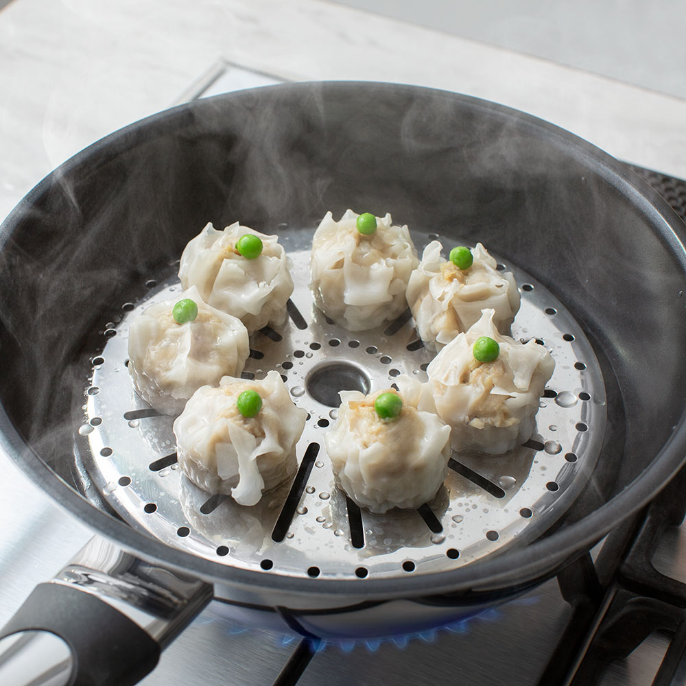 全面2層構造の20cmと24cmの深型フライパンに、料理の幅が広がる専用蒸し板とステンレスふたをセット。