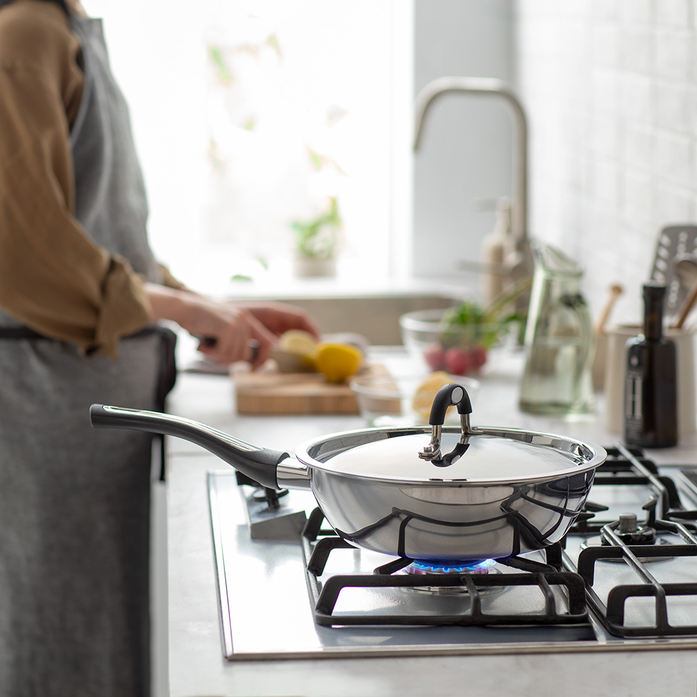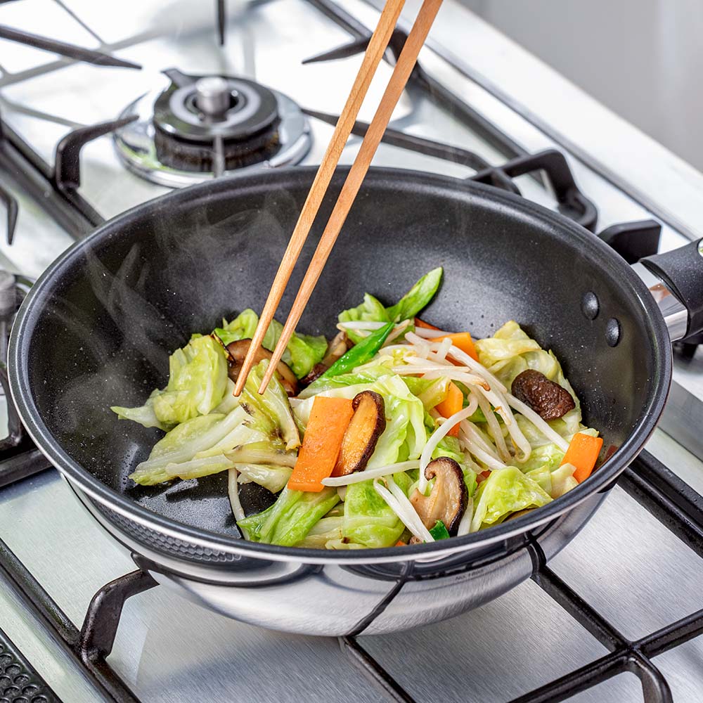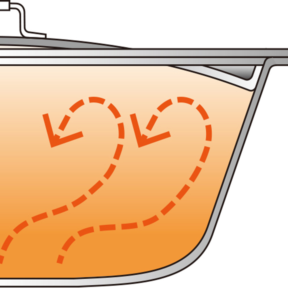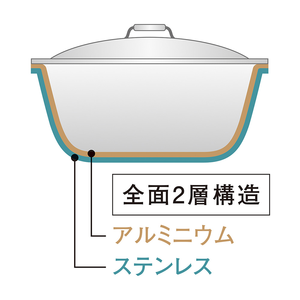 熱伝導率の高いアルミニウム×蓄熱性に優れたステンレスの贅沢な全面2層構造が、食材の旨みを引き出します。