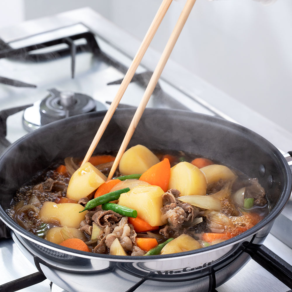 肉じゃがや筑前煮などの炒め煮もフライパンひとつで。