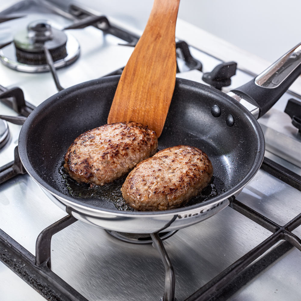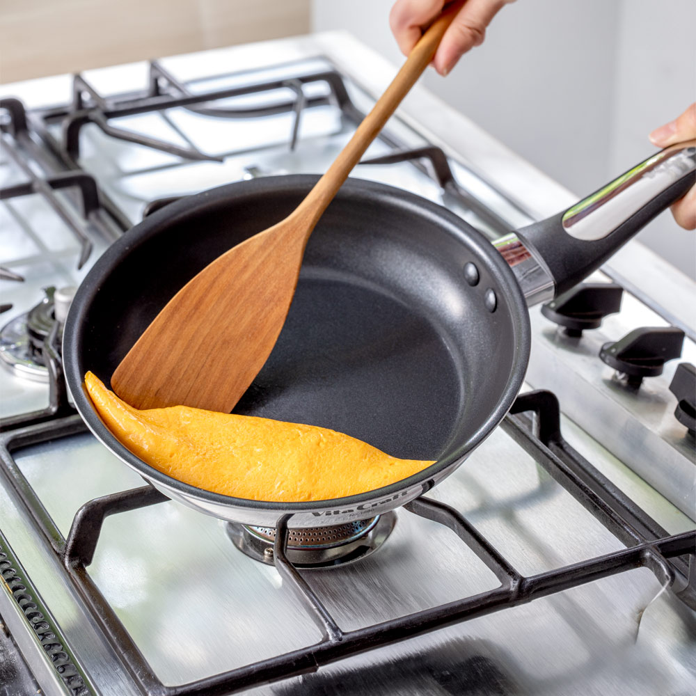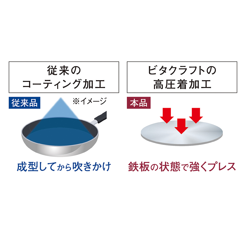 高級キッチンブランド「ビタクラフト」の20cmフライパン。高熱圧着法でツルツルのコーティングが長持ちします。メーカー1年保証のコーティングフッ素加工にも様々な方法があり、品質にも違いがあります。ビタクラフトのアメリアシリーズは、成型する前の鉄板の段階で強力にプレスしてフッ素の密着力を高める高熱圧着法を採用。だから、表面が驚くほどツルツルとして快適に使える上に、こびりつきにくさが長持ち。なんと300万回の耐久性テストもクリアしています。ワンランク上の味を実現する全面2層構造ぜひ試して欲しいのがハンバーグ。熱伝導率の高いアルミニウム×蓄熱性の高いステンレスの贅沢な全面2層構造が、美しい均一な焼き目と、ふっくらジューシーな焼き上がりを実現。ナイフを入れた瞬間あふれる肉汁に、料理の腕前が一気に上がった気分に。