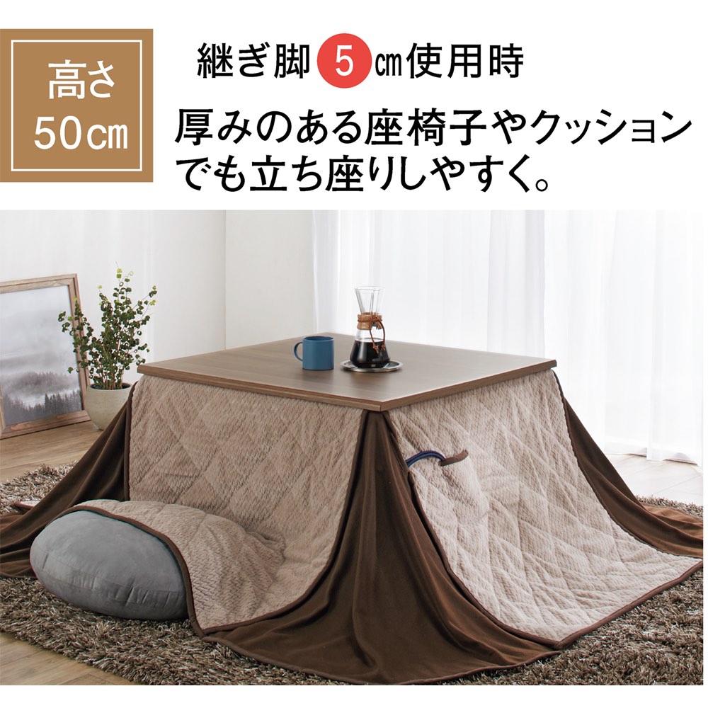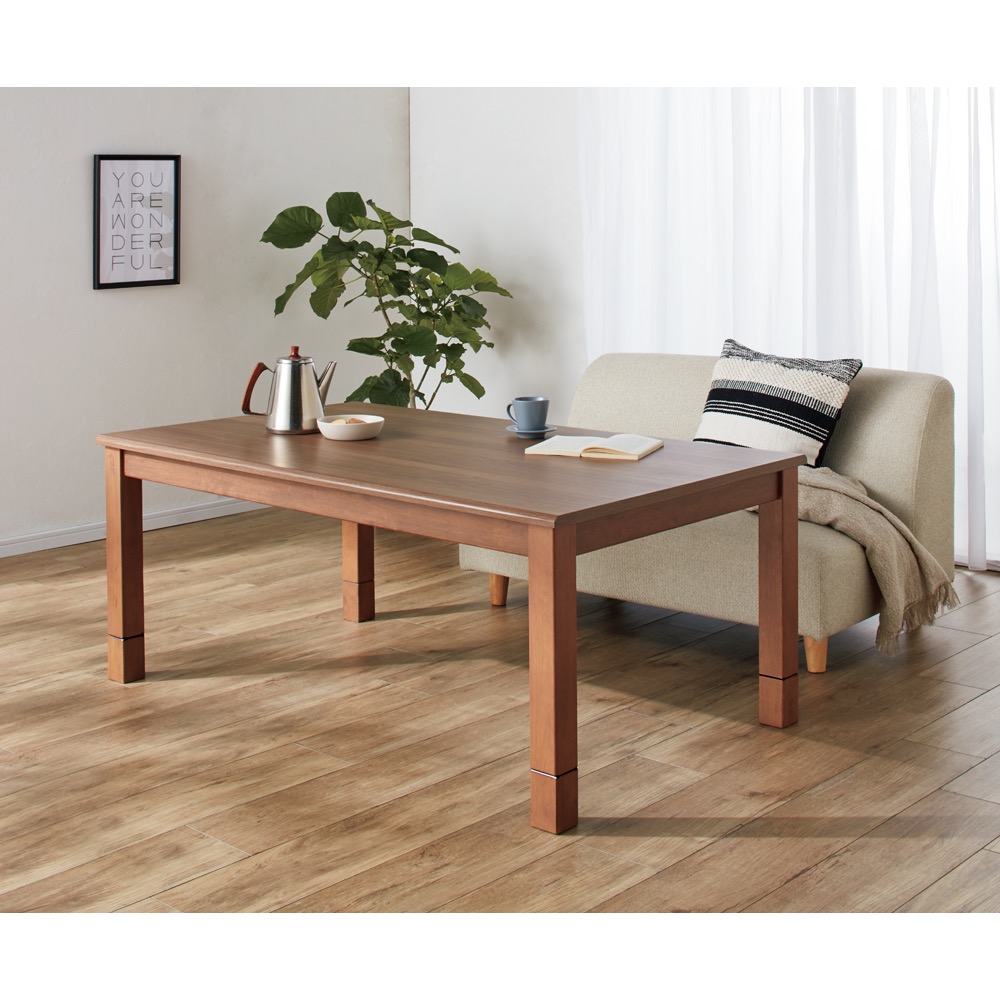 こたつ機能を備えたモダンなダイニングでオールシーズン快適に。高さを変えて、座卓からダイニングテーブルまで、6通り高さのこたつ生活ができます。モダンな内装に馴染みつつ、サッと拭けてお手入れ簡単なメラミン天板を採用。手元で温度調節できる手元コントローラー式。省エネになると話題のこたつで電気代を賢く節電しましょう。熱や傷に強い、モダンなメラミン天板汚れてもサッと拭きとれてお手入れ簡単なメラミン天板を採用。冬以外もオールシーズン毎日使っていただきやすいよう、使い勝手にもこだわりました。モダンな内装に馴染むカラーで北欧スタイルやシンプルモダンなリビングにもおすすめです。イスに座って使えるこたつテーブルイスの高さに合わせて高さ調節できるこたつテーブル。別売りの回転チェアとの組合せで、立ち座りしやすいリビングダイニングが実現。デスクの姿勢で使えるこたつは、テレワークや趣味の作業にもおすすめです。6段階の高さ調節付属の継ぎ脚を組み合わせることで、テーブルの高さを6段階に調節できます。テーブルの高さは45・50・55・60・65・70cmに。(テーブル下高さは左記マイナス9cm)文机からリビングテーブル、ダイニングテーブルとお好みの使い方ができます。こたつテーブルでも一年中使えますこたつ布団を外せばダイニングテーブルとしてお使いいただけます。天板は専用ボルトで固定できます(布団使用時は固定できません)。冬だけでなく、夏場もダイニングやデスクとして使える便利なテーブルです。身体の芯から温まる石英管ヒーターを採用!熱伝導率の高い《遠赤外線》の効果で 体を芯から、ポカポカとあたためてくれます。また暖かさを手元で調節できる手元電子コントローラー式で気軽に温度調節が可能です。
