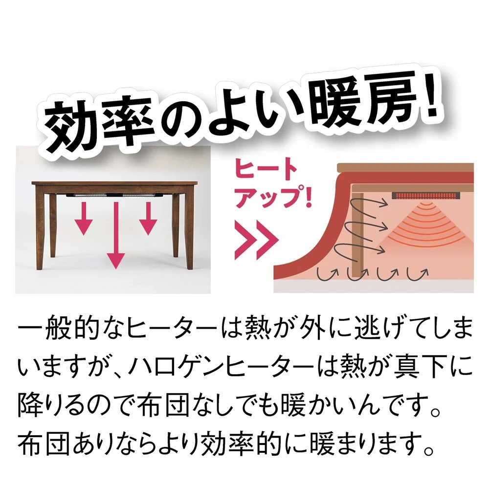 一般的なヒーターは熱が外に逃げてしまいますが、ハロゲンヒーターは熱が真下に降りるので熱が逃げにくく、より効率的に暖まります。